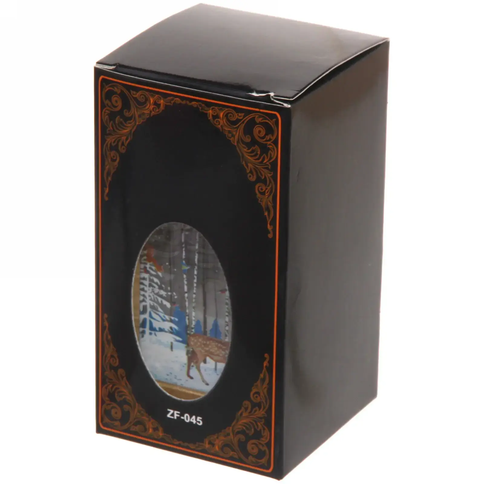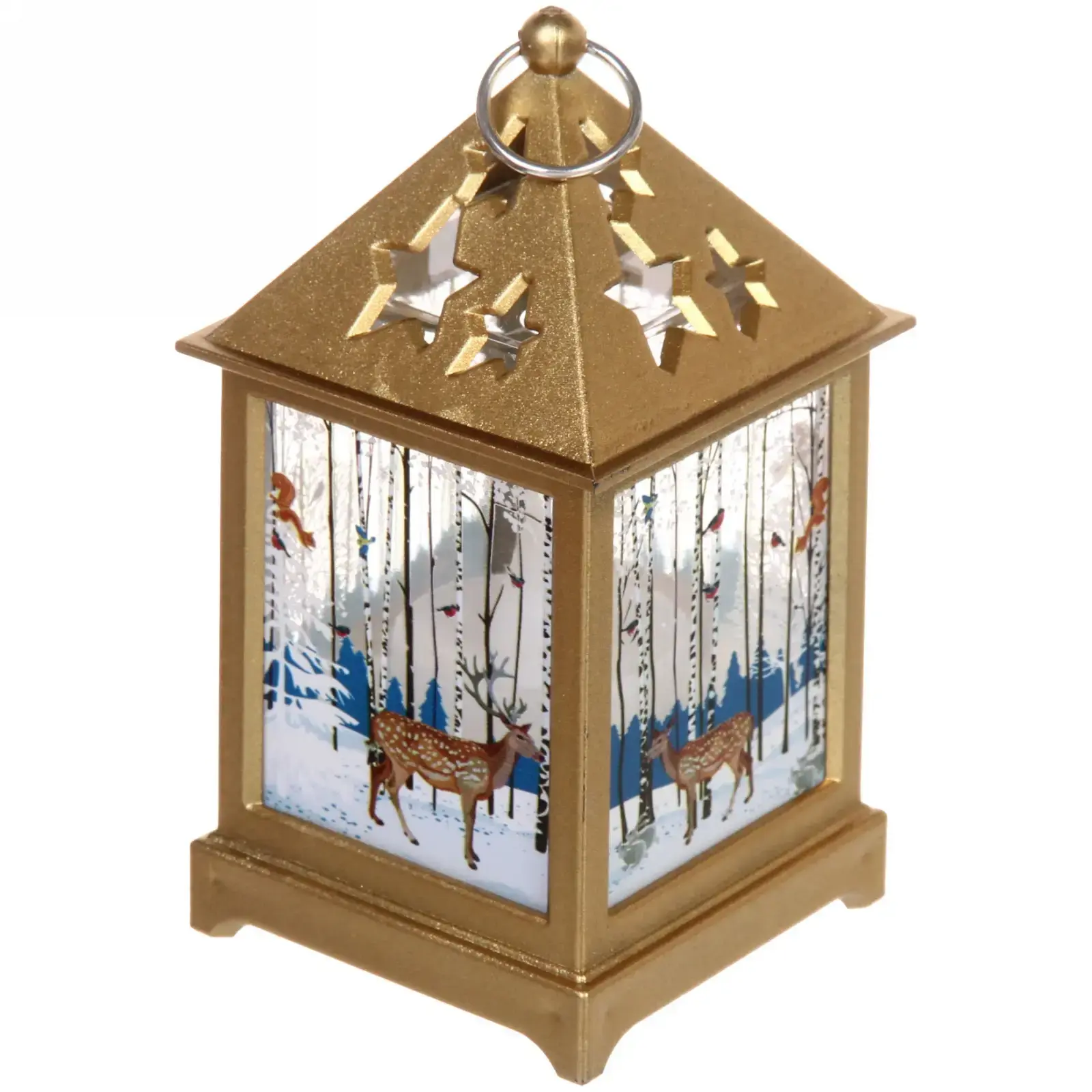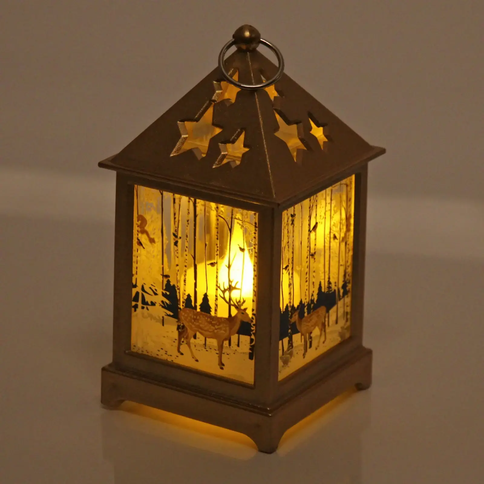 Фонарь выполнен в форме домика с четырехугольной крышей и украшен вырезанными узорами, изображающими зимний лес и оленей. Он идеально подходит для создания новогоднего настроения, а также может использоваться в качестве стильного элемента декора в любое время года. Установите его на столе, полке или используйте для создания уютного освещения в спальне или гостиной.