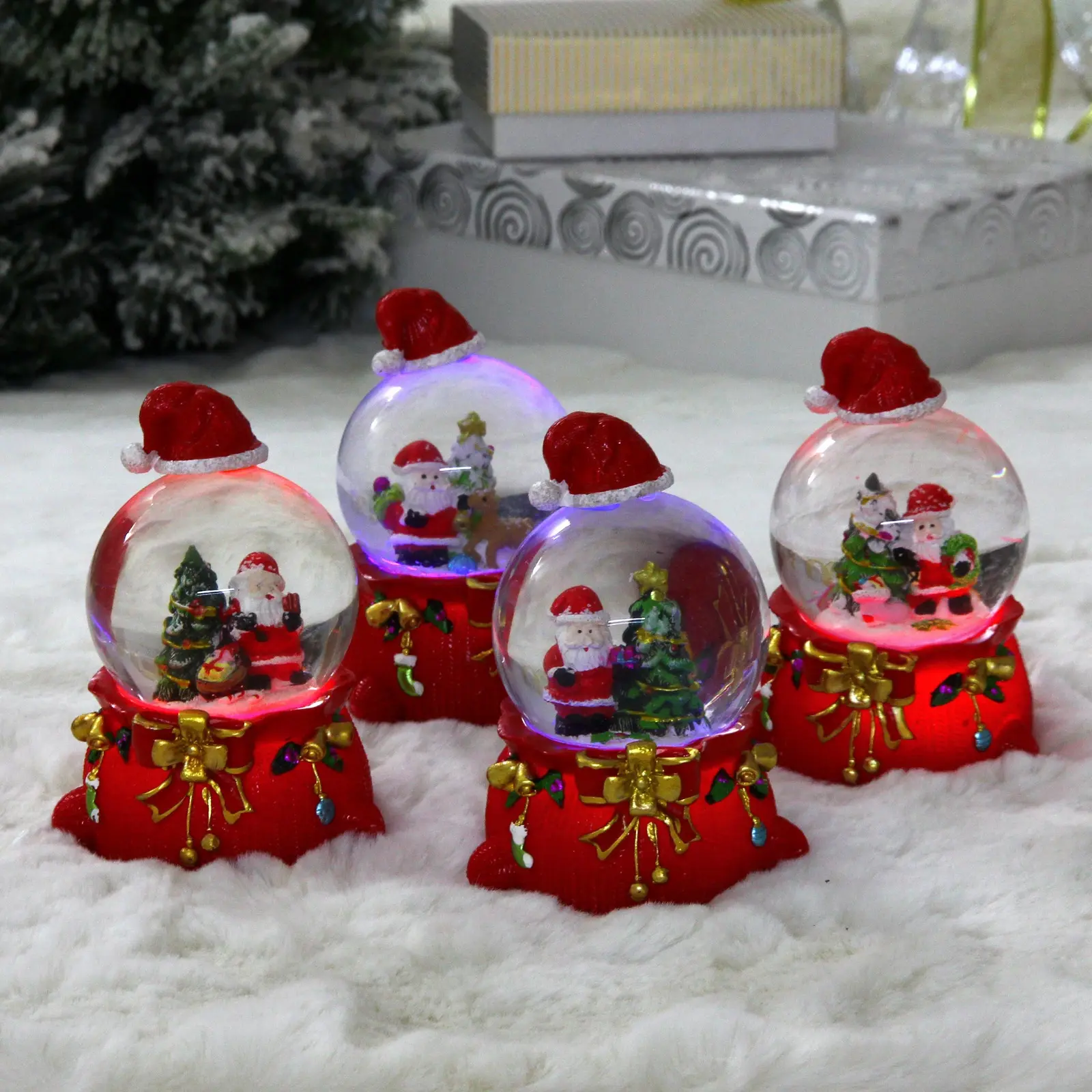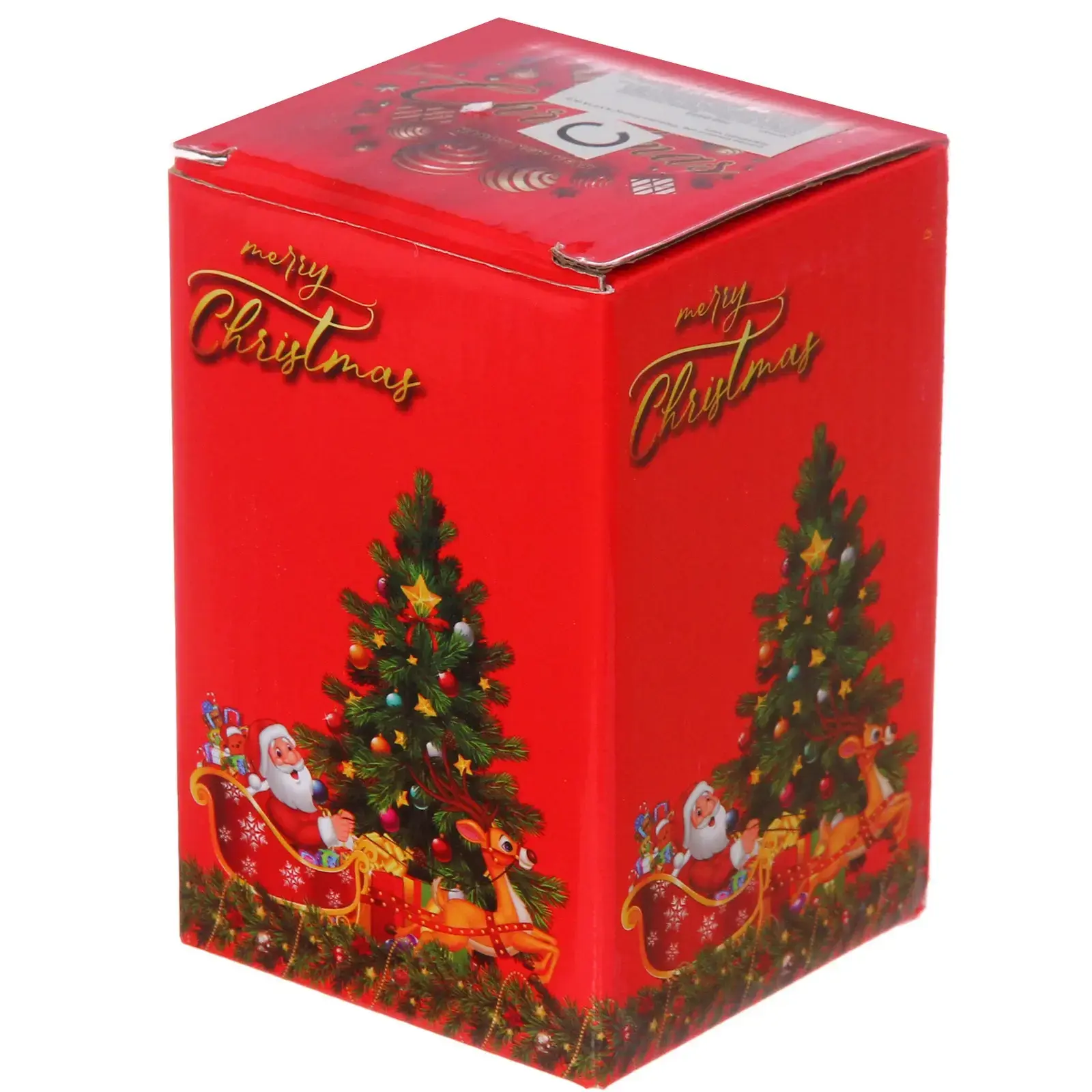 Размеры: высота 6.5 см, диаметр 7 см, общая высота 13 см с основанием. Материал: полистоун и стекло, декоративная красная подставка с золотыми и зелёными элементами. Подсветка работает от батареек (в комплекте) и имеет несколько режимов смены цвета.
