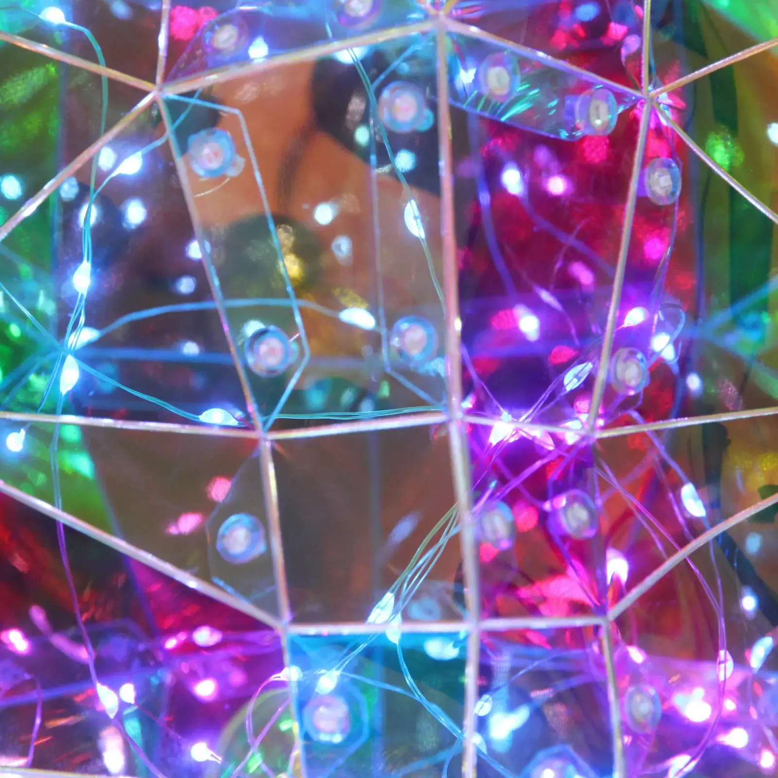 Геометрическая форма с гранеными поверхностями создает сложные световые эффекты — переливы оттенков меняются в зависимости от угла обзора. Белый корпус служит нейтральным фоном для цветной подсветки, гармонируя с любым стилем интерьера.
