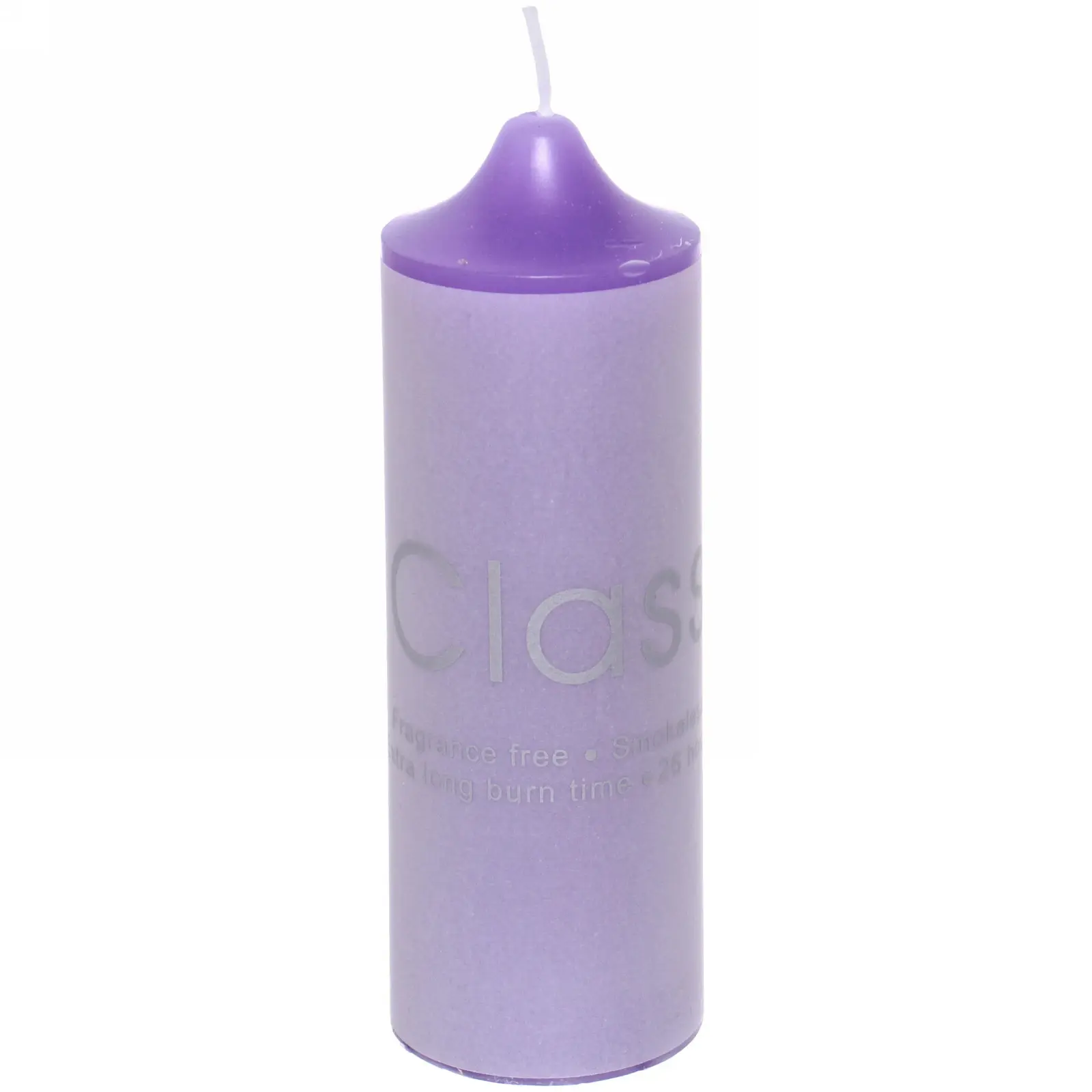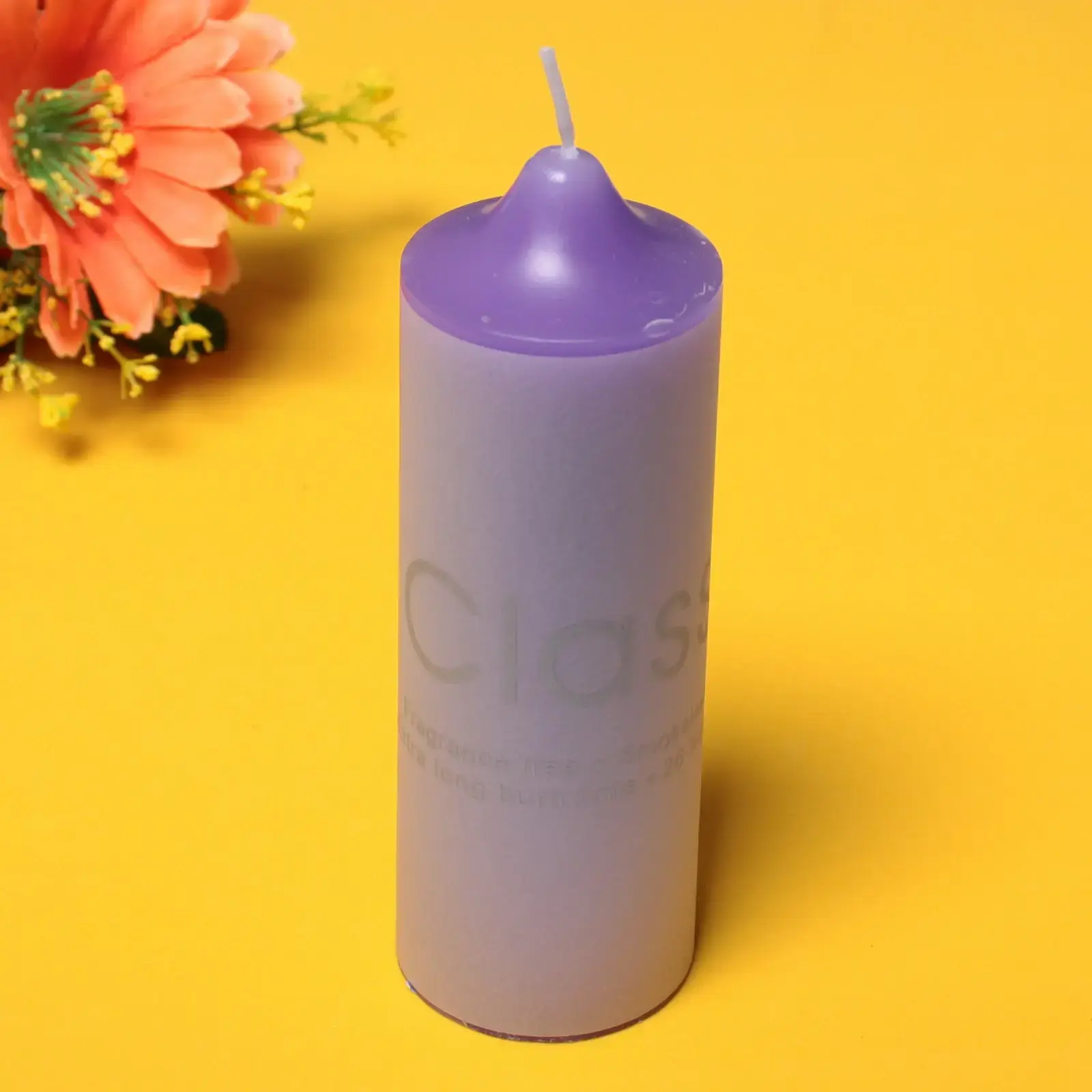 Размер: 5×15 см. Форма — классический цилиндр с куполообразной верхушкой, что придает изделию завершенный и аккуратный вид. Приблизительное время горения — до 26 часов, что делает свечу экономичным и долговечным элементом декора. Изготовлена из воска, устойчивого к растрескиванию. Отгружается один товар, цвет — лавандовый.