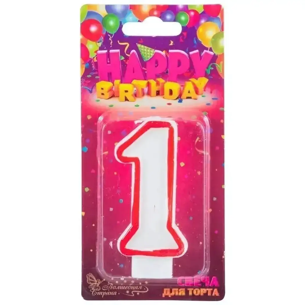 Свеча для торта цифра 1, белая с красным контуром, праздничный дизайн в пластиковой упаковке