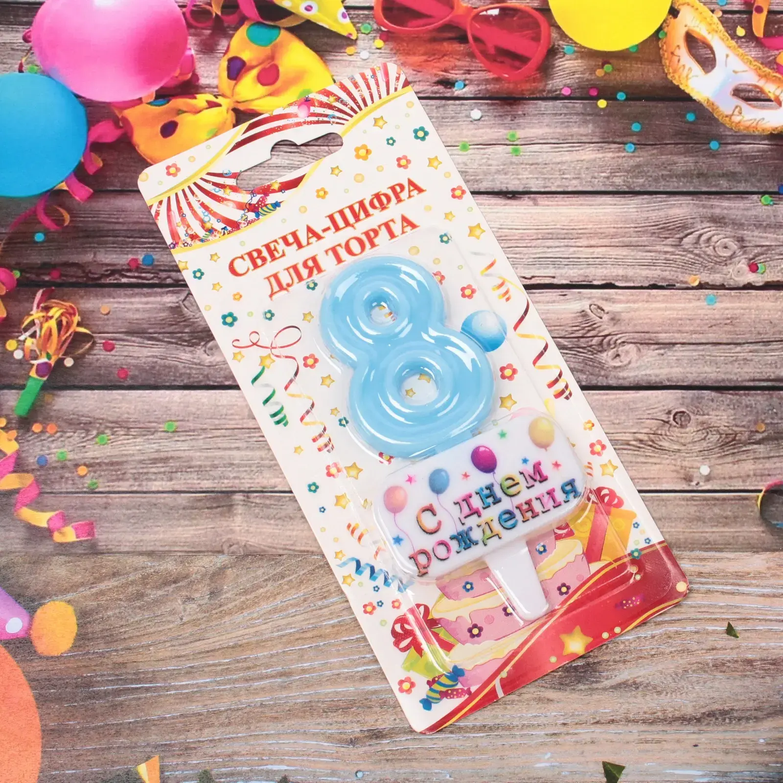 Размер свечи составляет 5,5х4 см, что делает ее стандартной для большинства тортов. Она оформлена в виде цифры «8», что идеально подходит для празднования дня рождения, связанного с этой цифрой. Праздничная упаковка с яркими элементами, такими как звездочки и воздушные шарики, добавляет дополнительный шарм и делает ее отличным подарком.