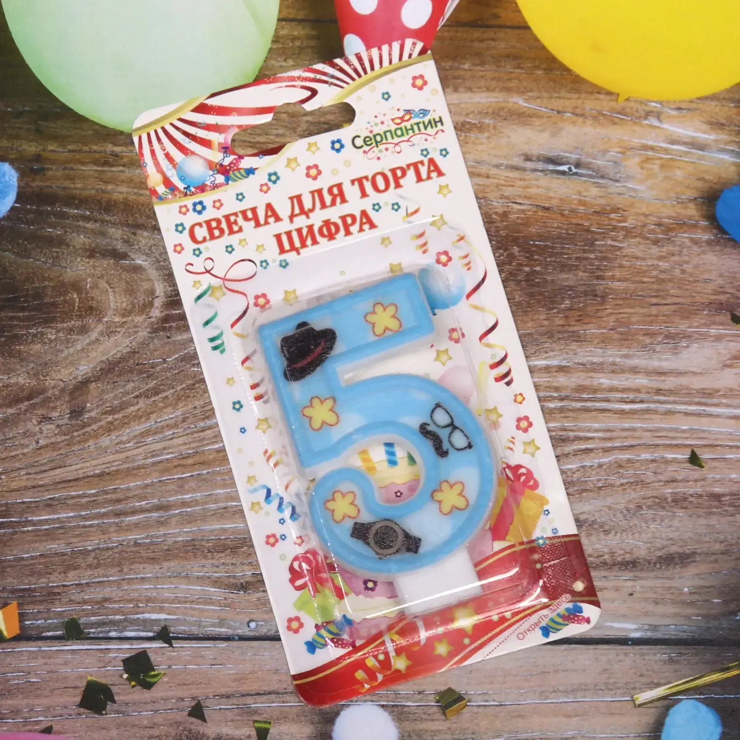 Свеча для торта в форме цифры 5 — это идеальный способ добавить яркие акценты к вашему празднику. Она выполнена в голубом цвете и украшена веселыми элементами, такими как цветочки, шляпа и очки, что делает её не только красивой, но и оригинальной. Эта свеча станет настоящим украшением любого торта и создаст атмосферу радости и веселья.