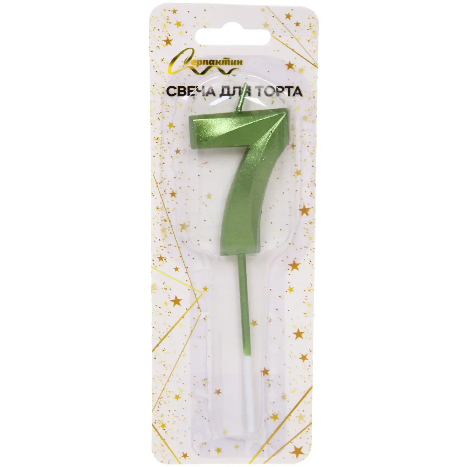 Размер свечи составляет 12 см, что делает её заметной на любом торте. Зеленый цвет и блестящая поверхность привлекают внимание и создают праздничное настроение. Упаковка украшена золотыми звездами, что добавляет дополнительный шарм. Не забывайте следить за горящей свечой и не оставляйте её без присмотра.