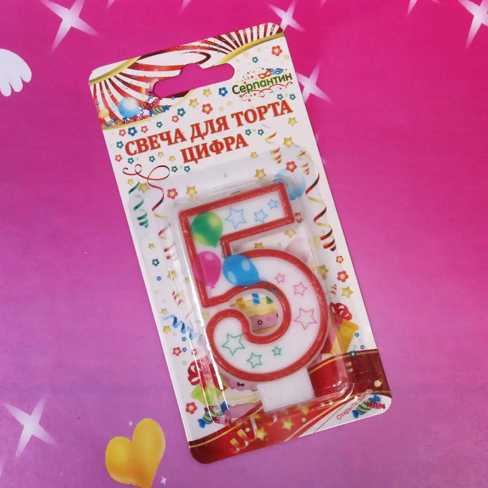 Создайте незабываемую атмосферу дня рождения с яркой свечой в форме цифры '5'. Её красно-белый дизайн с веселыми шарами и звездами станет идеальным акцентом на праздничном столе.