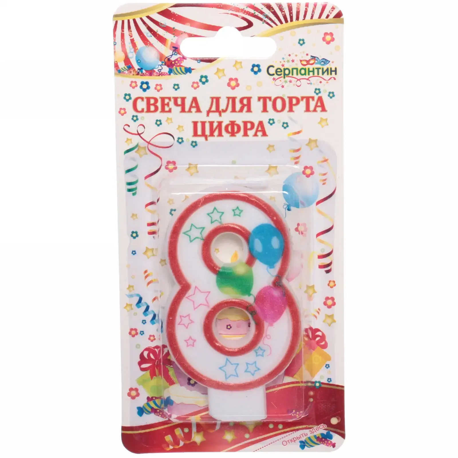 Размер свечи составляет 6 см, что делает её идеальной для стандартных тортов. Белый цвет с красной окантовкой придаёт ей стильный вид, а изображения шариков и звездочек добавляют игривости. Упаковка оформлена в праздничном стиле и включает инструкции по безопасному использованию. Не оставляйте зажженную свечу без присмотра и используйте её только в присутствии взрослых.