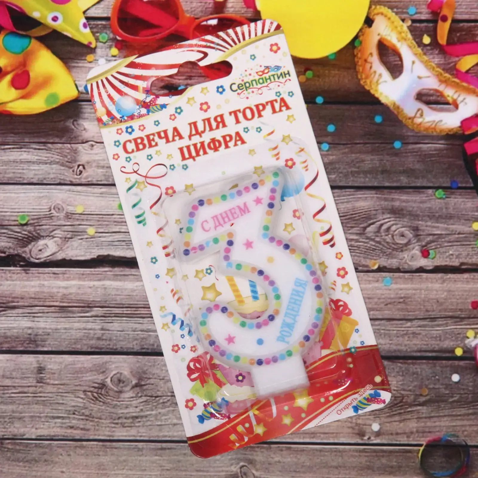 Свеча для торта цифра «Серпантин» «3», 6 см, белая с разноцветным декором, парафин