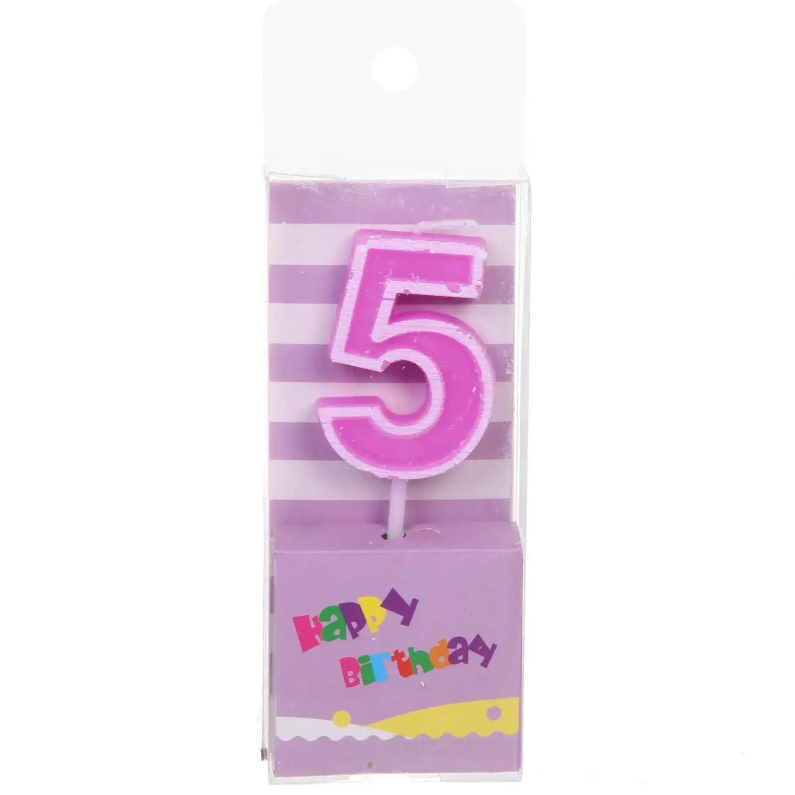 Размер свечи составляет 7,5 см, что делает ее идеальной для большинства тортов. Она оформлена в ярком розовом цвете и имеет округлые края, что добавляет ей привлекательности. Упаковка свечи также оформлена с элементами в полоску и надписью 'Happy Birthday', что делает ее отличным подарком для любого именинника.