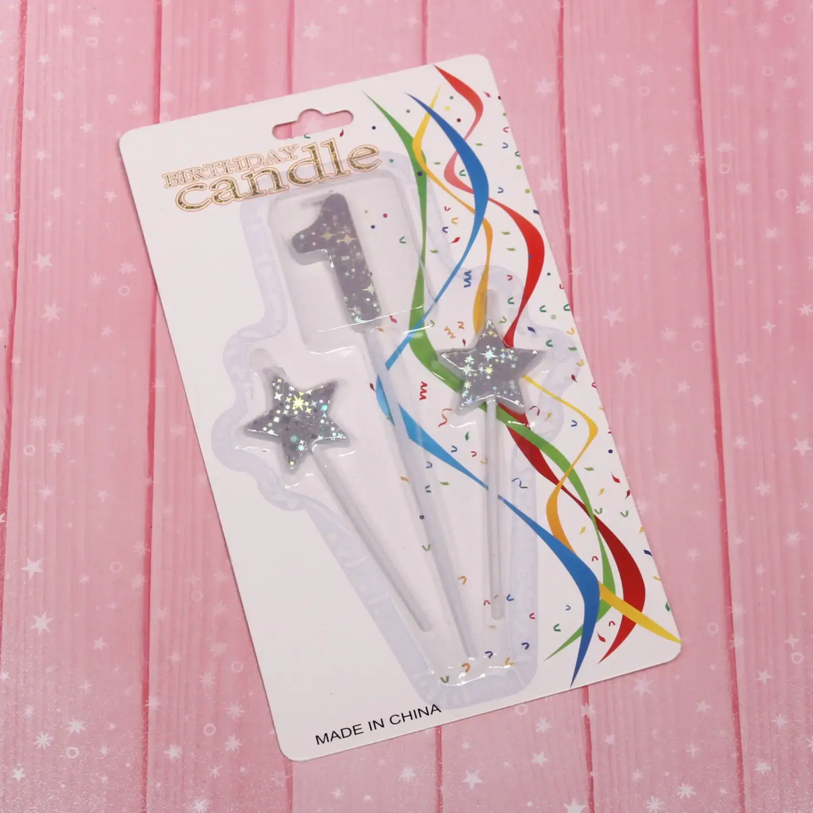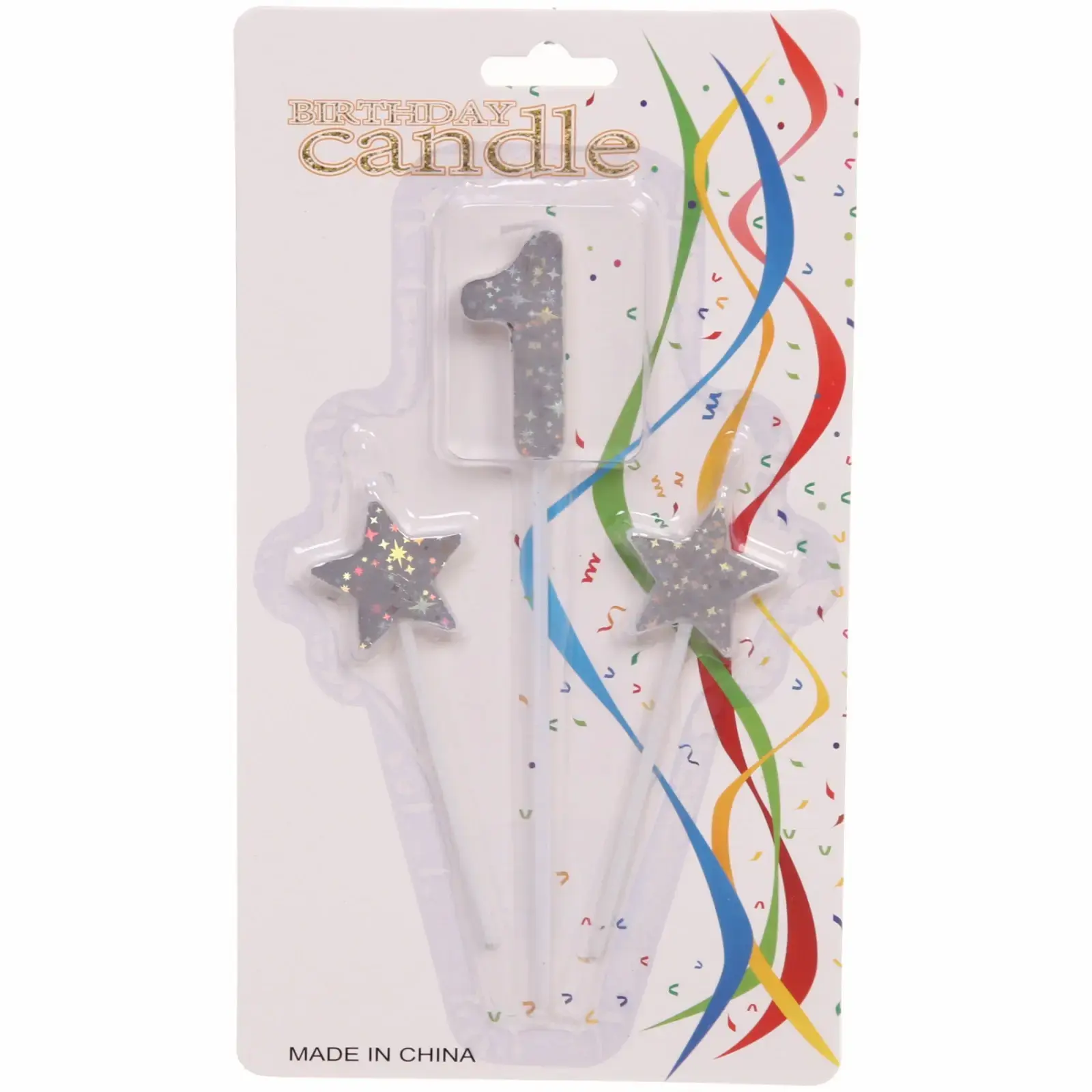 Размер свечи в форме цифры '1' составляет 16 см, а звезды имеют меньшие размеры, что делает их идеальными для сочетания. Серебристый цвет с блестками добавляет праздничного настроения и делает свечи центром внимания на любом столе. Упаковка оформлена в ярком стиле с элементами конфетти, что подчеркивает праздничный характер товара.