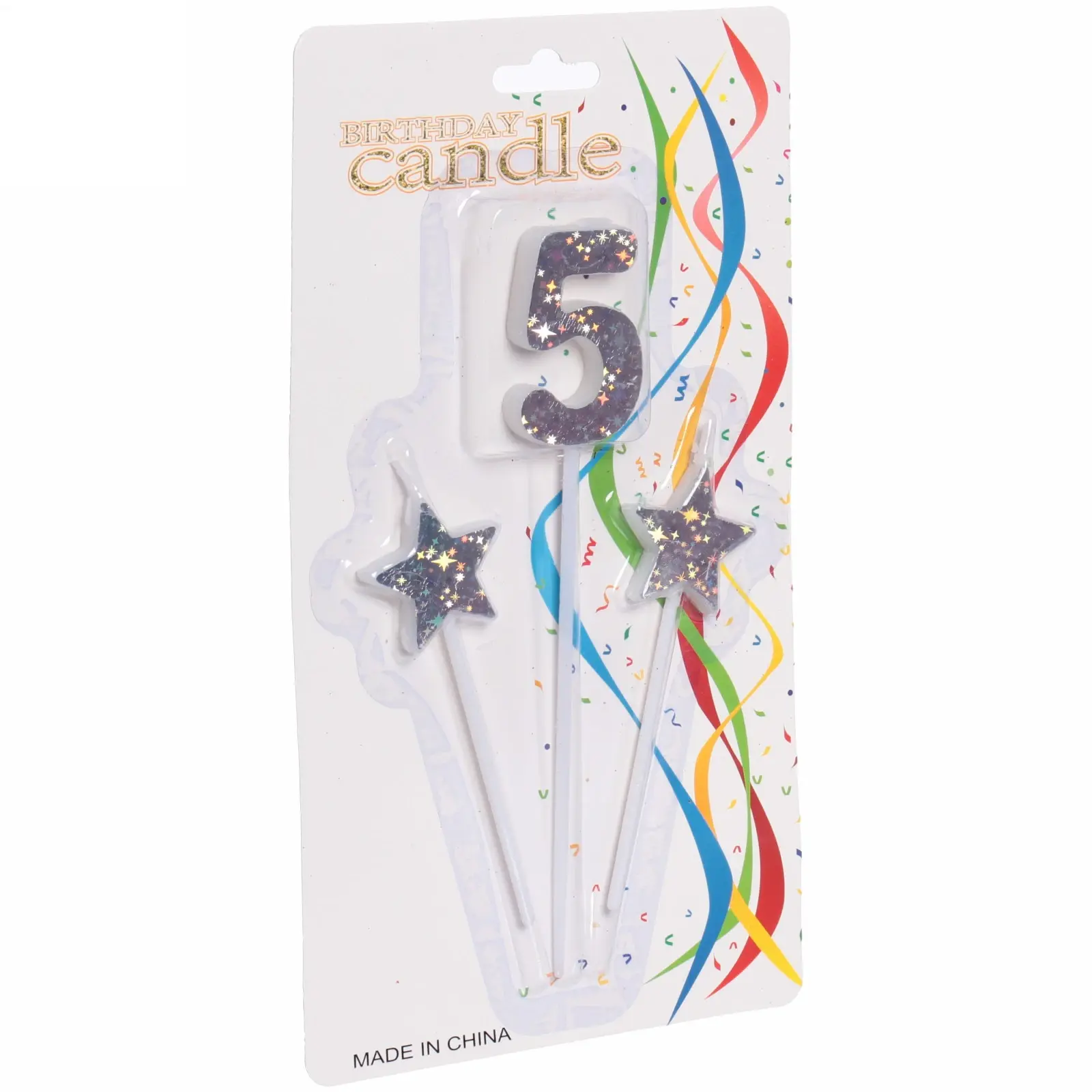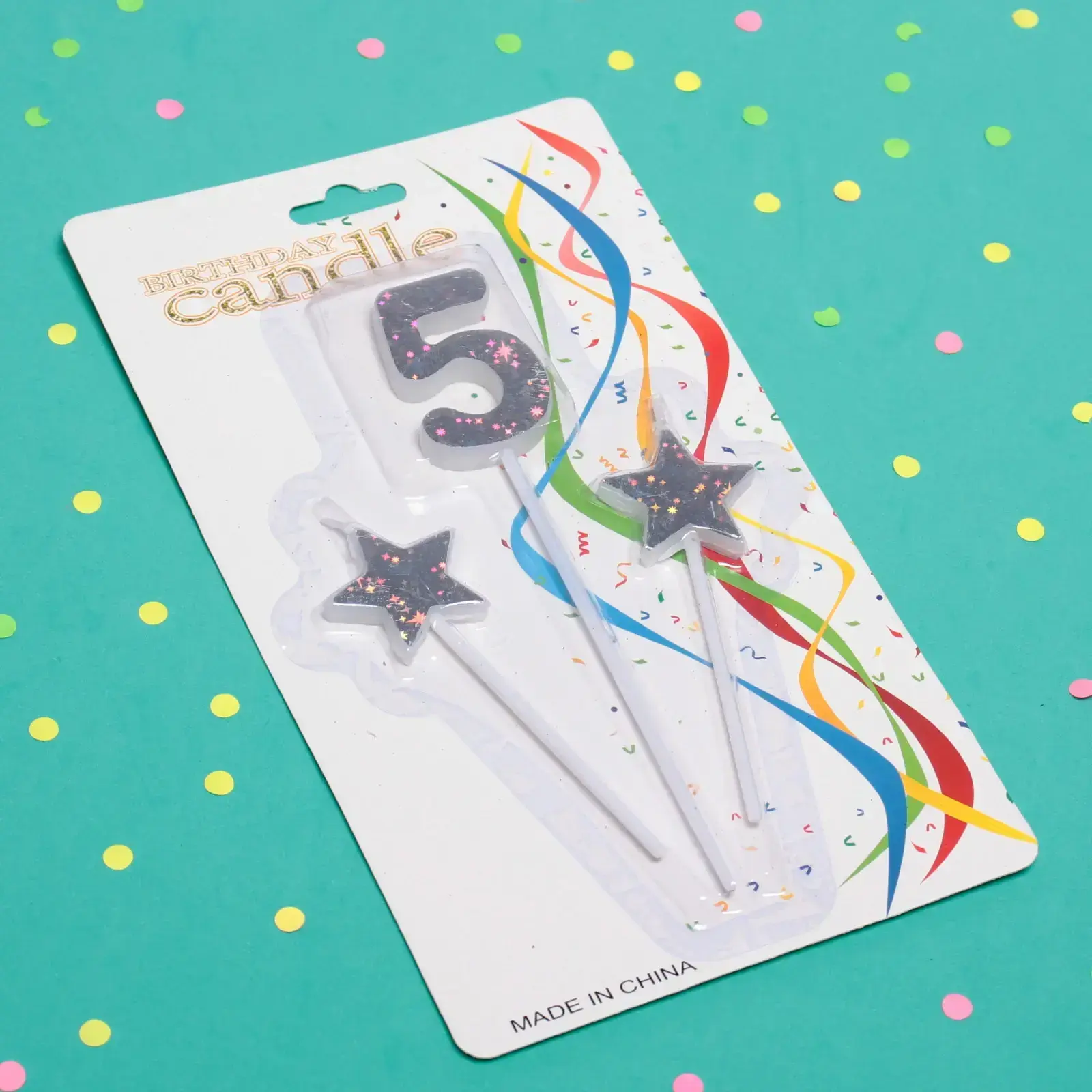 Размер свечи в форме цифры '5' составляет 16 см, а звёзды имеют стандартный размер, что делает их идеальными для любого торта. Все свечи выполнены из парафина и имеют блестящее покрытие, что придаёт им праздничный вид. Упаковка украшена яркими цветами и конфетти, что создаёт дополнительное настроение.