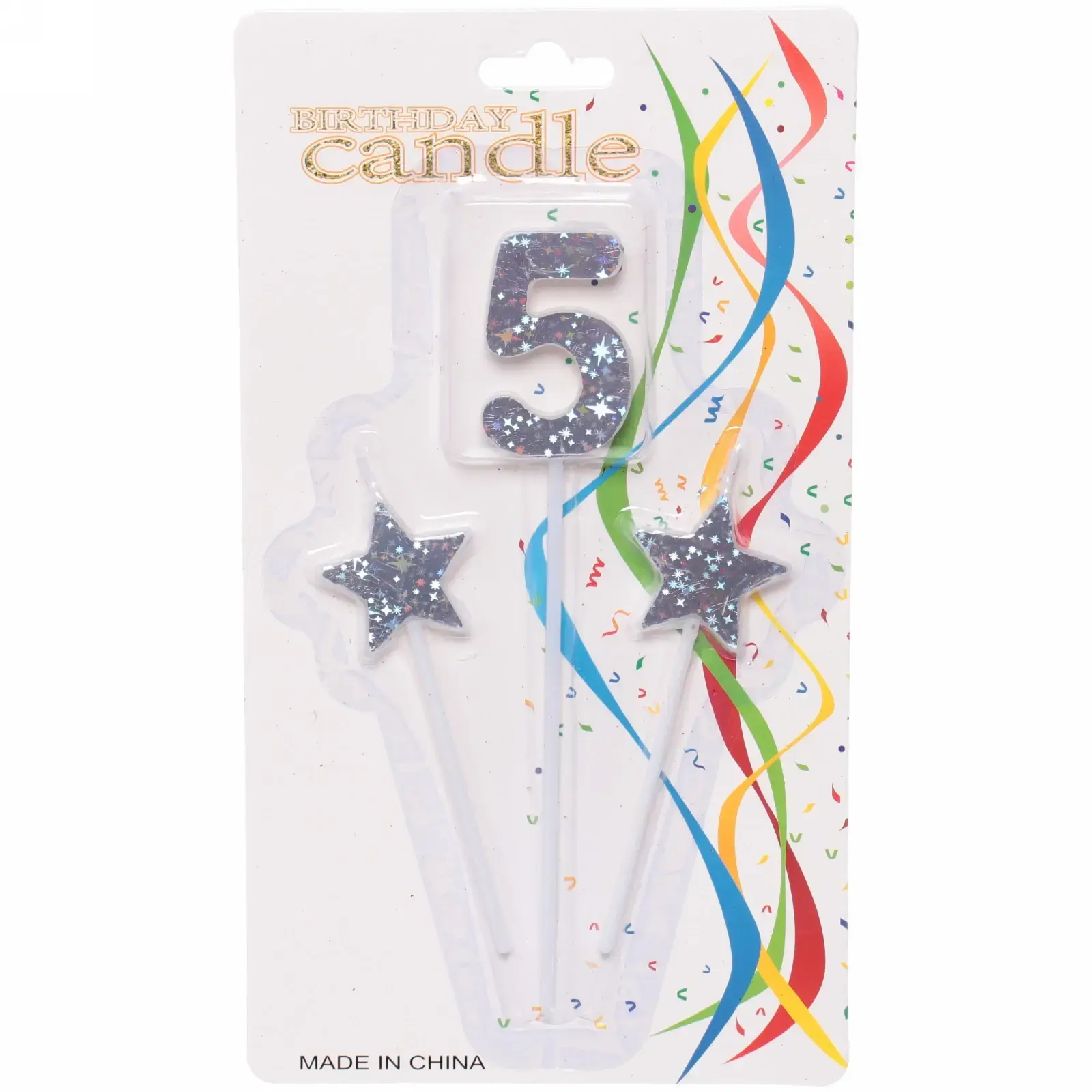Почему стоит выбрать именно эти свечи? Во-первых, их блестящий серебристый цвет и оригинальный дизайн привлекут внимание всех гостей. Во-вторых, они выполнены из качественного парафина, что гарантирует долгий и безопасный горение. Наконец, в наборе вы получаете три свечи: одну в форме цифры '5' и две в форме звёзд, что делает его универсальным для различных праздников.