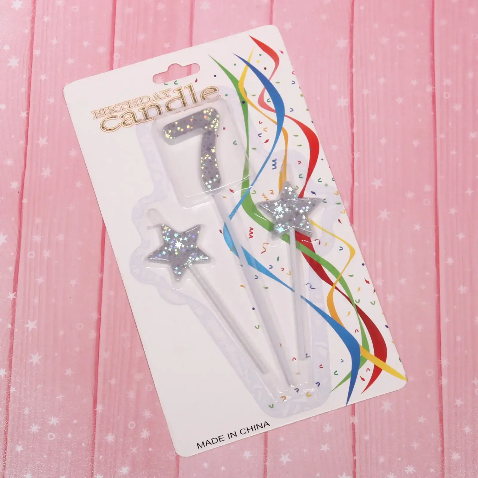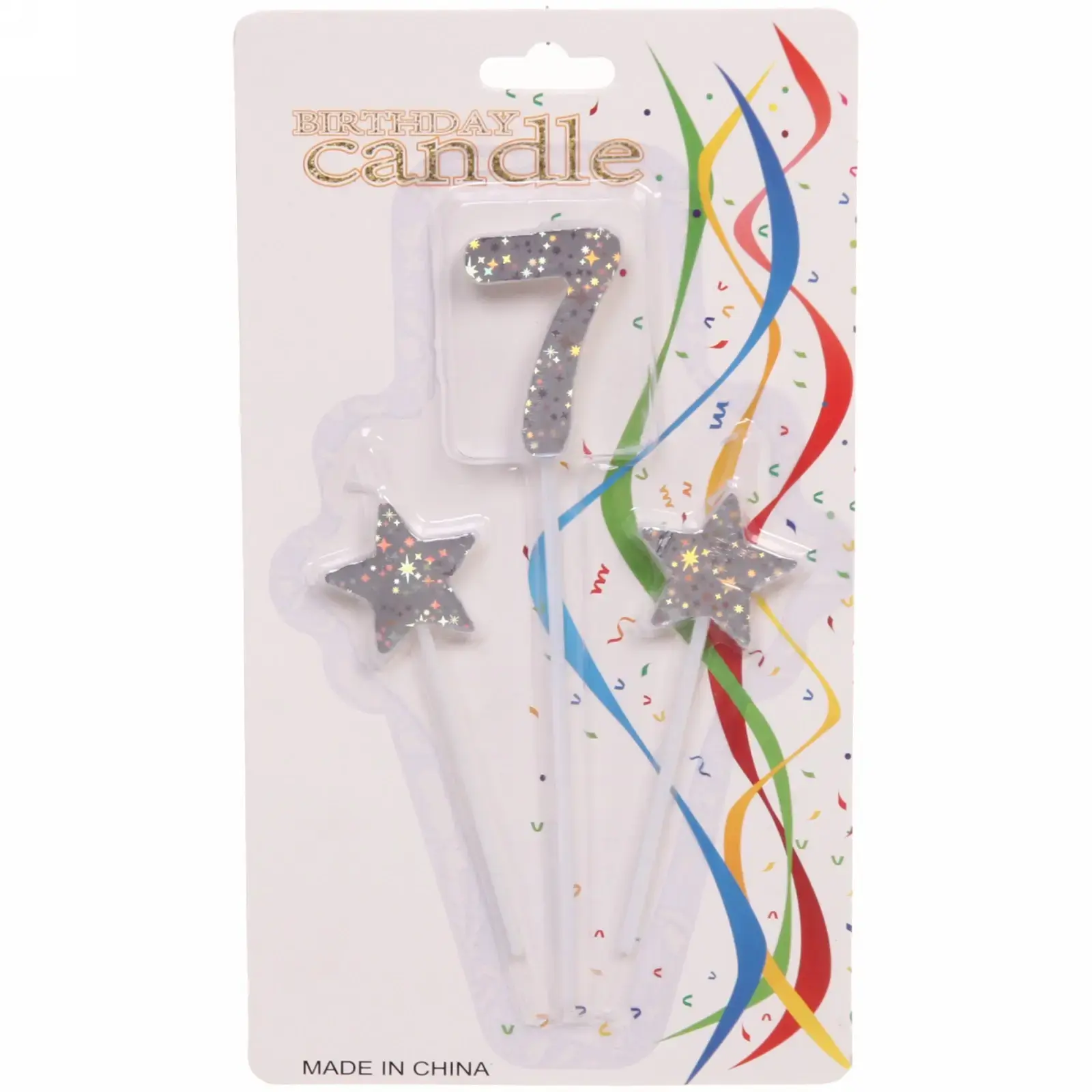 Товар состоит из одной свечи-цифры «7» и двух свечей в форме звёзд, цвета — серебро с блёстками.