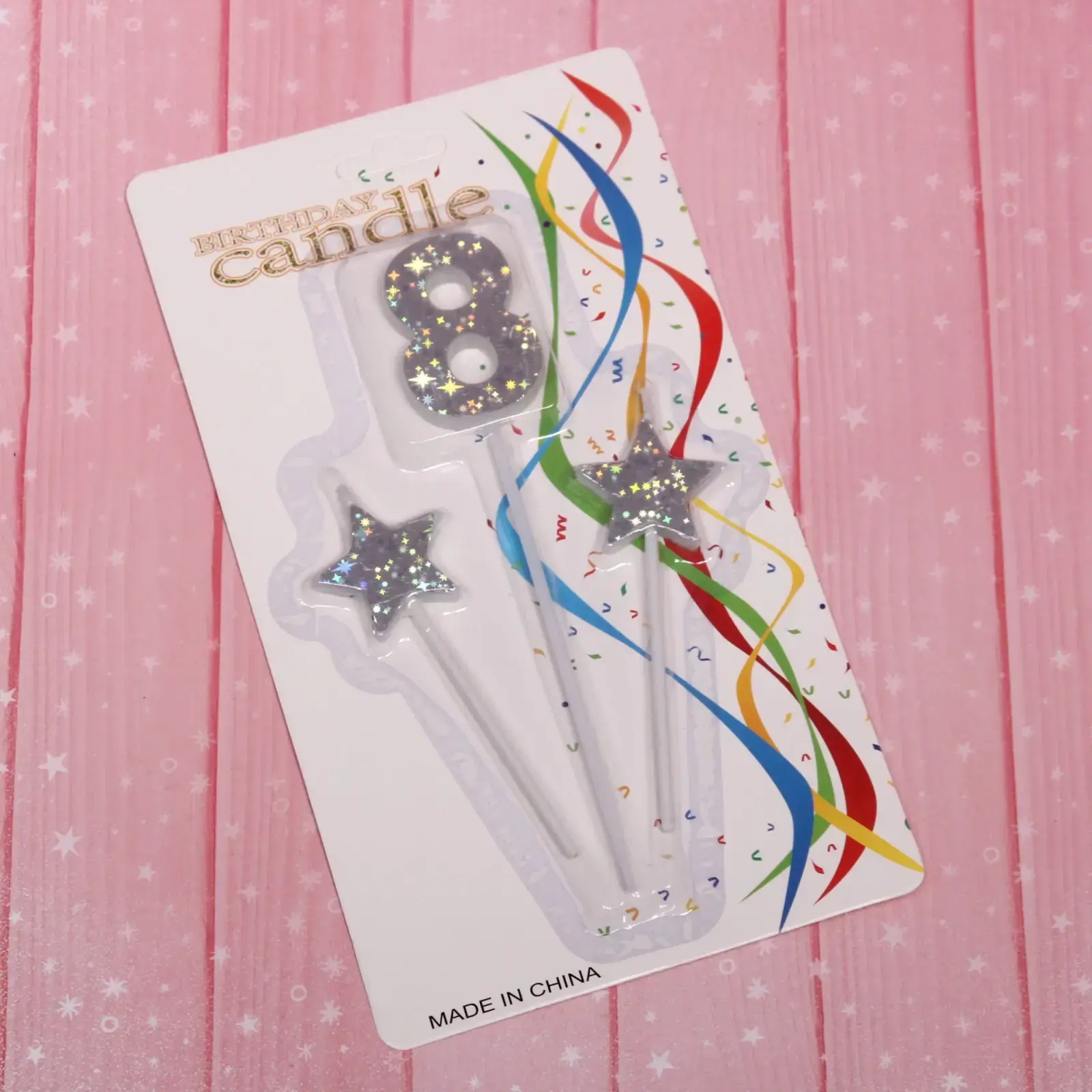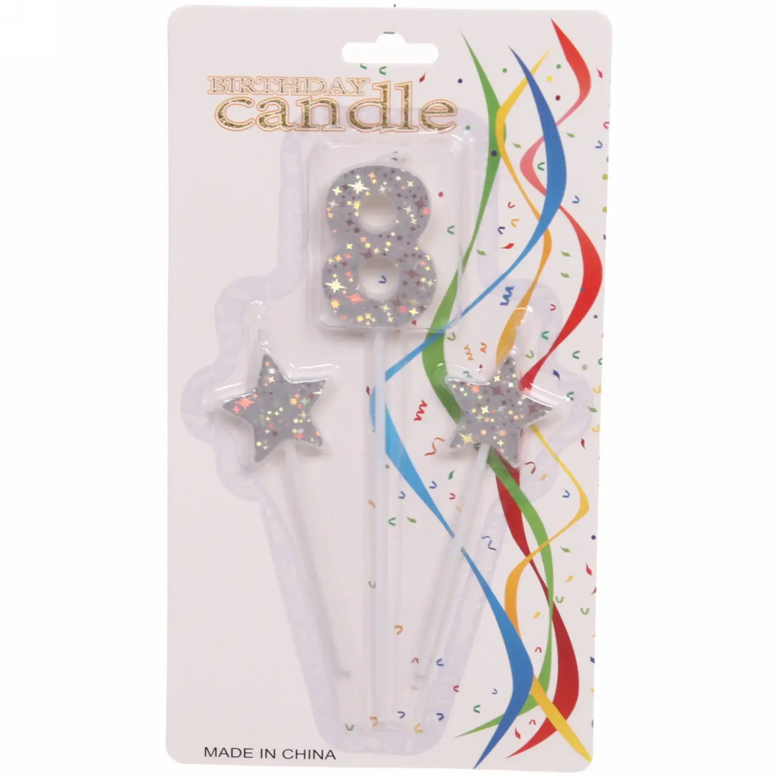 Эти свечи идеально подходят для любого торта, будь то детский день рождения или юбилей. Они легко устанавливаются благодаря длинным пластиковым держателям, что делает их удобными в использовании. Набор включает одну свечу в форме цифры '8' и две звезды, что добавляет разнообразия и оригинальности вашему десерту.