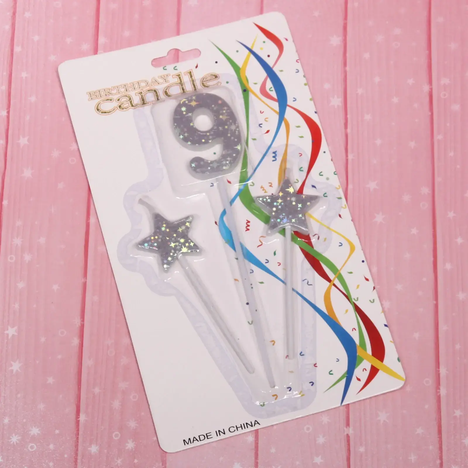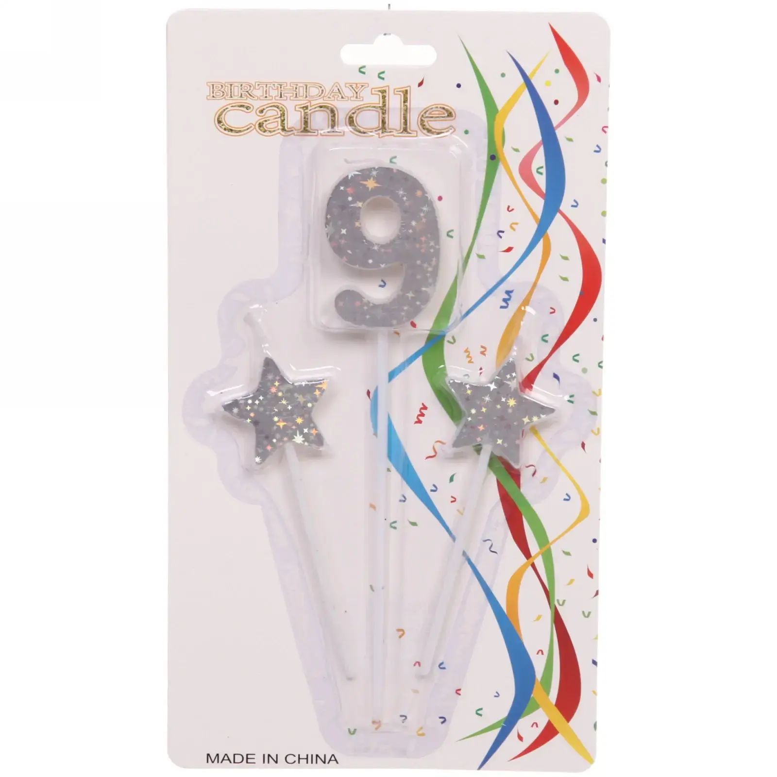 Размер свечи в форме цифры 9 составляет 16 см, а звезды имеют стандартные размеры, что делает их универсальными для любого торта. Цветовая палитра включает серебристый с блестками, что добавляет изюминку в ваше торжество. Упаковка оформлена в праздничном стиле с цветными лентами и конфетти, что делает её привлекательной для розничной продажи.