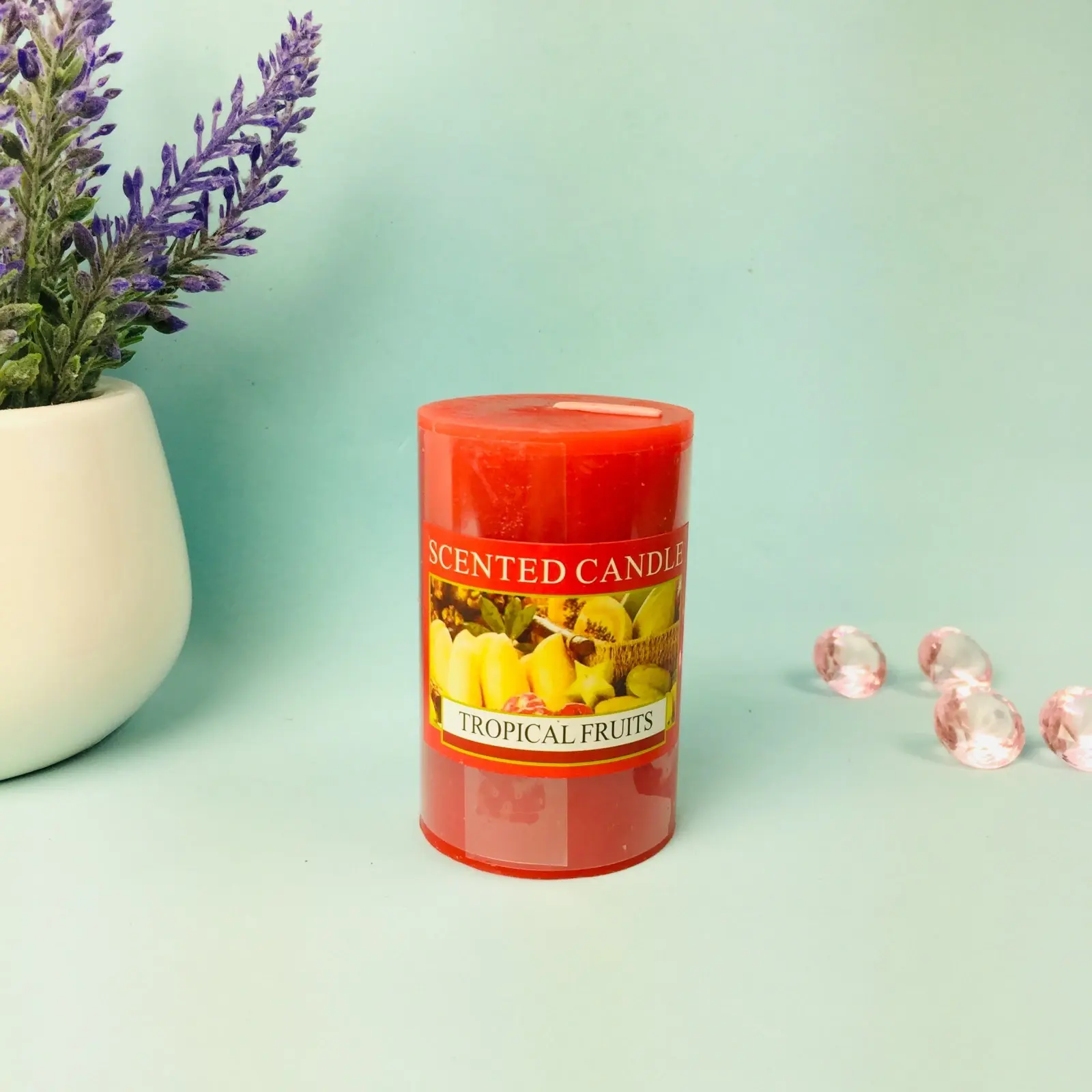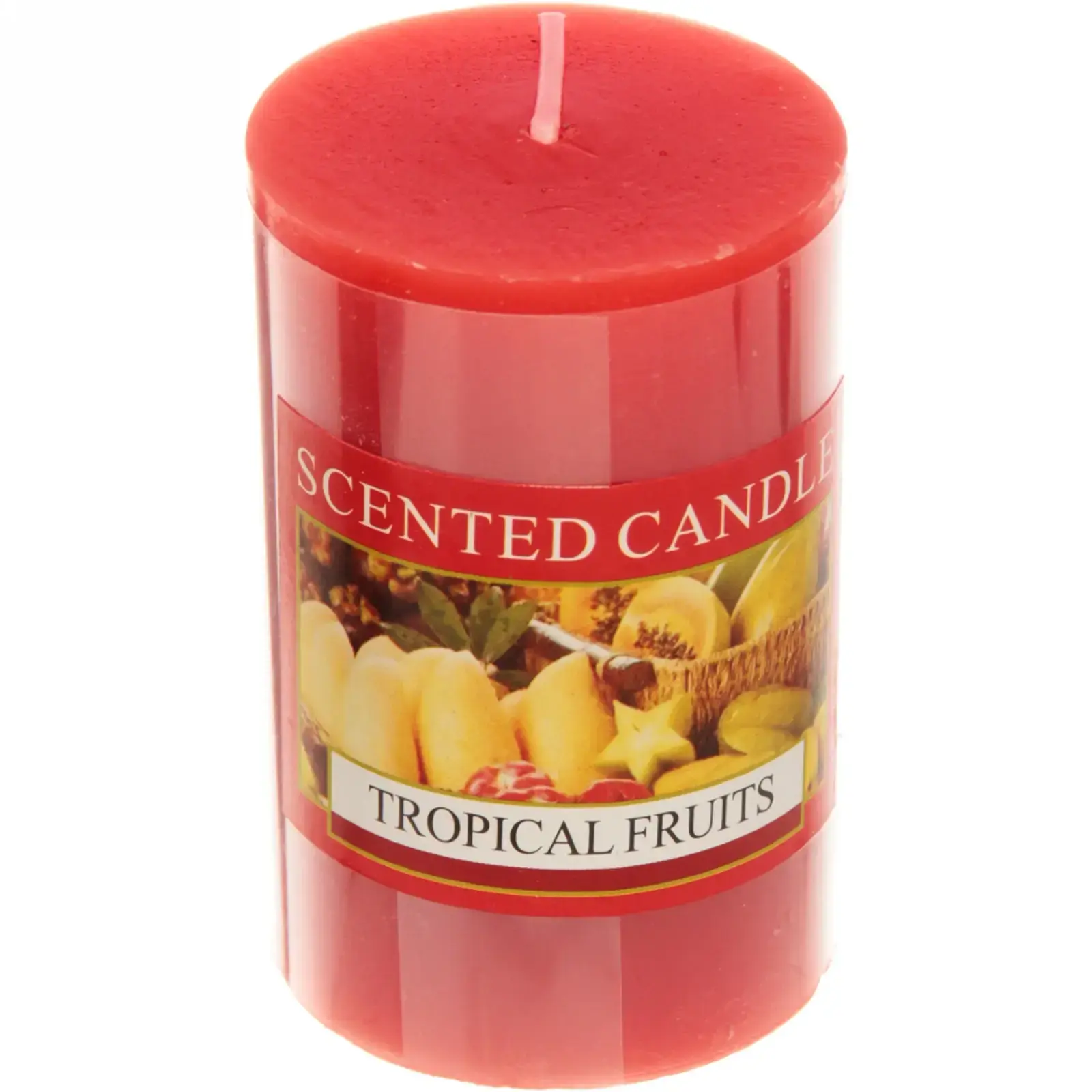 Цвет свечи — ярко-красный, корпус цилиндрической формы, с белым фитилем в центре. Удобная этикетка с изображением тропических фруктов подчеркивает освежающий аромат. Идеальный выбор для тех, кто ценит стиль, качество и уют в доме.