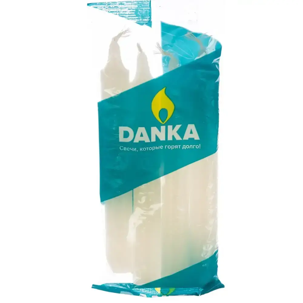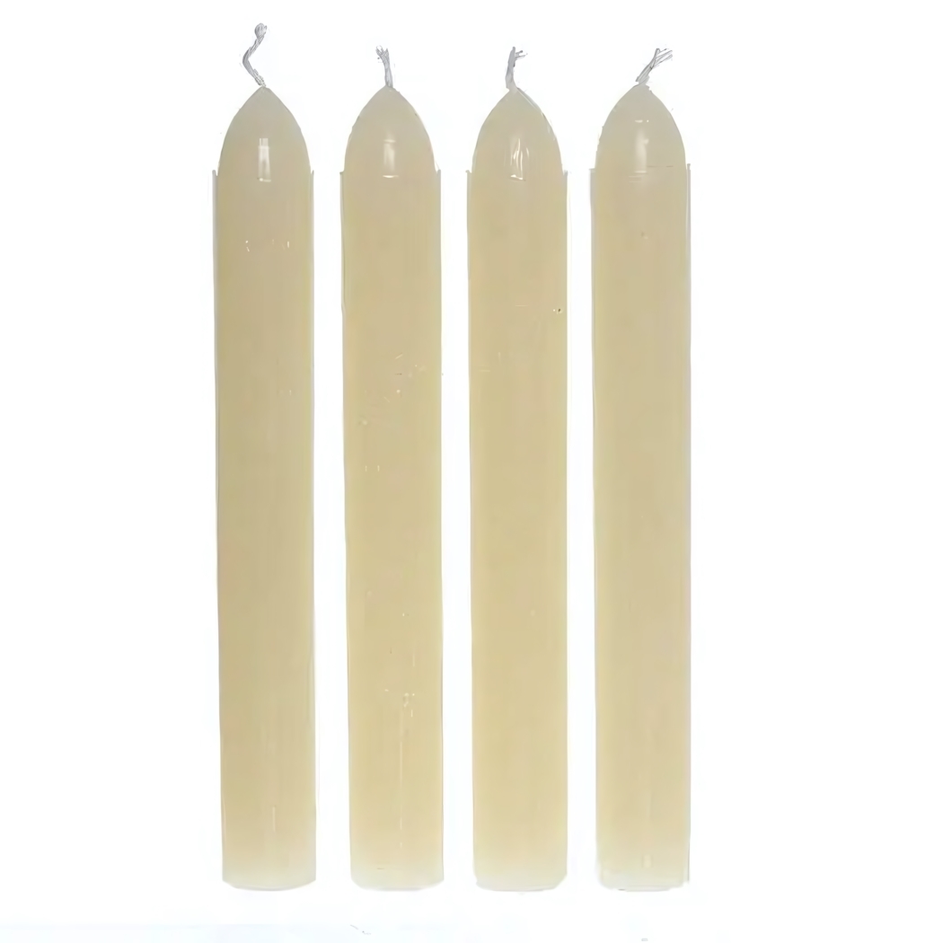Материал — парафин высокого качества, обеспечивающий длительное время горения. Цвет — кремовый. Свеча имеет цилиндрическую форму с острым верхом и фитилем, располагается в индивидуальной упаковке по 4 штуки. Такая упаковка удобно хранится и транспортируется, а свечи остаются защищенными от повреждений.
