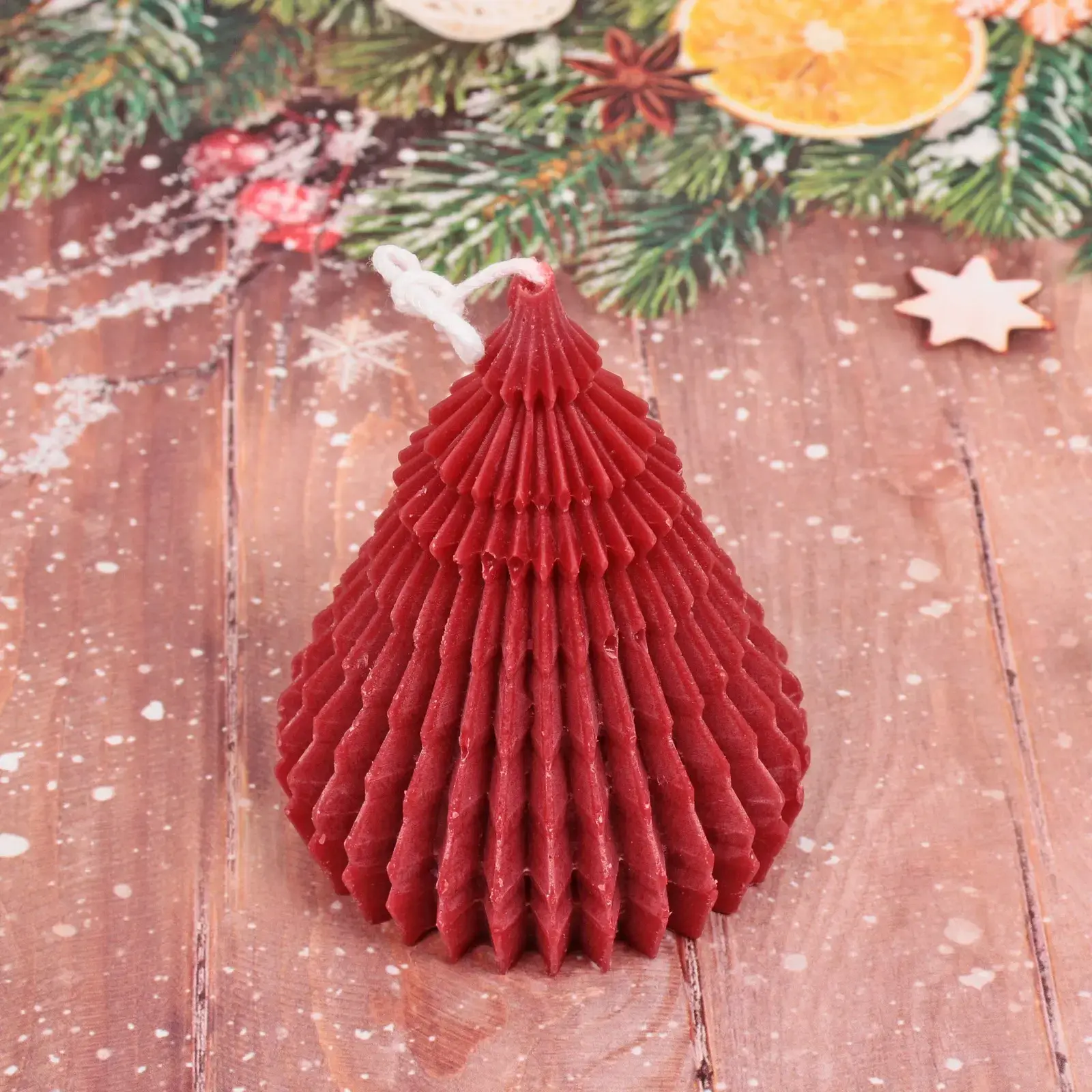 Свеча «Лесная красавица» идеально подходит для создания праздничного настроения в вашем доме. Ее можно использовать как самостоятельный элемент декора, так и в сочетании с другими новогодними украшениями. Благодаря своей конусообразной форме и рифленой текстуре, она привлекает внимание и станет ярким акцентом на вашем столе или полке.