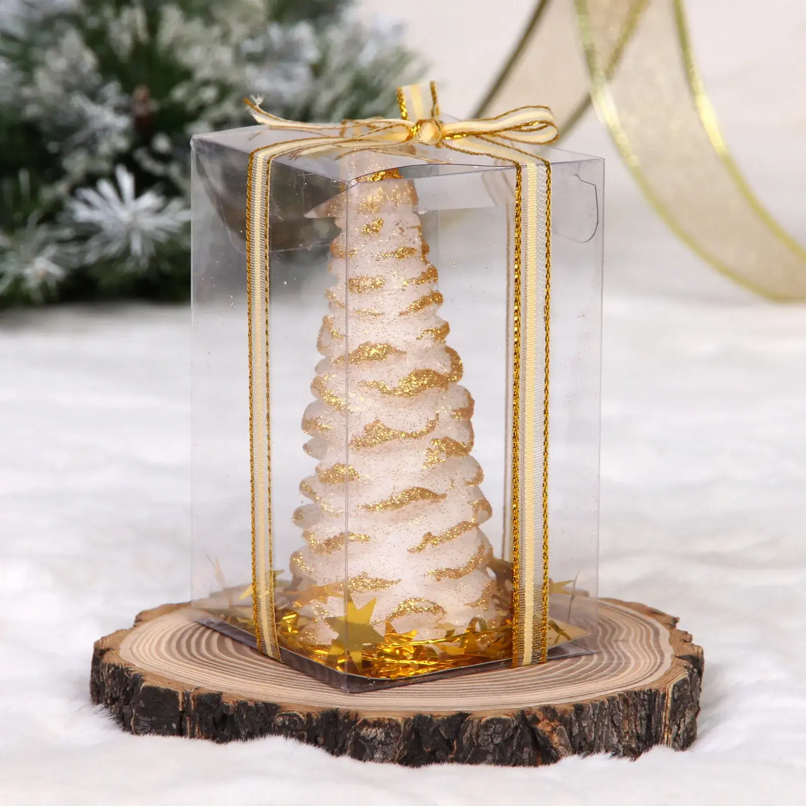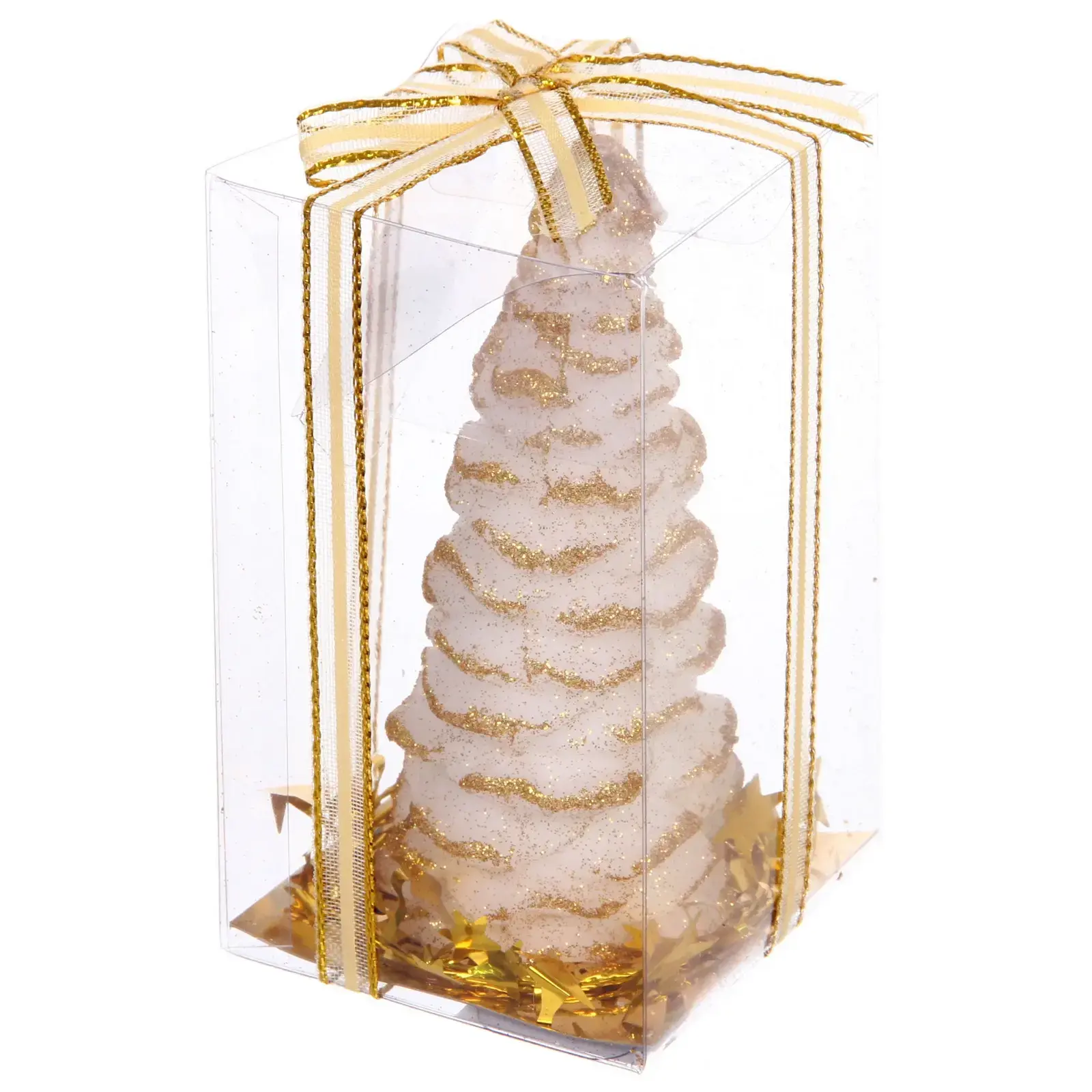 Свеча изготовлена из качественного парафина белого цвета с золотистым напылением. Конусообразная форма с рифлёной текстурой имитирует классическую ёлку. Упакована в прозрачную коробку с декоративным бантом, что делает её отличным подарком.