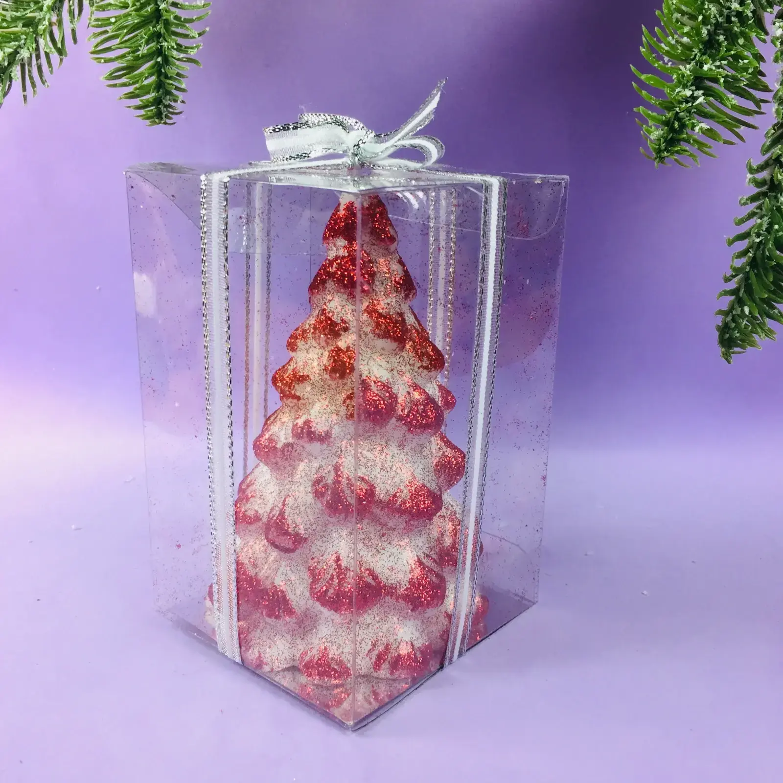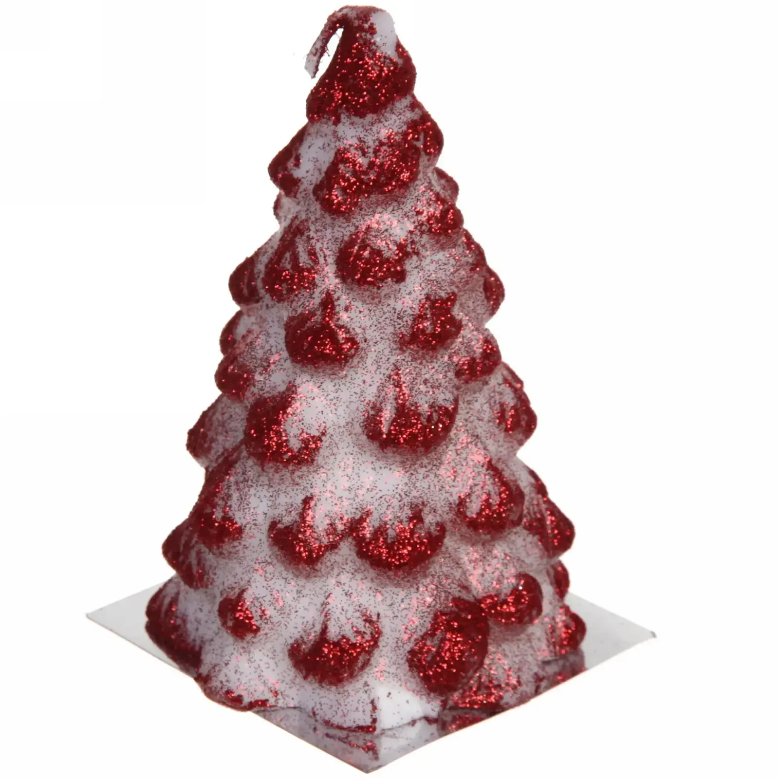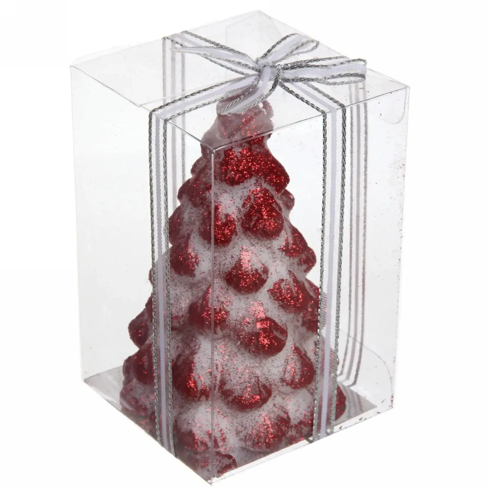Свеча имеет квадратное основание, что обеспечивает её устойчивость. Высота 12 см делает её заметной, но не слишком громоздкой. Красный цвет с белыми и серебристыми элементами придаёт ей особый шарм и делает её универсальной для любого новогоднего декора. Упакована в прозрачную пластиковую упаковку с серебристой лентой, что делает её отличным вариантом для подарка.