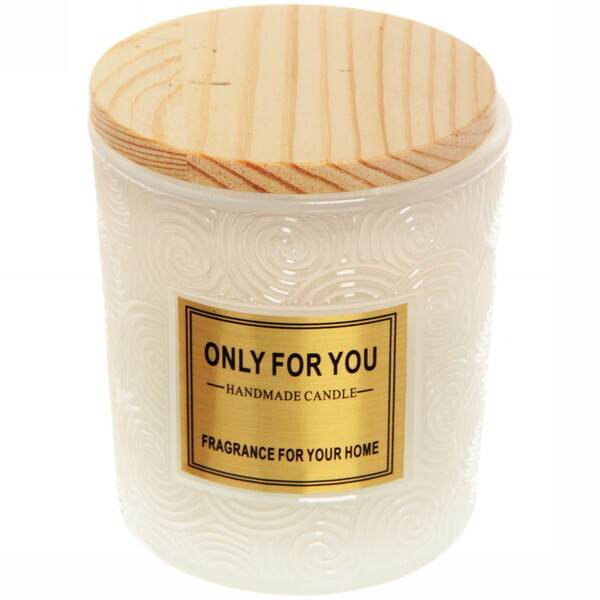 Эта свеча изготовлена из высококачественного воска и помещена в стильный стеклянный подсвечник с деревянной крышкой. Декоративный узор на контейнере добавляет изысканности, а золотистая этикетка с надписями «ONLY FOR YOU», «HANDMADE CANDLE» и «FRAGRANCE FOR YOUR HOME» подчеркивает её уникальность. Свеча не только красиво выглядит, но и обладает длительным временем горения, что позволяет вам наслаждаться её ароматом долгое время.