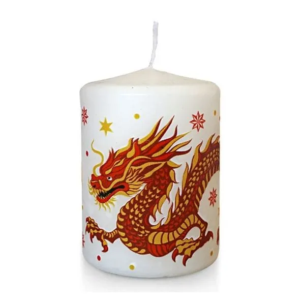 Размер свечи — 60х80 мм. Форма — широкий цилиндр со слегка скошенным верхним краем. Светлая основа и детализированное изображение дракона создают эффектный контраст, благодаря которому свеча привлекает внимание даже без дополнительного декора. Разместите ее на столе, полке или в декоративной композиции, чтобы добавить пространству тепла и выразительности.