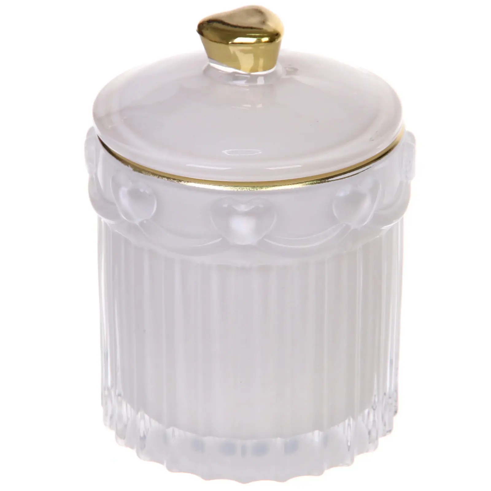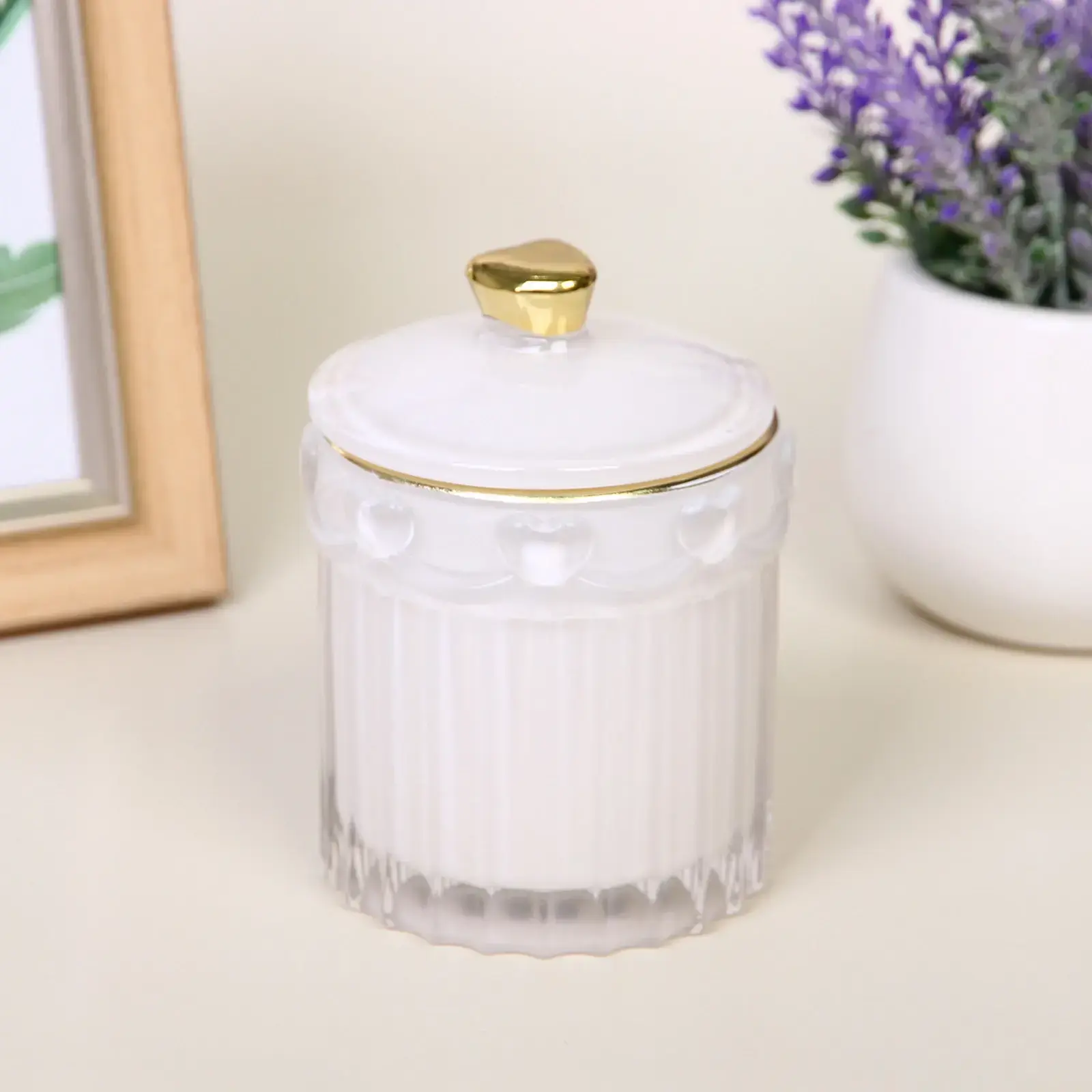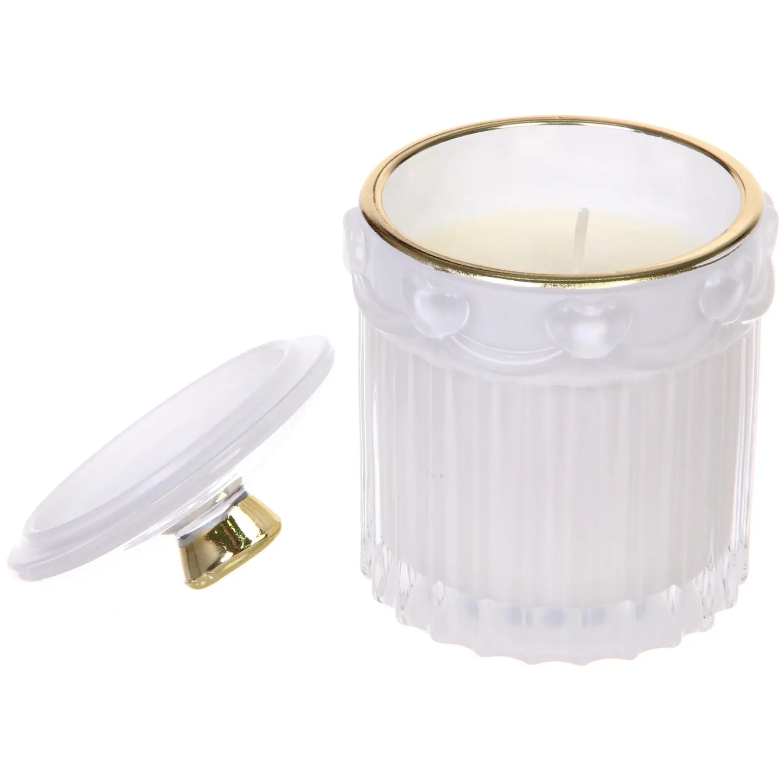 Преимущества этой свечи — аккуратный дизайн, универсальный белый цвет, устойчивость к высоким температурам и декоративным рельефам. Стеклянный стакан с рифлёным рисунком и крышка с золотым кантом добавляют изделию изысканности и стиля.