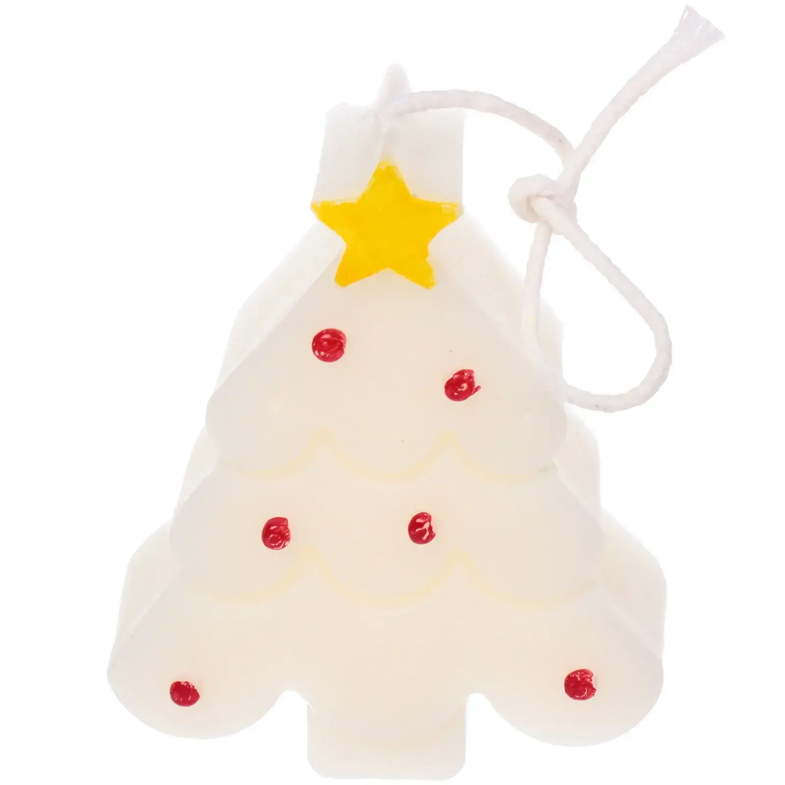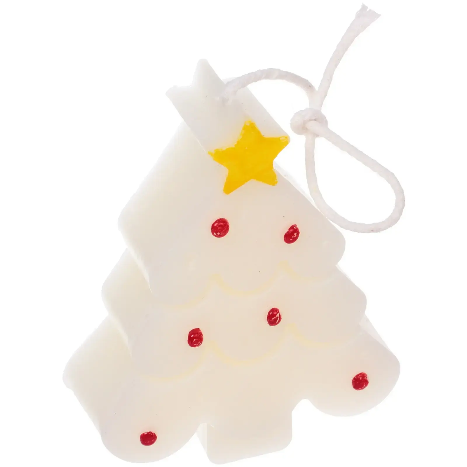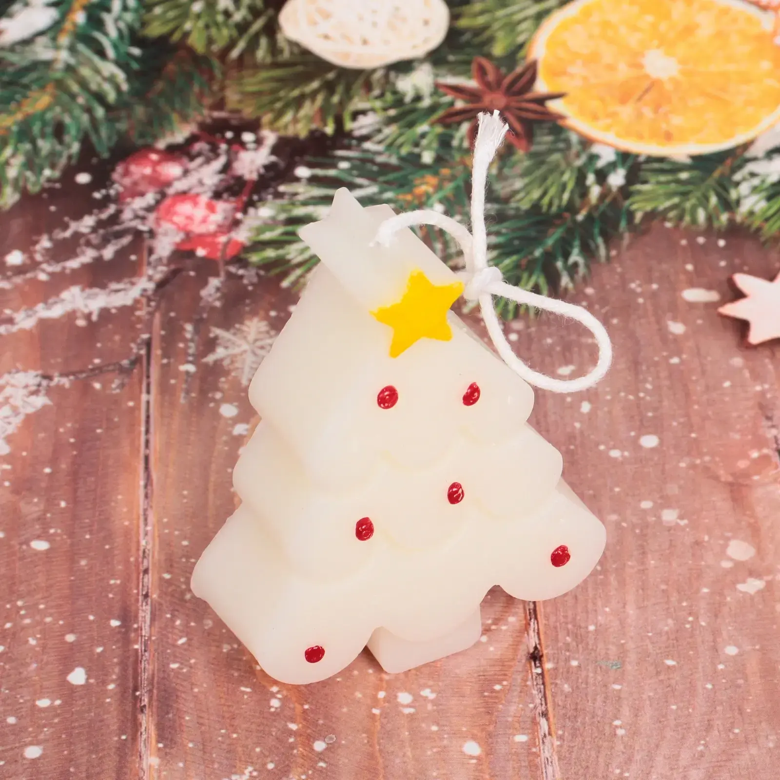 Эта уникальная свеча в форме рождественской елки станет идеальным дополнением вашего новогоднего декора. Ее белый цвет и декоративные элементы, такие как желтая звезда на вершине и красные точки, имитирующие игрушки, создают атмосферу праздника и уюта. Свеча не только украсит ваш дом, но и добавит теплоты в зимние вечера.