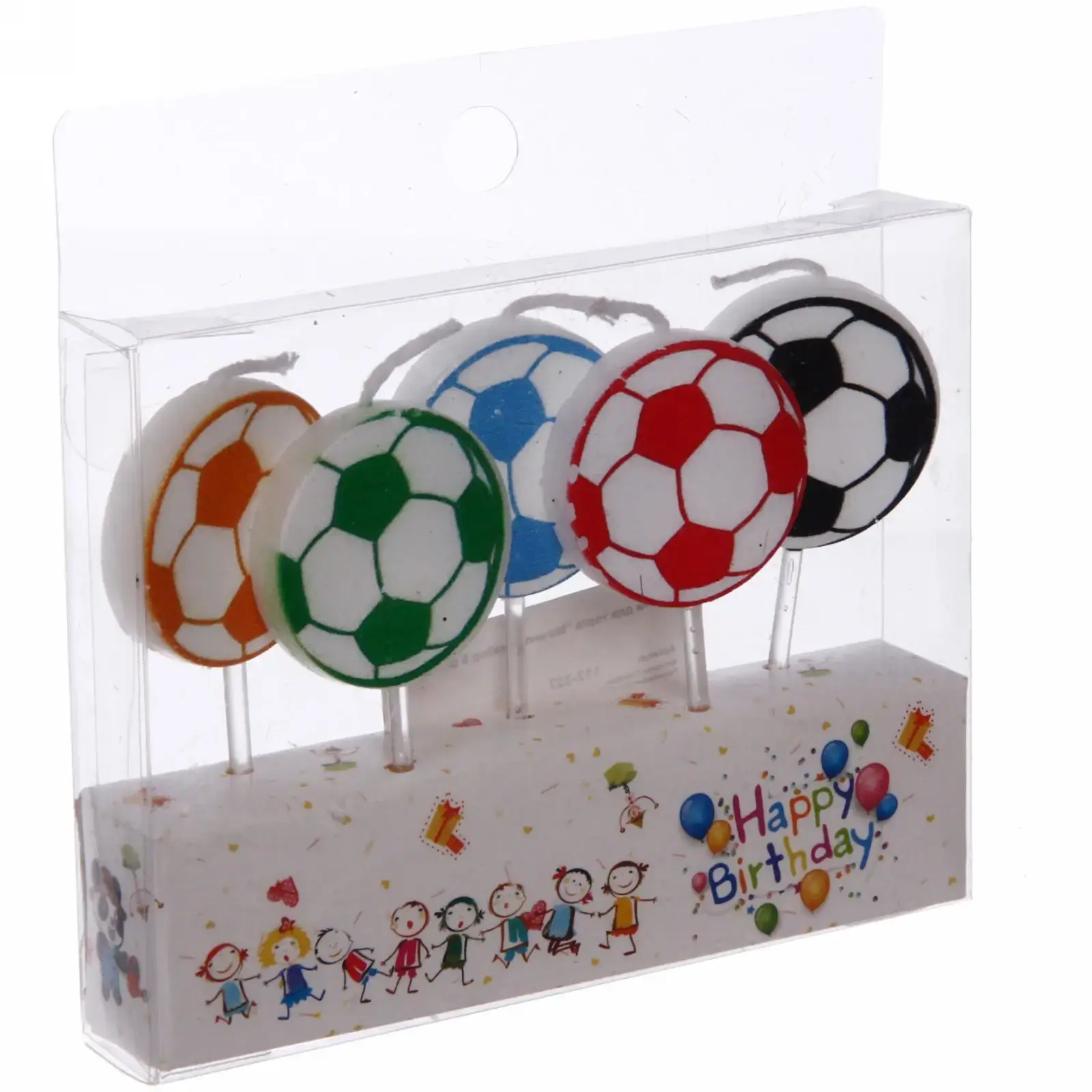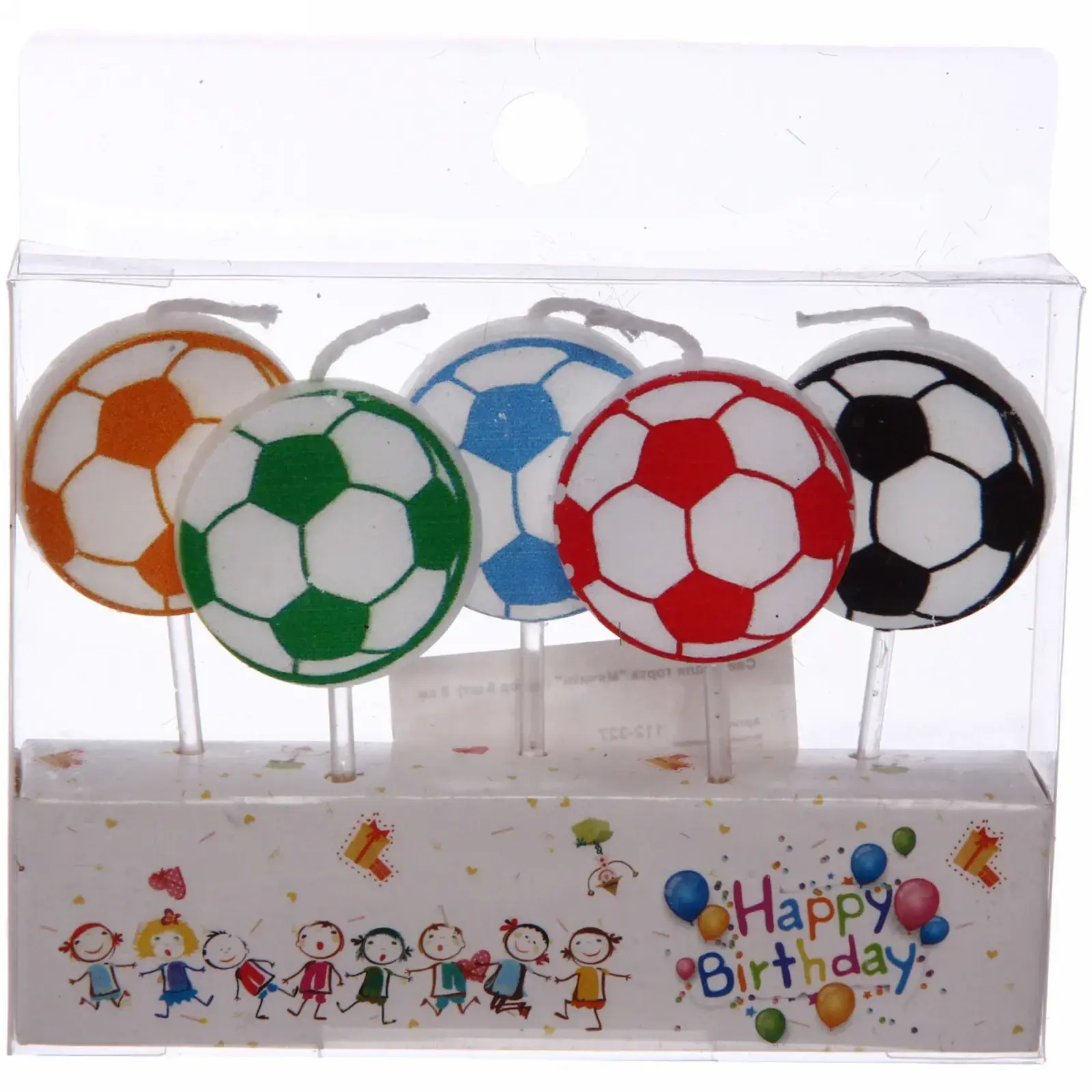 Свечи легко устанавливаются на торт благодаря пластиковым держателям, что делает их использование простым и удобным. В наборе вы найдете пять свечей различных цветов: оранжевую, зеленую, синюю, красную и черную. Каждая свеча имеет округлую форму и оформлена с изображением футбольного мяча, что делает их привлекательными для детей и взрослых.