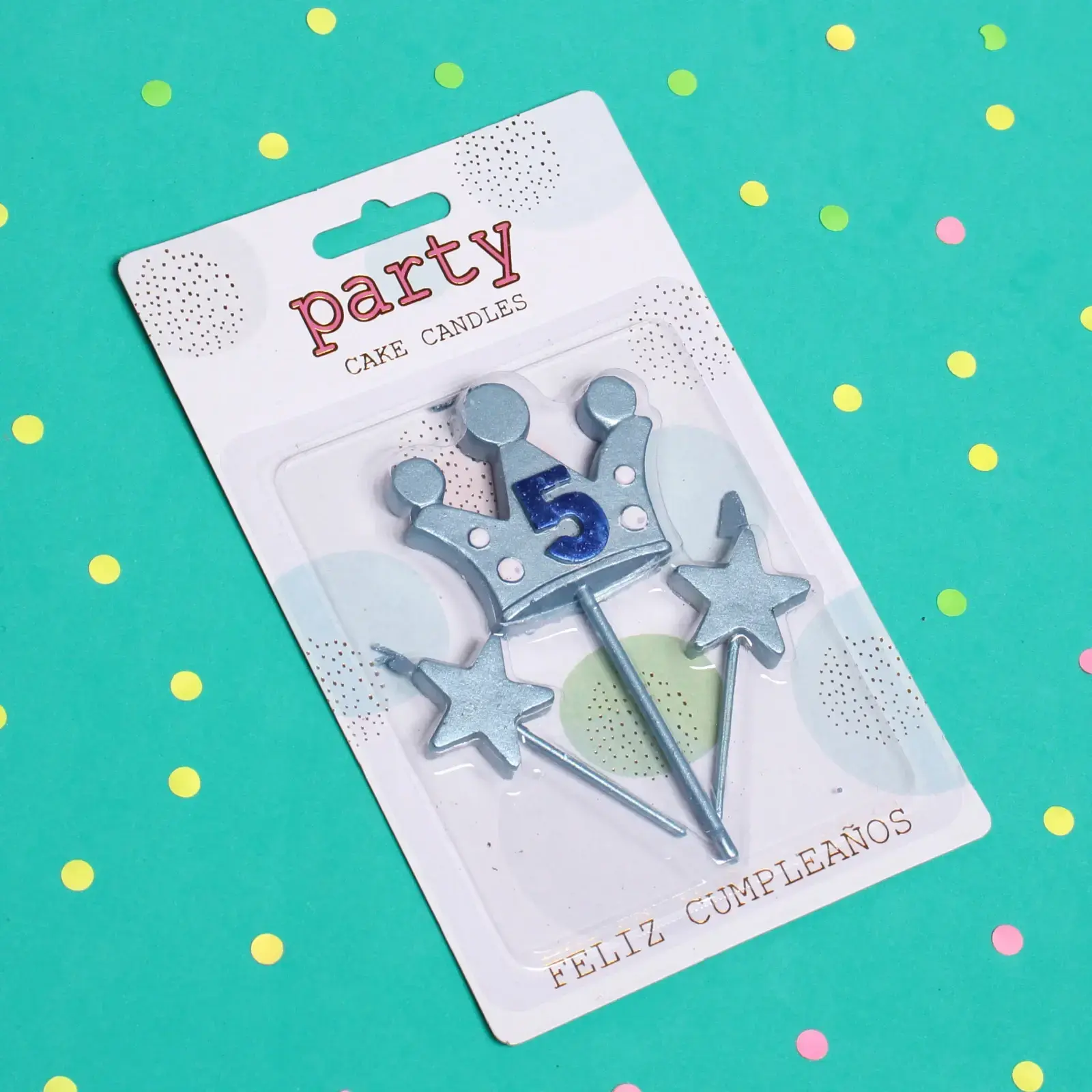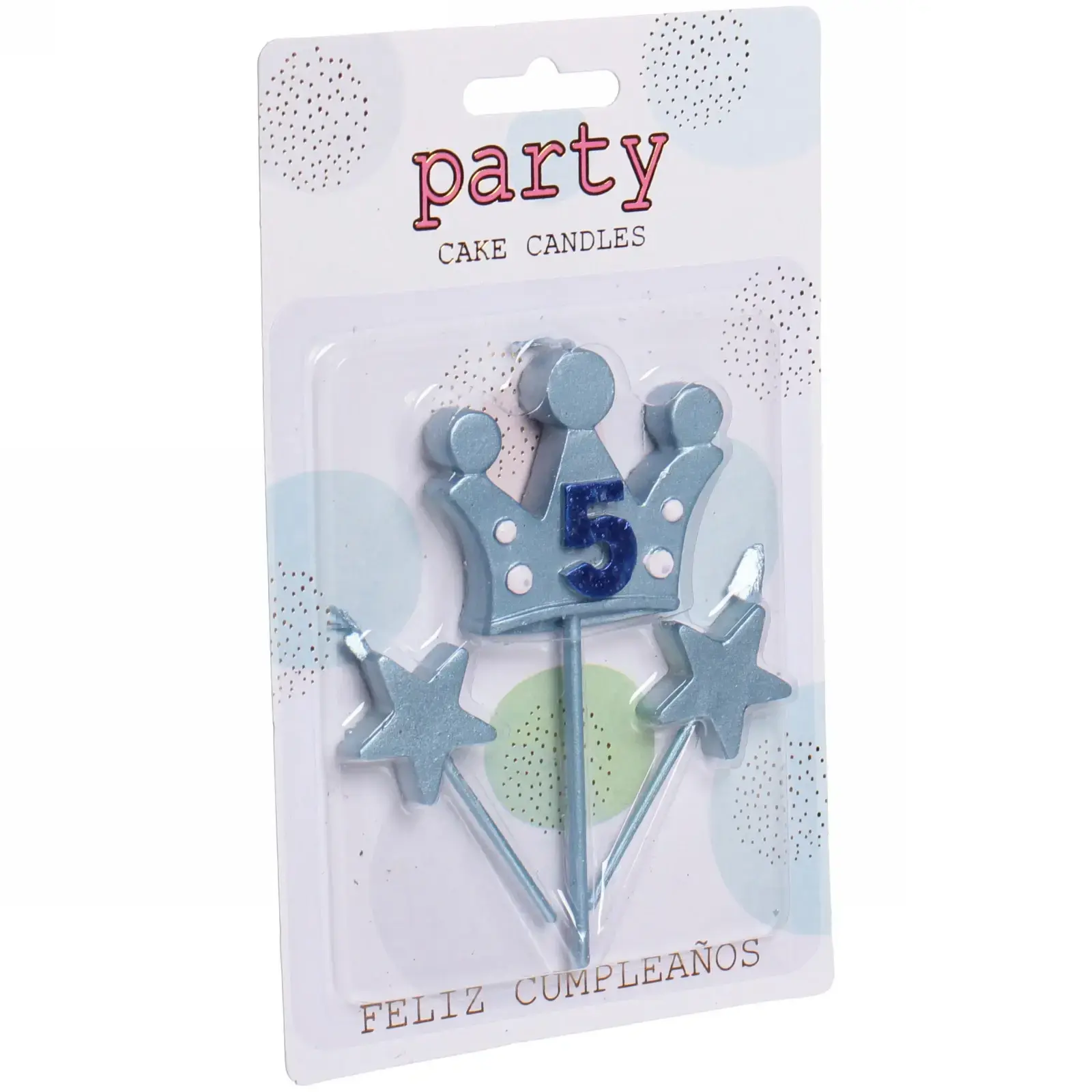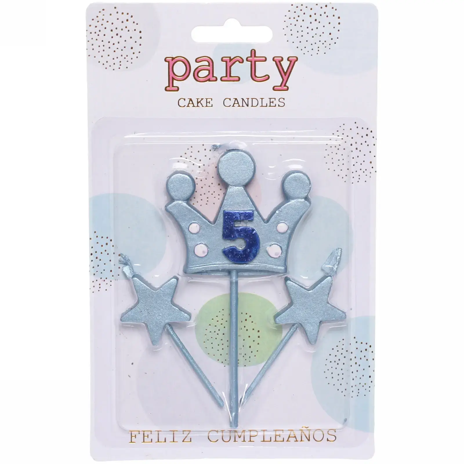 Свечи легко устанавливаются в торт благодаря пластиковым основаниям и металлическим штырям. В комплект входят три элемента: одна свеча в форме короны с цифрой «5» и две звезды, что делает их идеальными для празднования дня рождения. Эти свечи подойдут как для домашних праздников, так и для мероприятий на открытом воздухе.