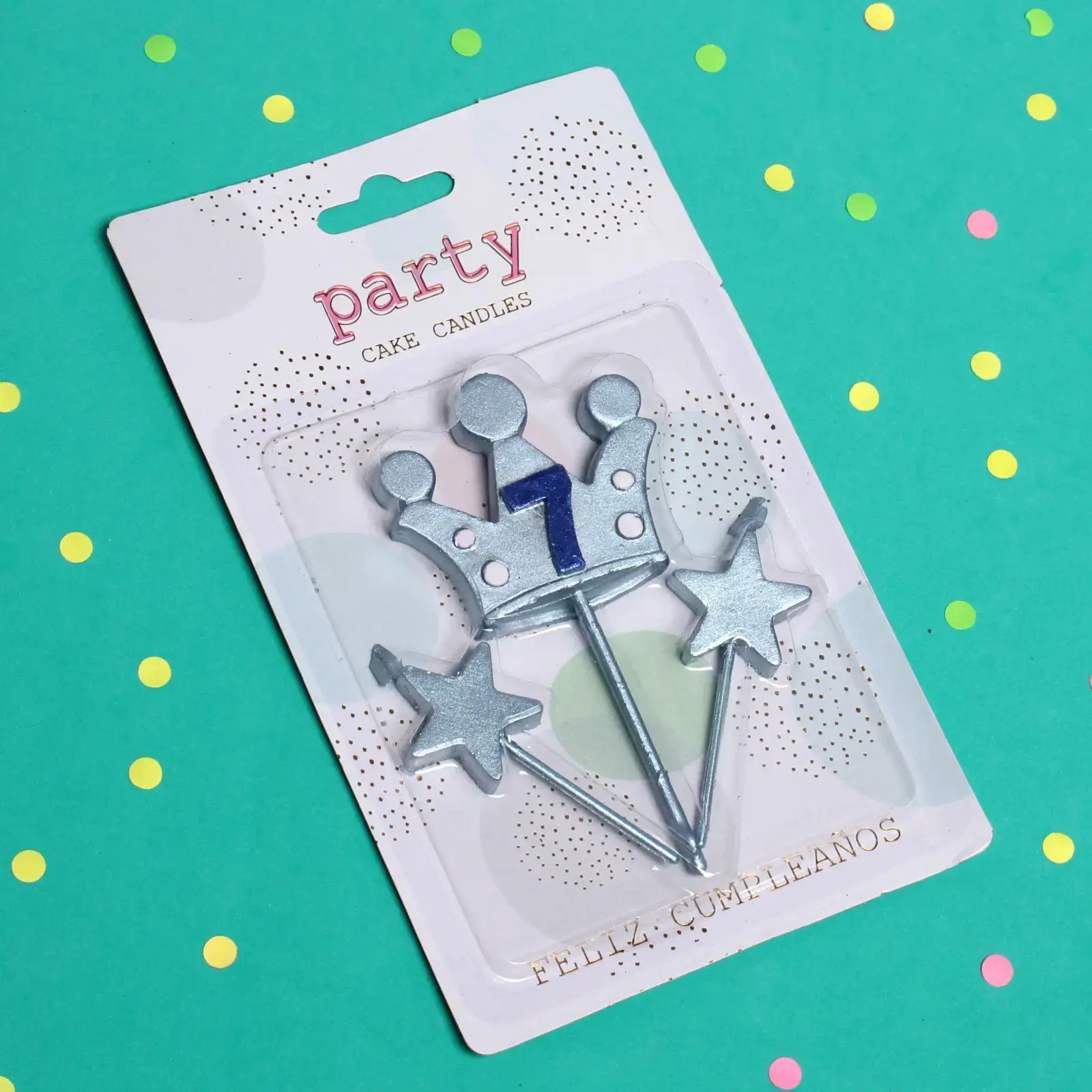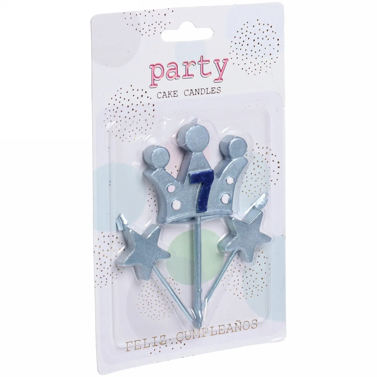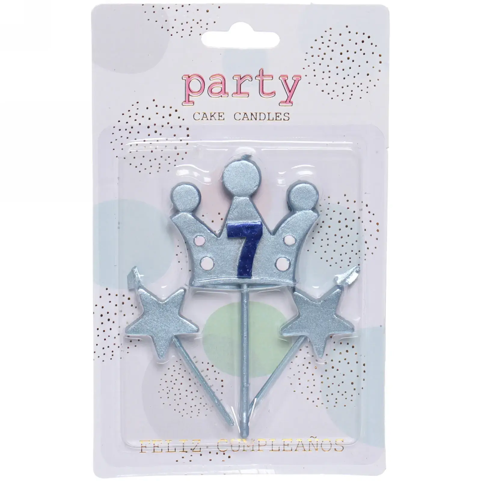 Свечи имеют блестящую отделку и выполнены в светло-синем цвете с элементами серебристого. Корона украшена цифрой 7, что делает их особенно подходящими для празднования седьмого дня рождения. Упаковка свечей оформлена в праздничном стиле и содержит надписи на испанском языке «FELIZ CUMPLEAÑOS», что переводится как «С днём рождения». Эти свечи станут отличным дополнением к вашему празднику и создадут незабываемые воспоминания!