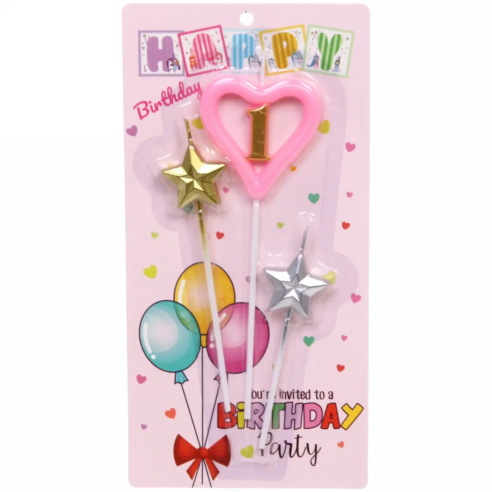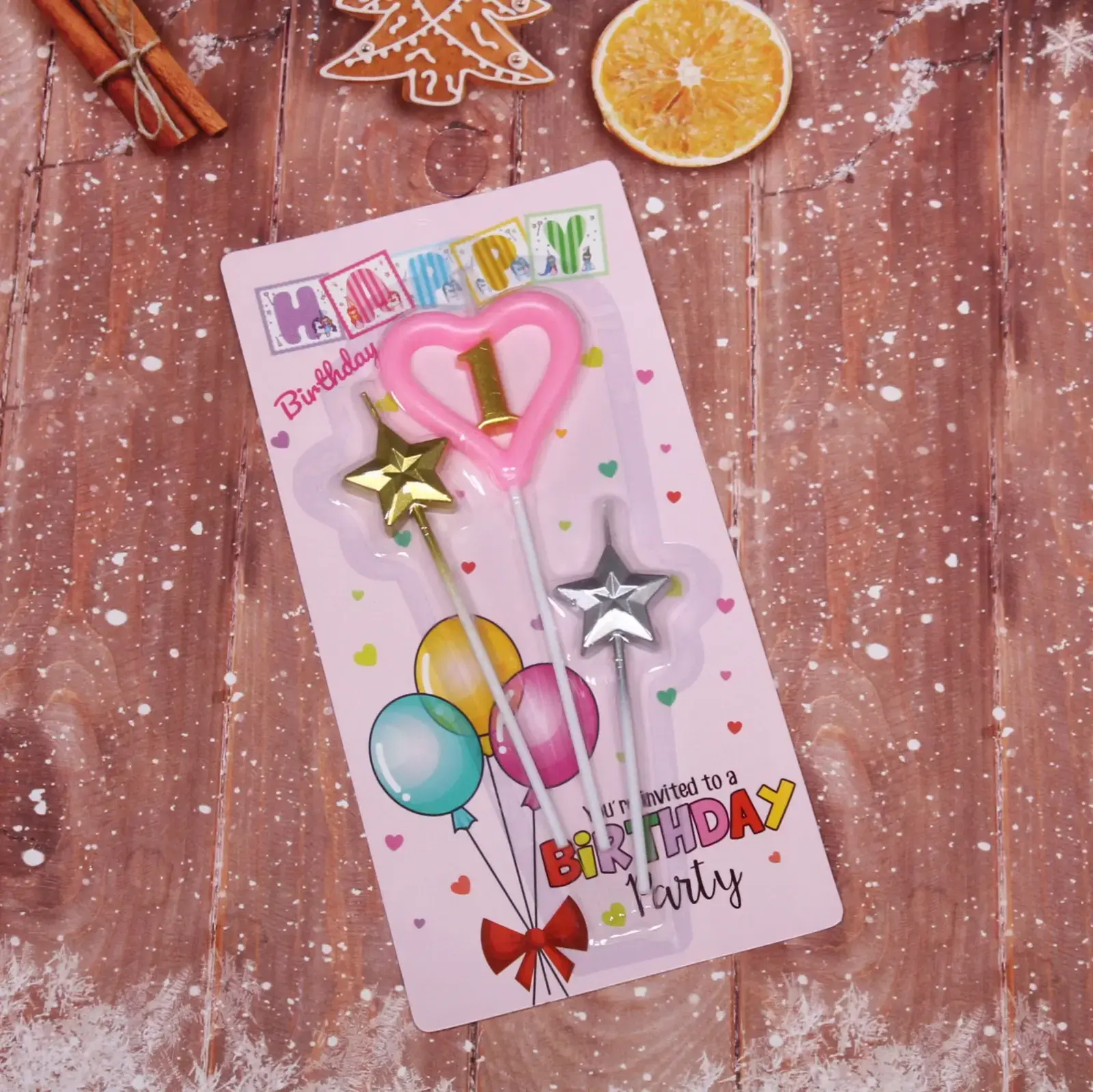 В набор входят три свечи: одна в форме сердца с цифрой «1» розового цвета, а также две звезды — золотая и серебряная. Упаковка оформлена в ярком, праздничном стиле с изображениями воздушных шаров и сердечек, что делает ее отличным выбором для подарка. Размеры свечей стандартные для торта, что позволяет легко их использовать в любых кулинарных шедеврах.