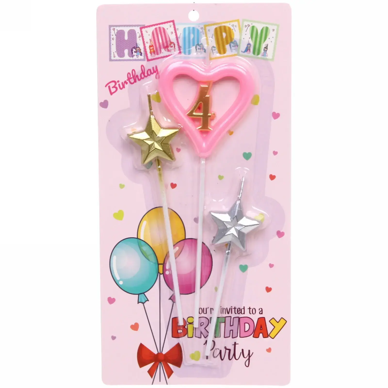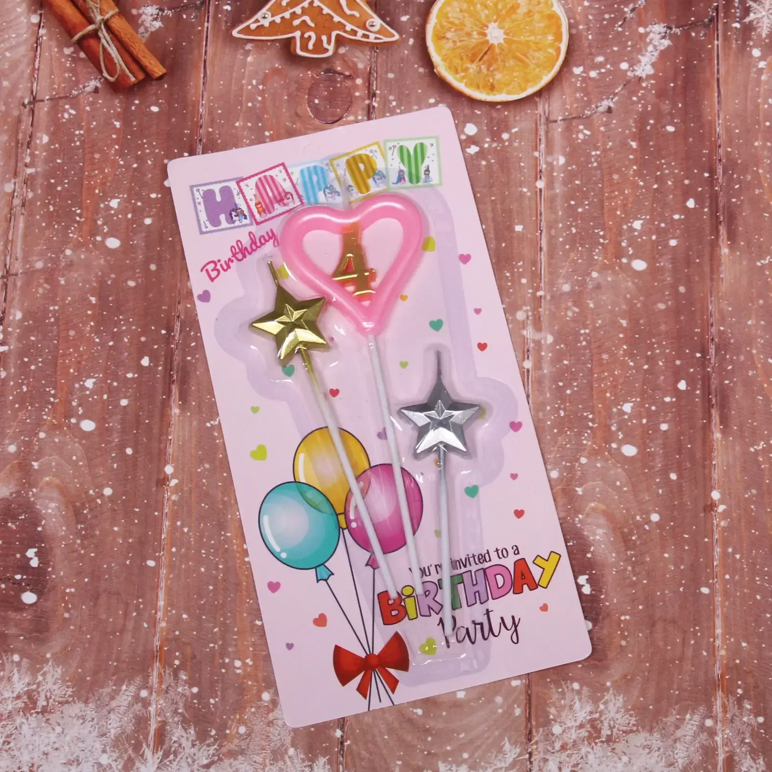 - В наборе: 1 свеча-сердце (розовый цвет, цифра 4), 2 свечи-звезды (золотая и серебряная)