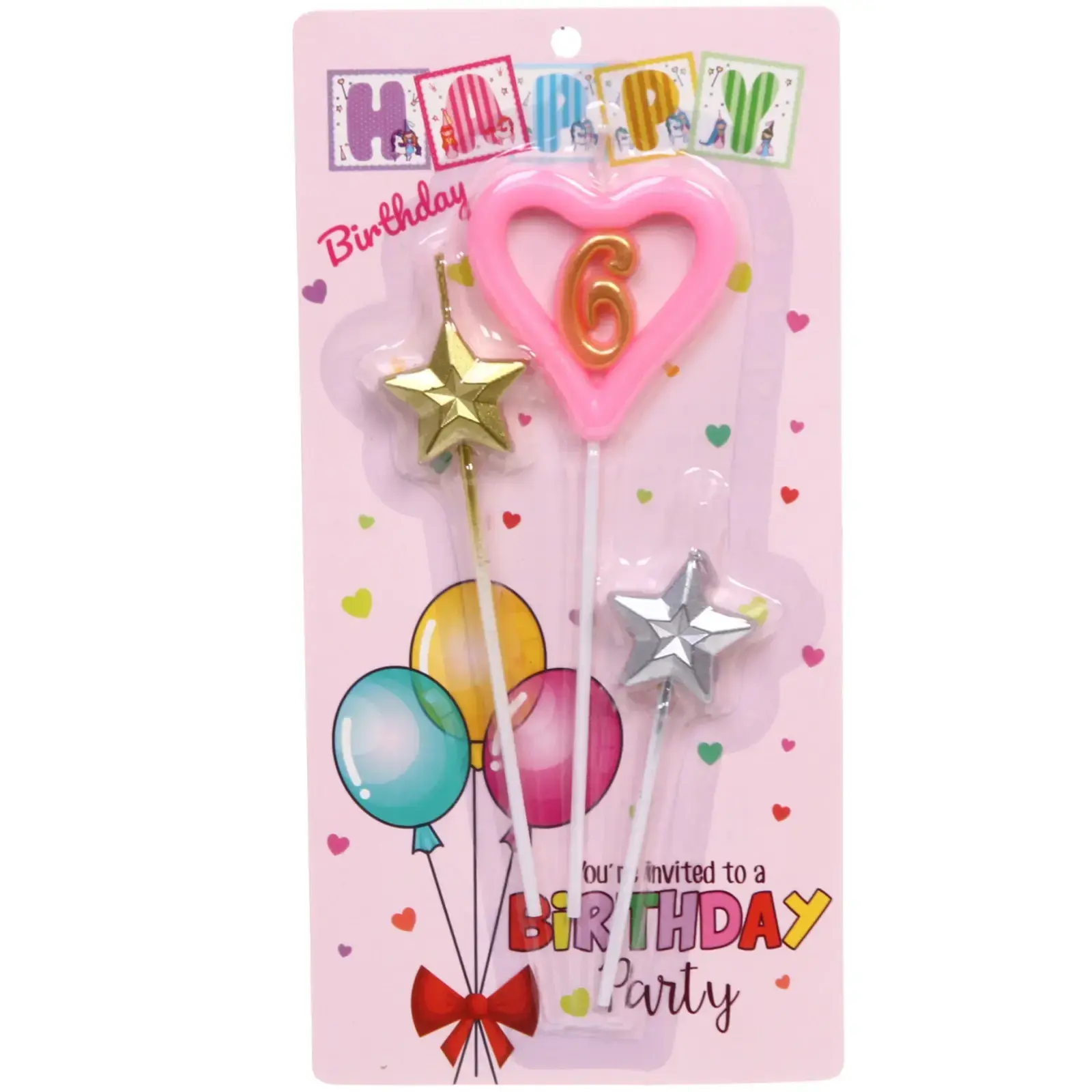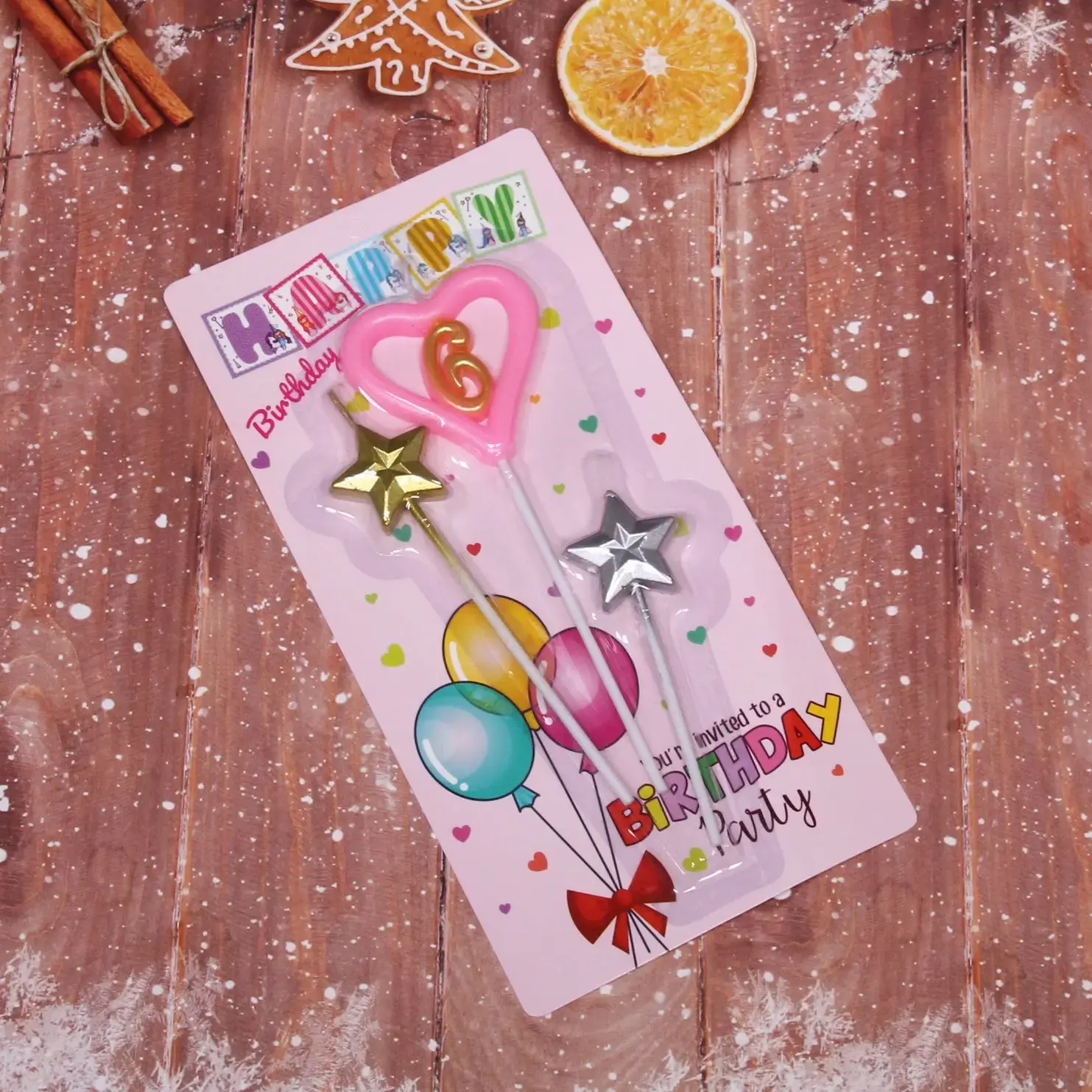 В набор входят три свечи: одна в форме сердца с цифрой 6 и две звёздные свечи — одна золотого и одна серебряного цвета. Все свечи имеют пластиковые держатели, что делает их удобными в использовании. Упаковка оформлена в светло-розовых тонах с сердечками и шариками, что делает её привлекательной для любого праздника.