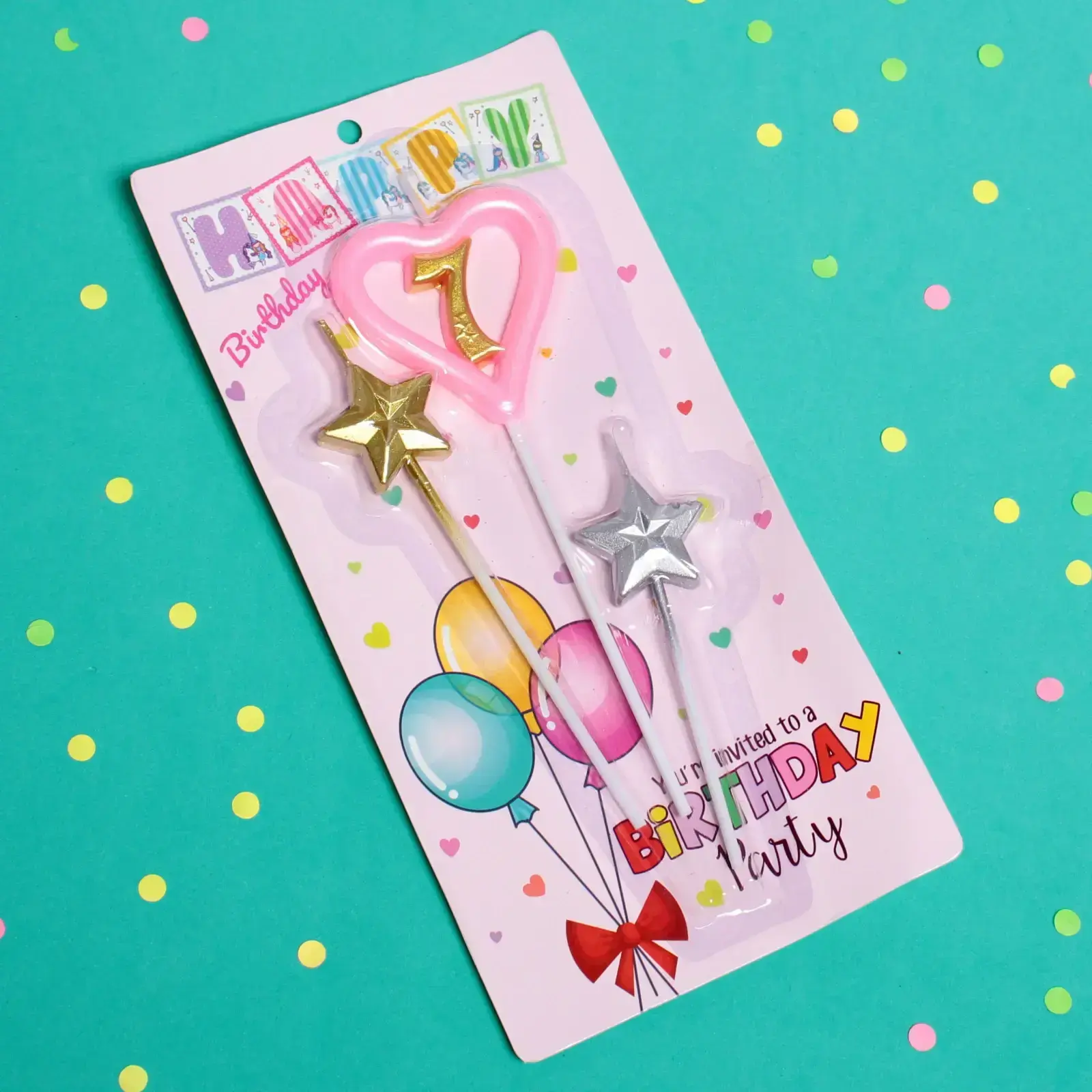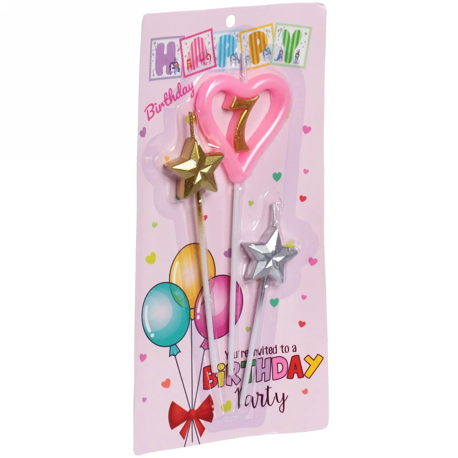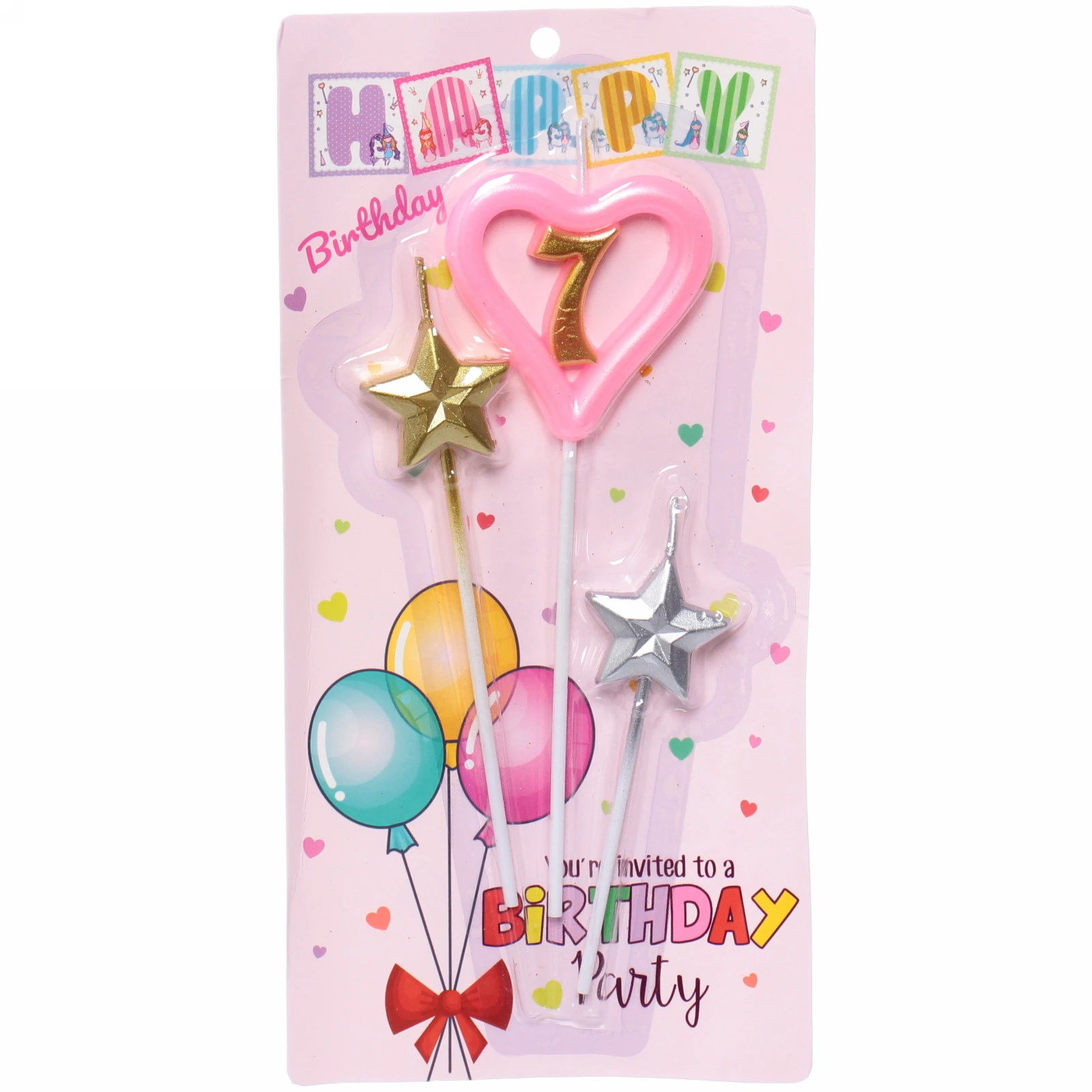 В комплект входят три свечи: одна в форме сердца с цифрой 7, окрашенная в розовый цвет, и две звёздочки — одна золотого и одна серебряного цвета. Все свечи установлены на пластиковых держателях, что делает их удобными в использовании. Упаковка оформлена в пастельных тонах с изображением воздушных шаров и сердечек, что добавляет дополнительный шарм.
