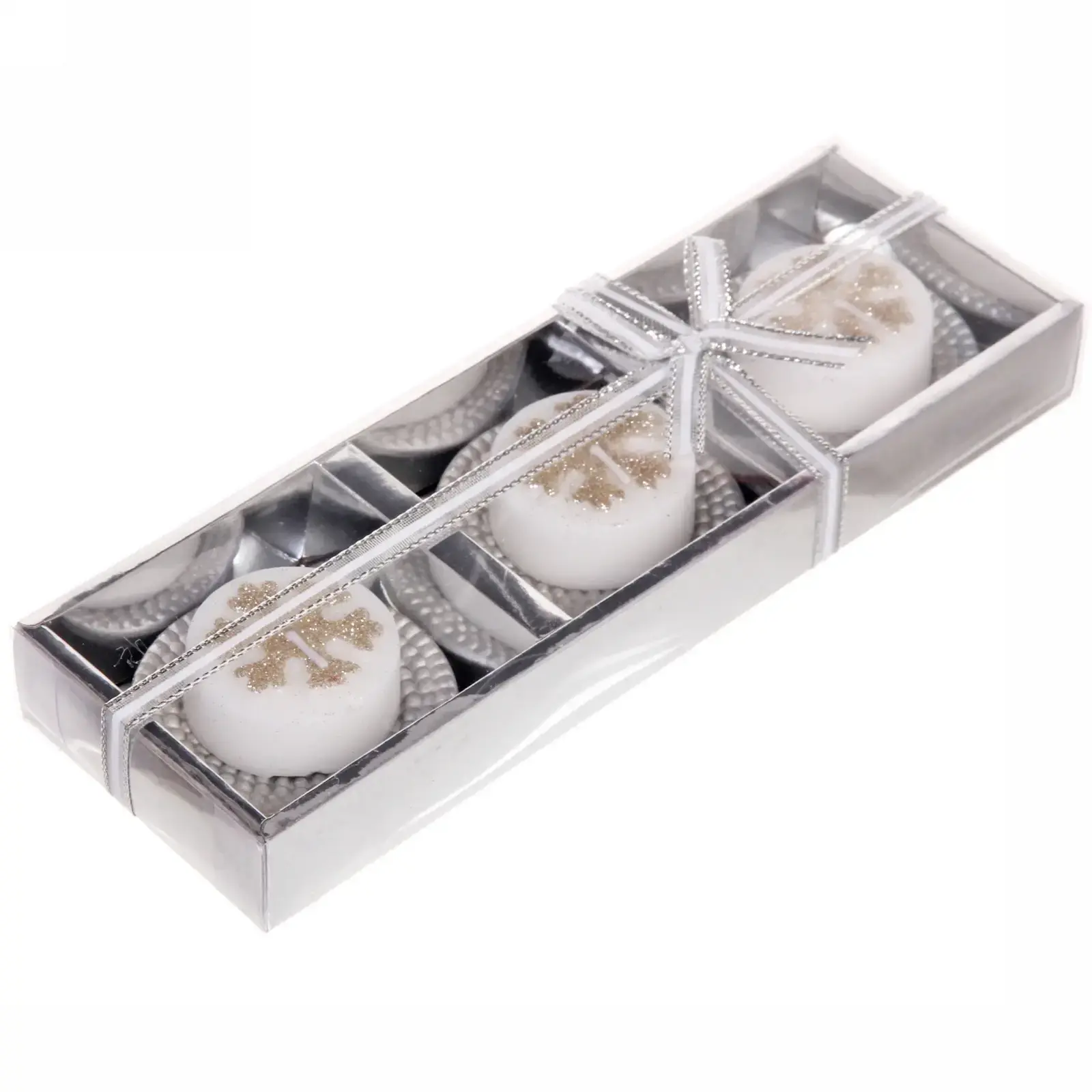 В набор входят три свечи размером 25*8,5*3 см, что делает их компактными и удобными для использования. Каждая свеча имеет круглую форму и равномерную поверхность, что обеспечивает их стабильность при использовании. Упаковка выполнена из прозрачного материала с серебристым блеском, что подчеркивает праздничный вид товара.