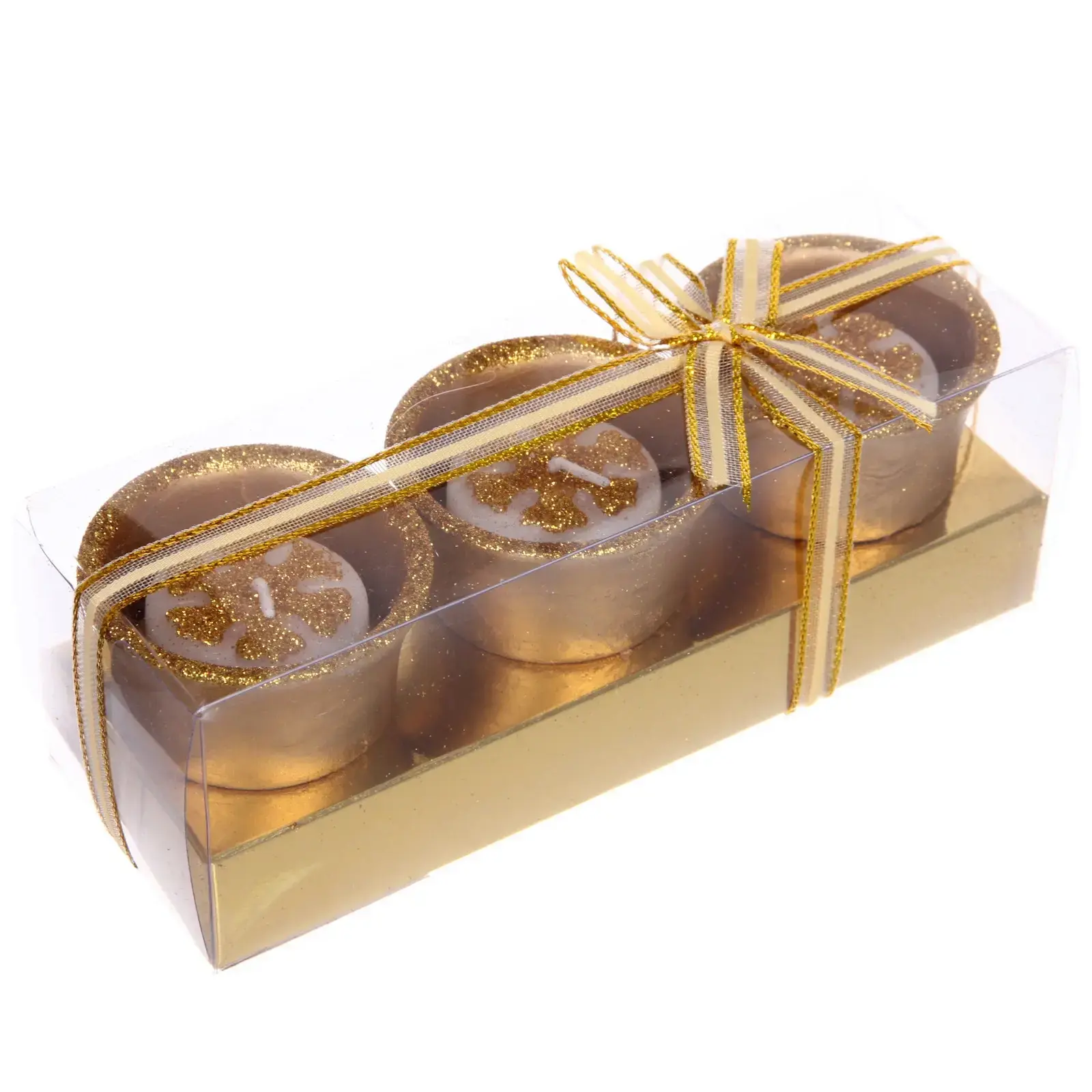 Набор из трёх парафиновых свечей с изысканным декором в виде снежинок станет изюминкой вашего новогоднего интерьера. Блестящее золотое покрытие и деликатный узор создают эффект мерцающего льда, наполняя пространство волшебством зимнего праздника.