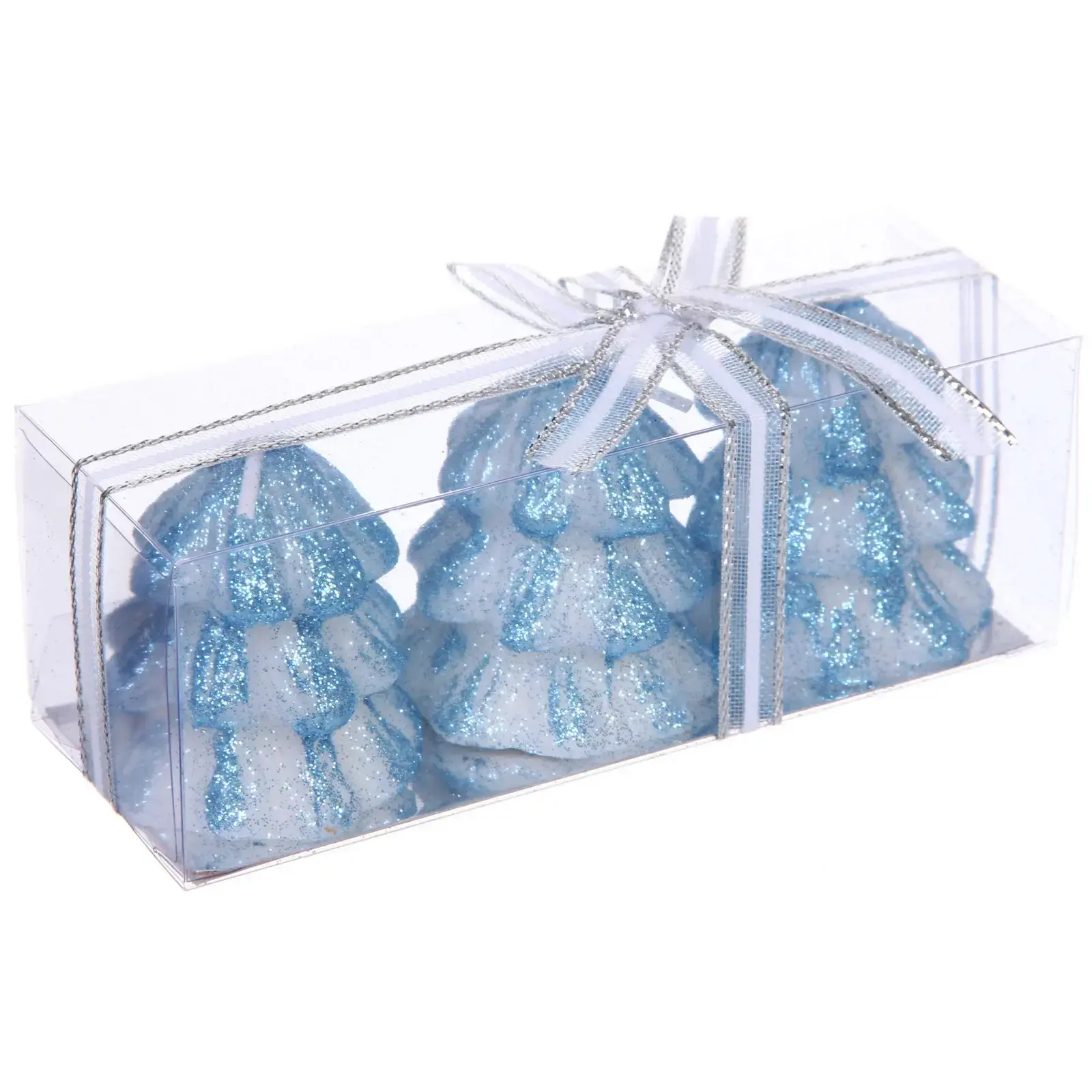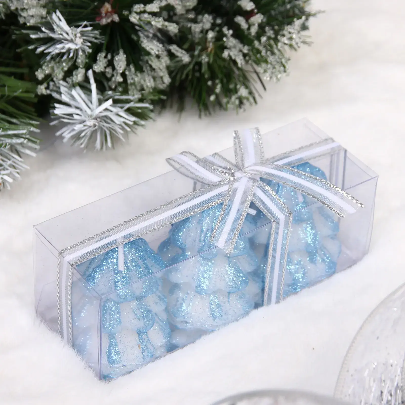 В наборе вы получите три свечи, каждая из которых имеет уникальный дизайн, напоминающий новогодние ёлки. Упаковка выполнена из прозрачного материала, что позволяет видеть свечи с разных сторон. Праздничная лента добавляет изысканности и делает упаковку готовой к подарку.