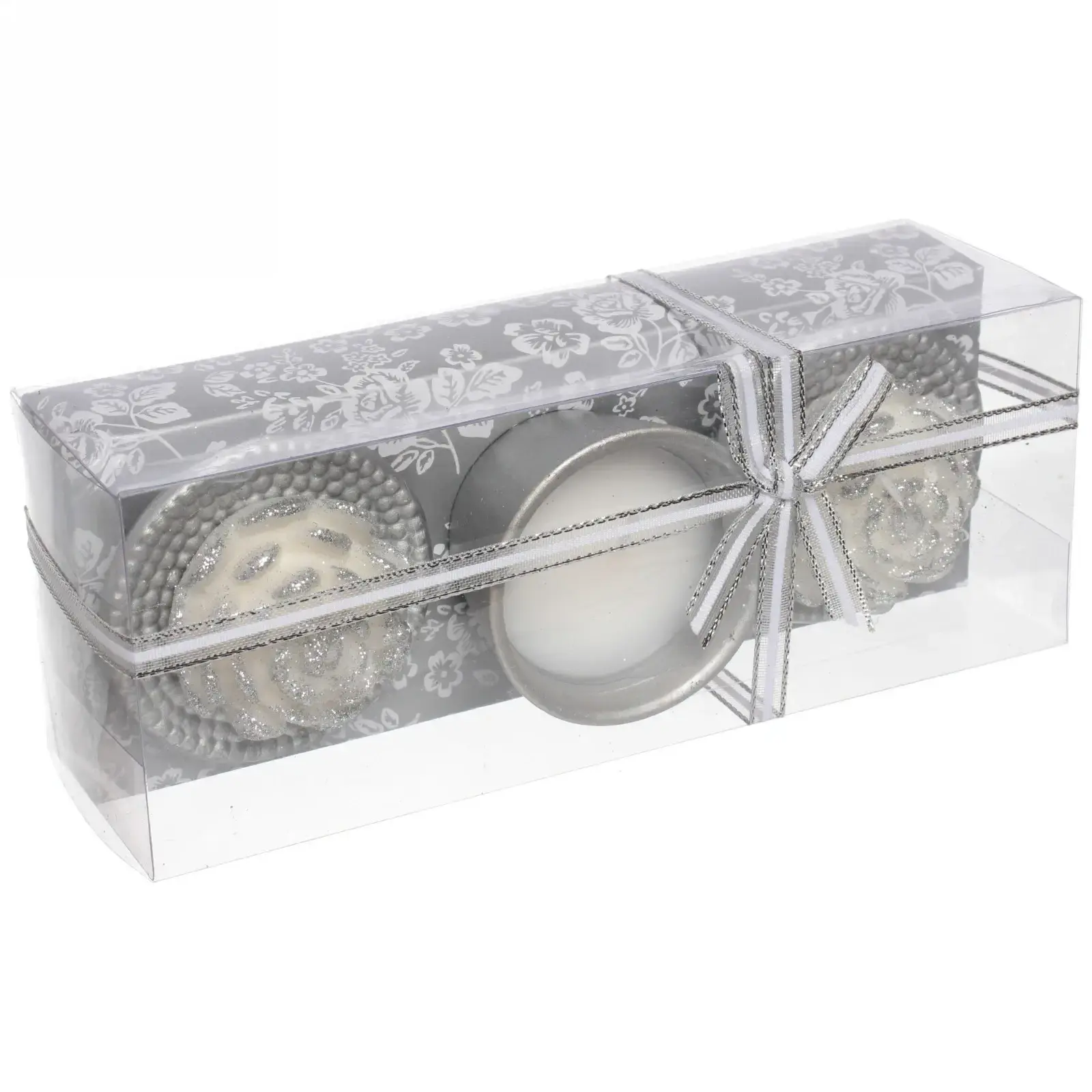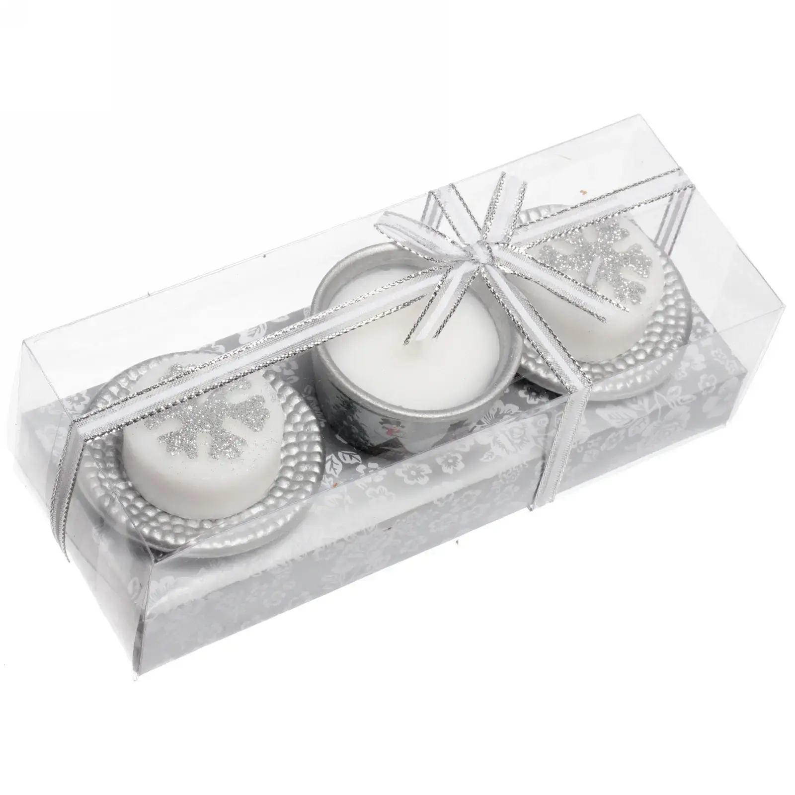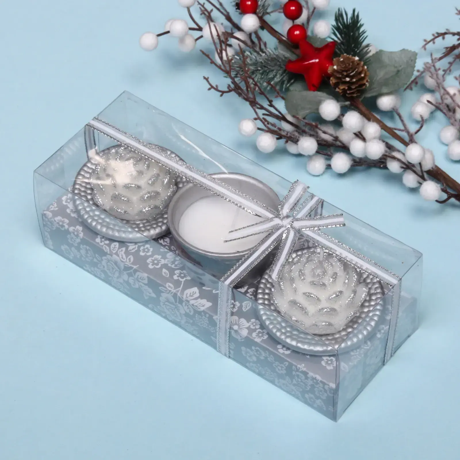 Комплектация включает три тематические свечи, каждая из которых имеет уникальный дизайн серебристых элементов. Металлический подсвечник в наборе выполняет двойную функцию: защищает поверхность от воска и служит стильным аксессуаром.