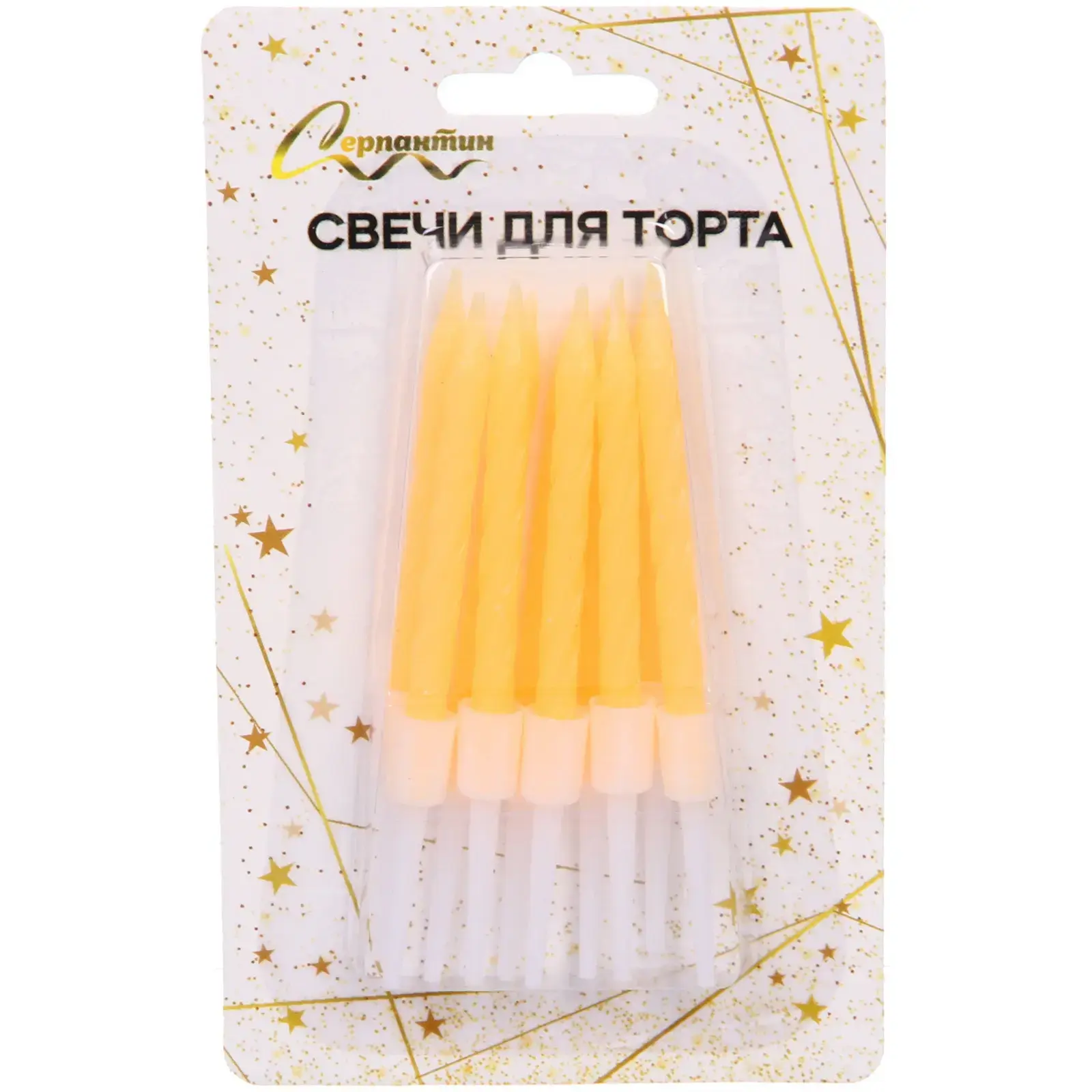 Каждая свеча имеет высоту 7.5 см и выполнена в оранжевом цвете. Упаковка украшена золотыми звездами и предназначена для удобного хранения. Не забудьте следовать инструкциям по безопасности, указанным на упаковке, чтобы ваш праздник прошел без происшествий.