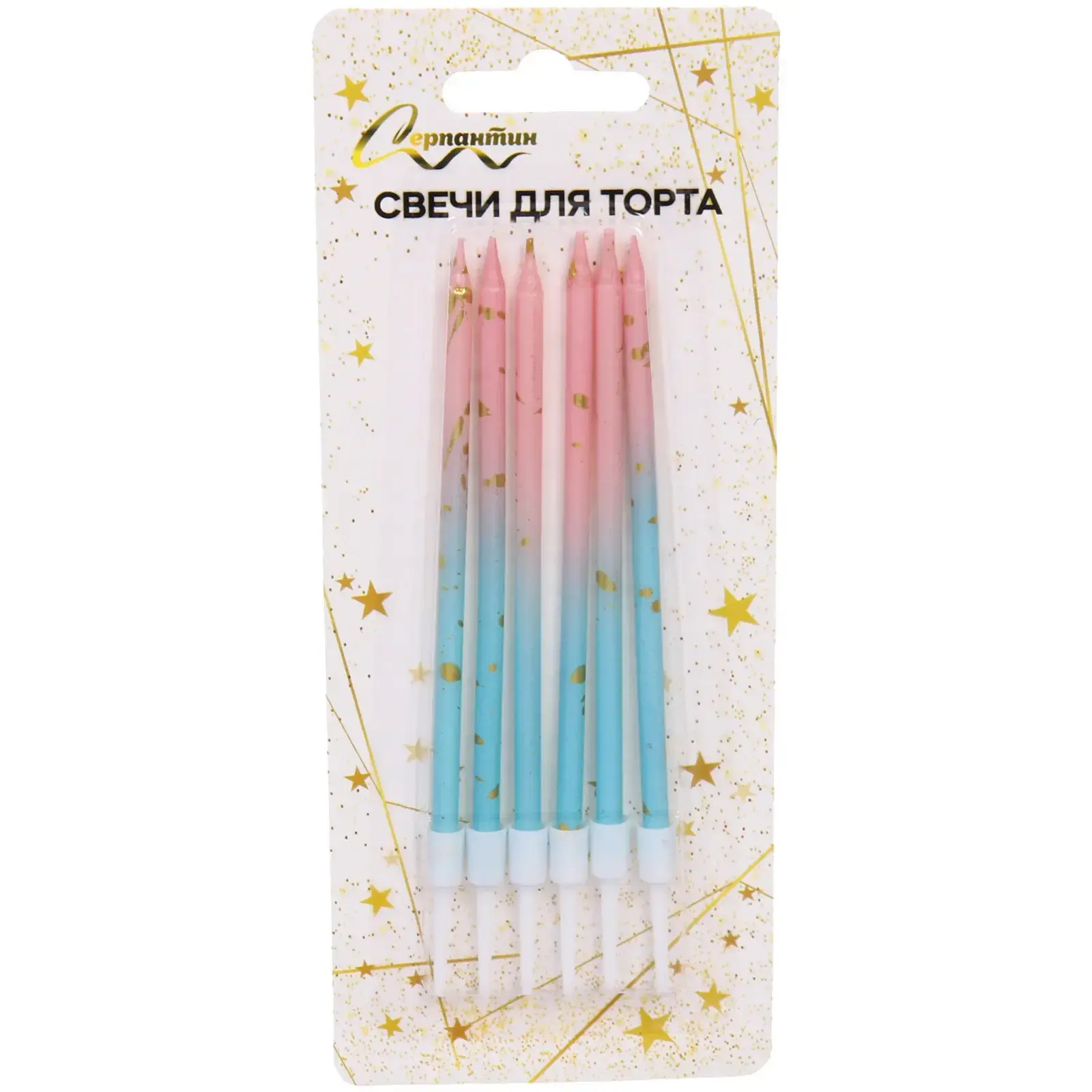 Свечи для торта «Северное сияние» — это идеальный выбор для вашего торжества. Они не только добавят ярких красок, но и создадут волшебное настроение. Эти свечи с градиентным переходом от розового к голубому и золотистыми узорами станут настоящим украшением любого десерта.
