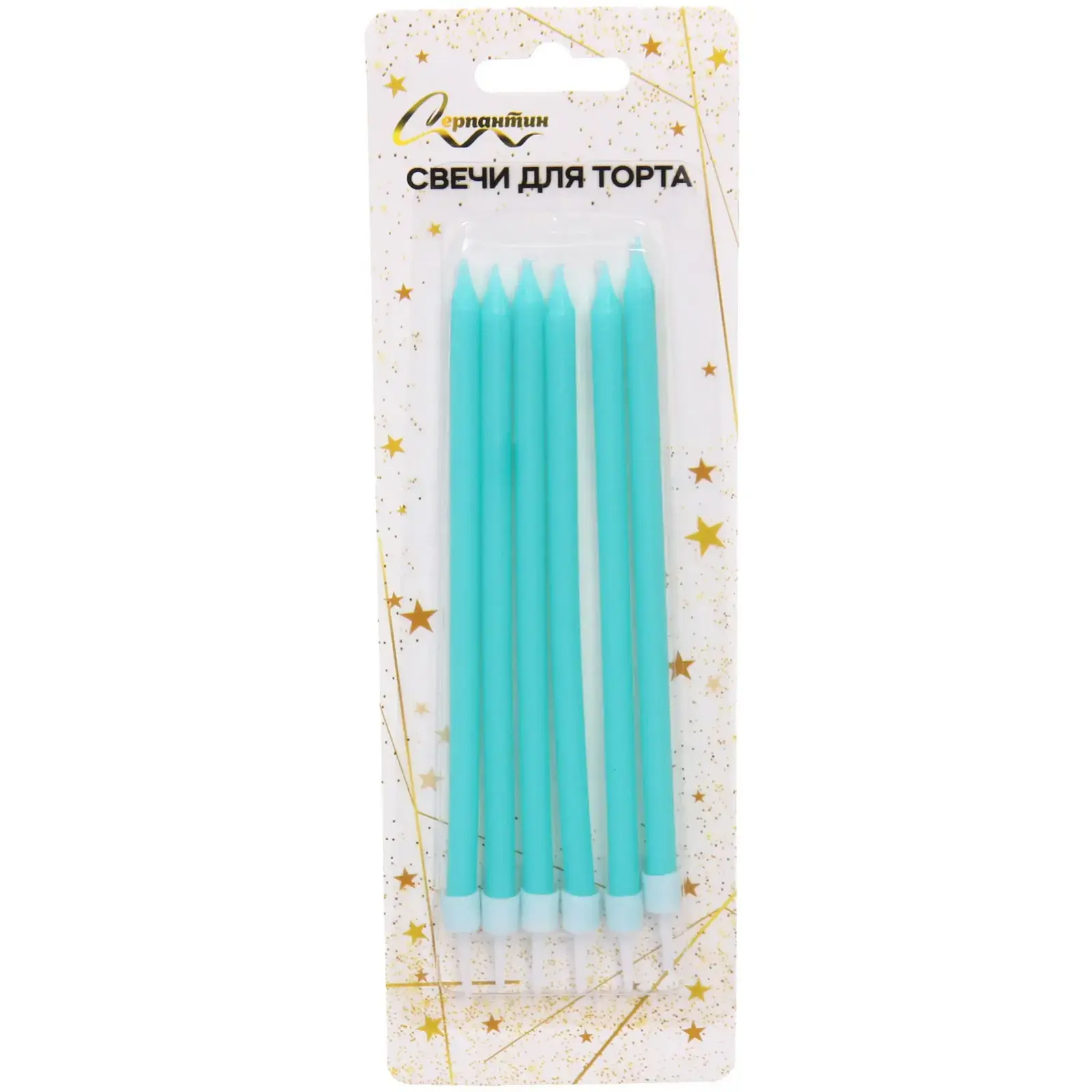 Свечи имеют стандартный размер 13 см и поставляются в упаковке по 6 штук. Они идеально подходят для украшения тортов на дни рождения, юбилеи и другие важные события. Лазурный цвет с белыми кончиками добавляет изысканности и стиля, а цилиндрическая форма с заостренными верхами делает их удобными для установки.