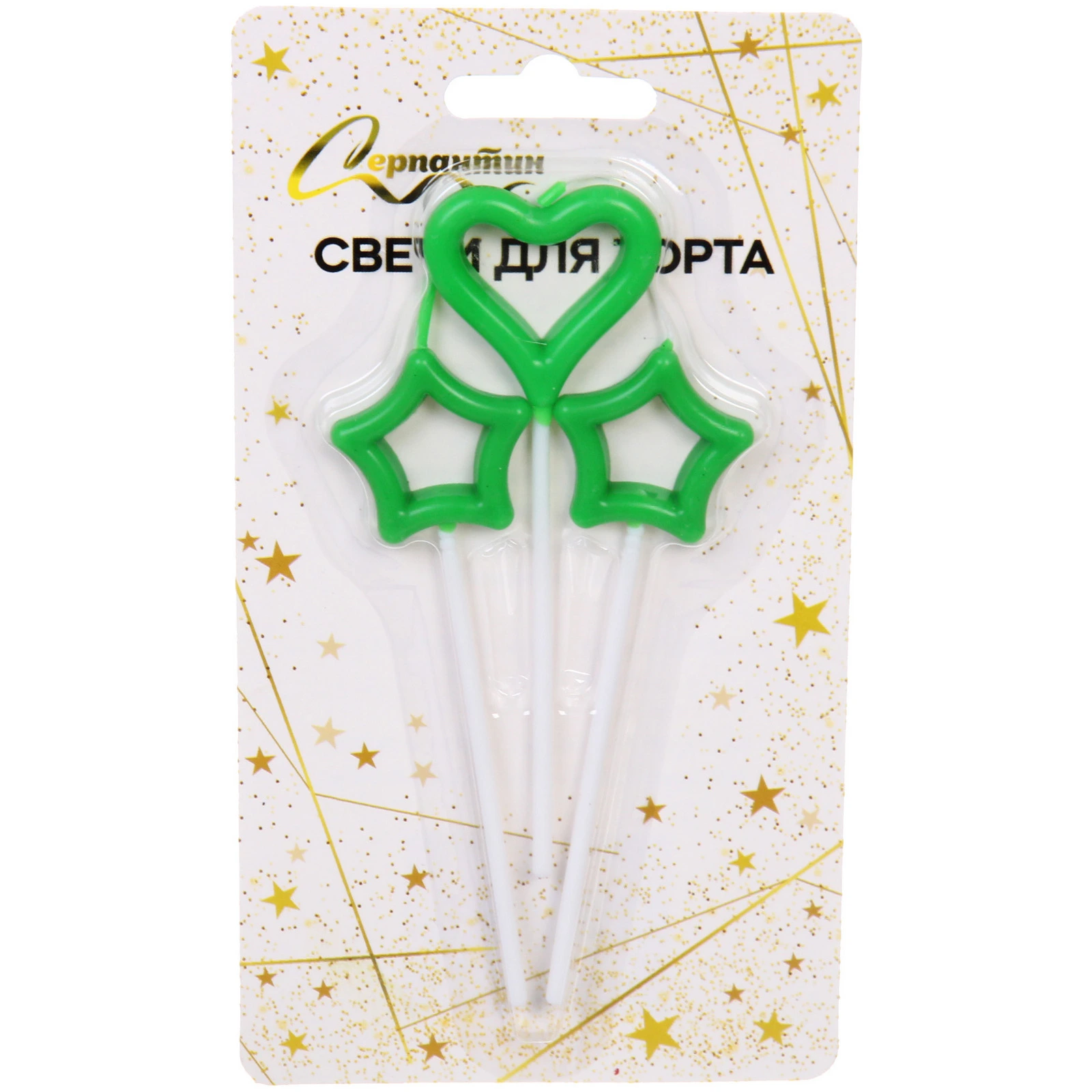 В упаковке вы найдете три свечи длиной 10 см, выполненные из качественного парафина. Они имеют яркий зеленый цвет и оформлены в виде сердечка и звезды, что делает их универсальными для различных тематик праздников. Упаковка украшена золотыми звездами, что добавляет ей праздничного настроения.