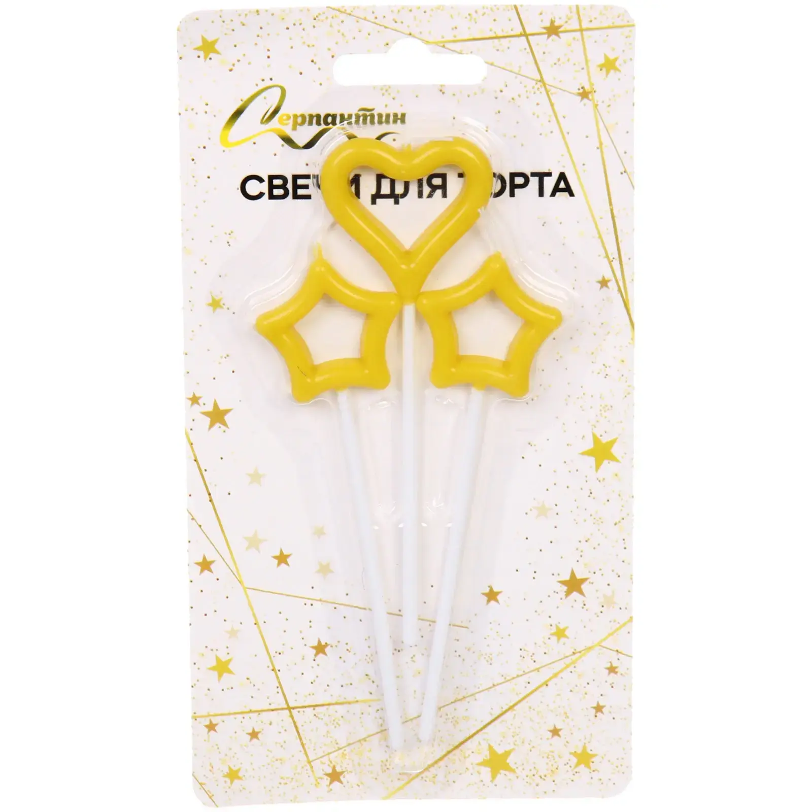 В комплект входят три свечи: две в форме звезды и одна в форме сердца, каждая длиной 10 см. Они установлены на белых пластиковых подставках, что делает их удобными в использовании. Не забывайте о безопасности: никогда не оставляйте зажженную свечу без присмотра и используйте только в присутствии взрослых.