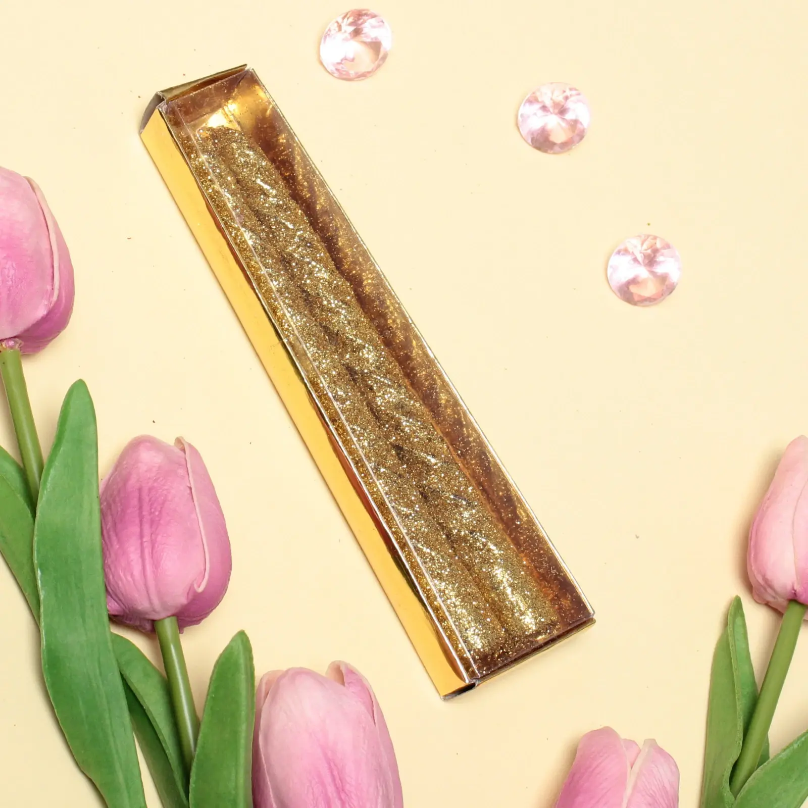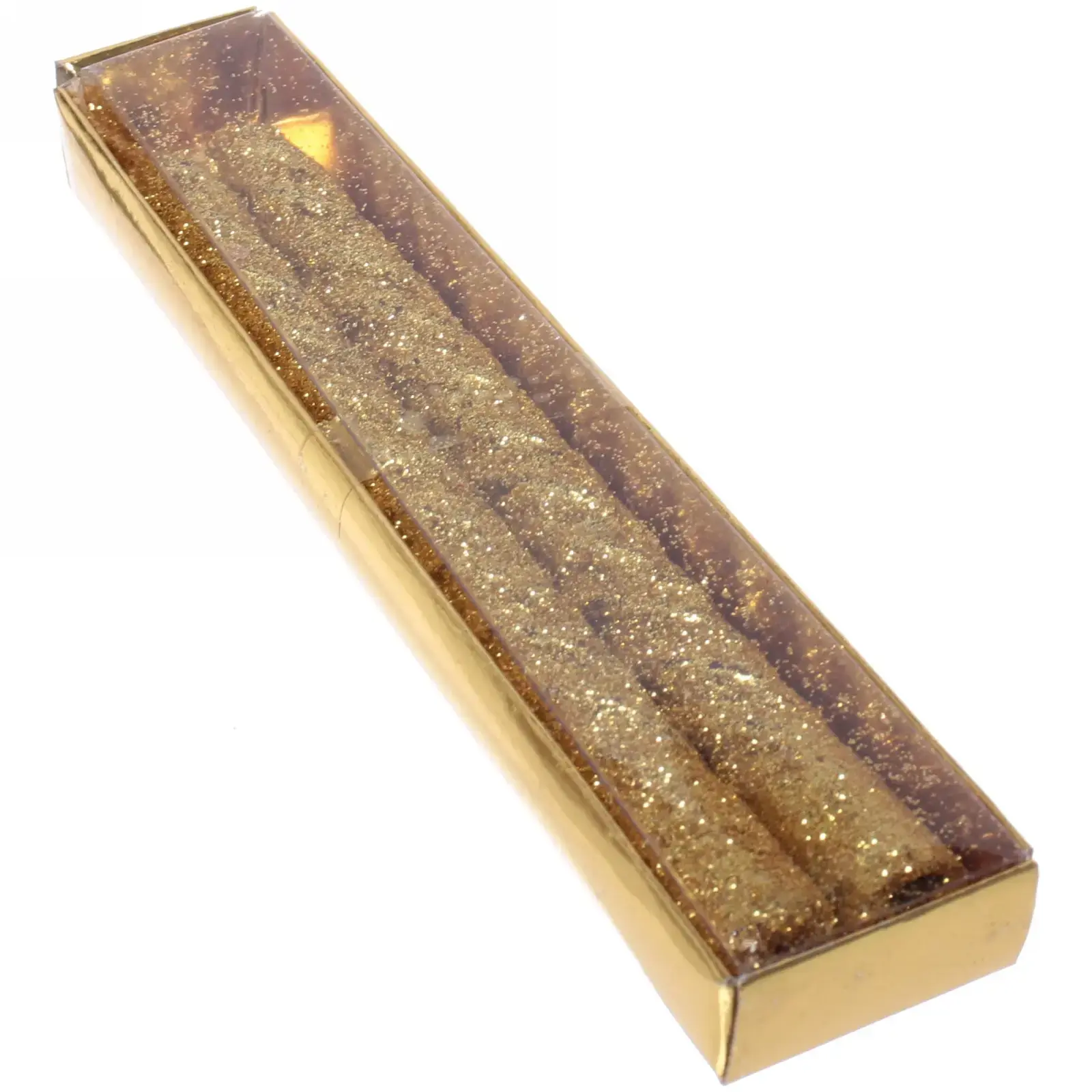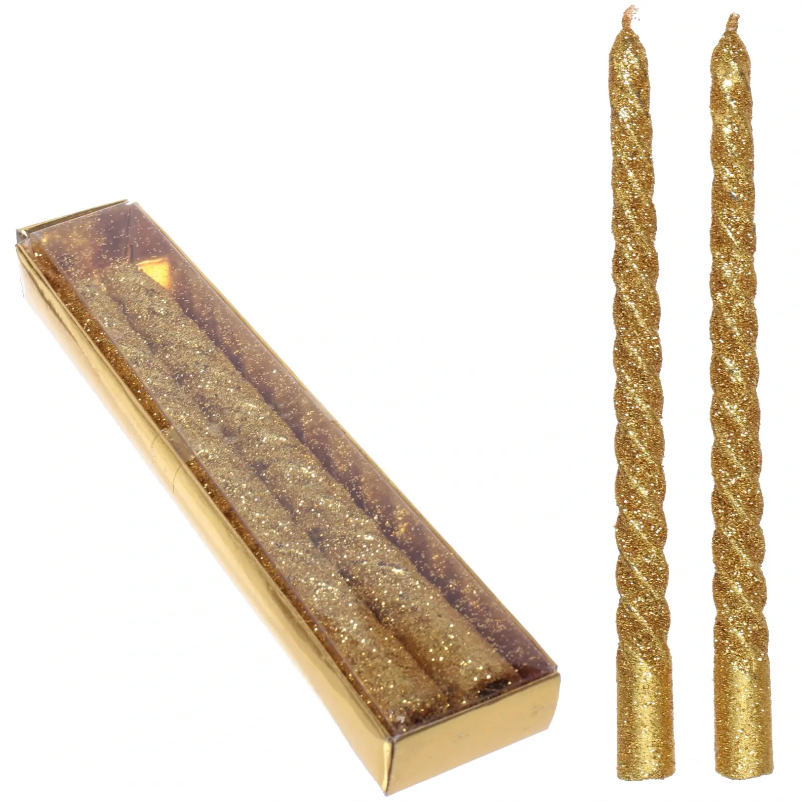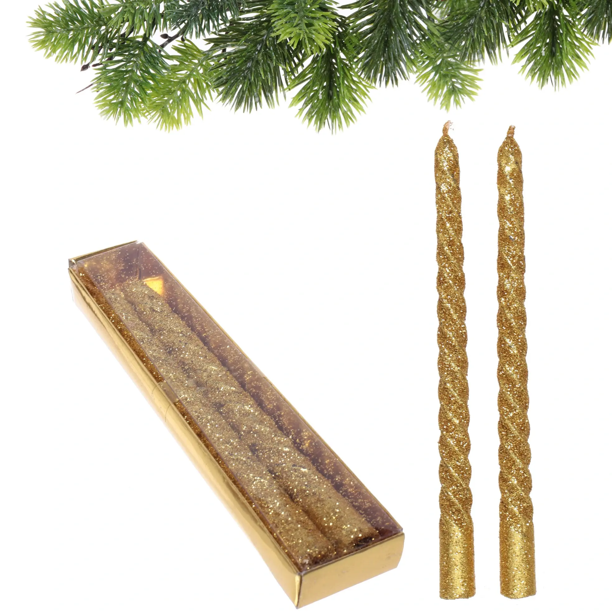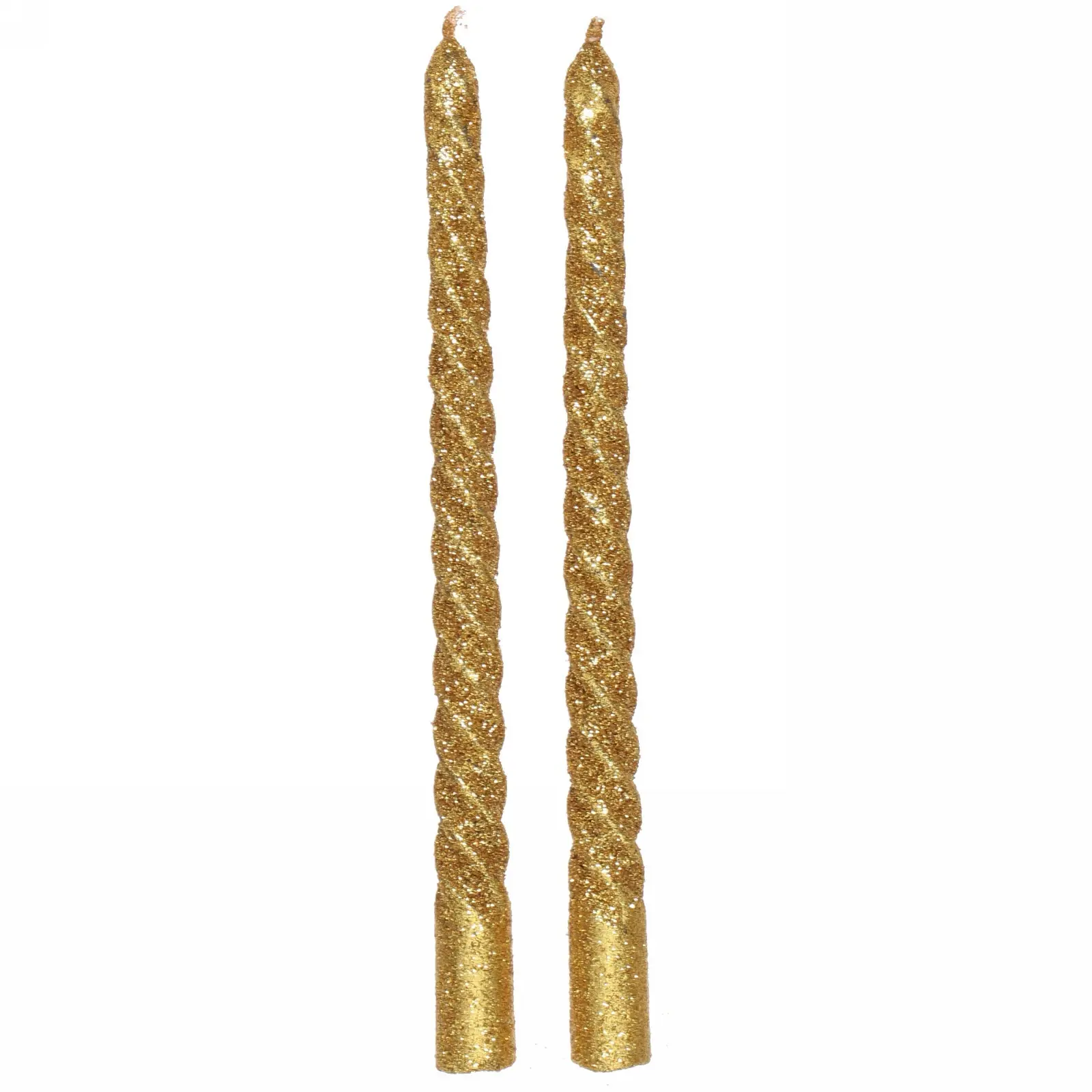 В комплект входит 2 золотых свечи диаметром примерно 2 см и длиной 15 см, выполненные с закрученным рельефным узором и покрытые глиттером, что создает эффект мерцания и добавляет праздничной элегантности.