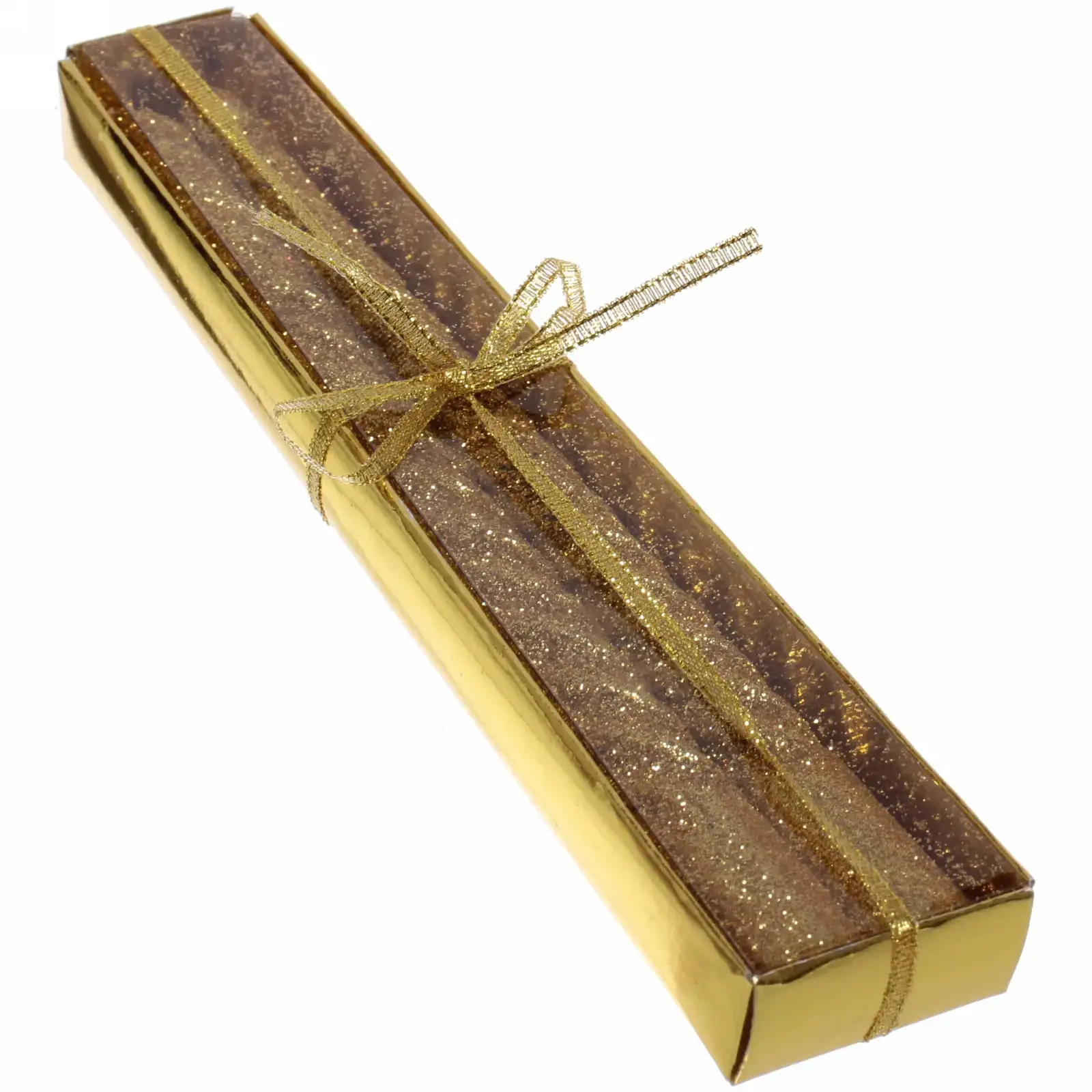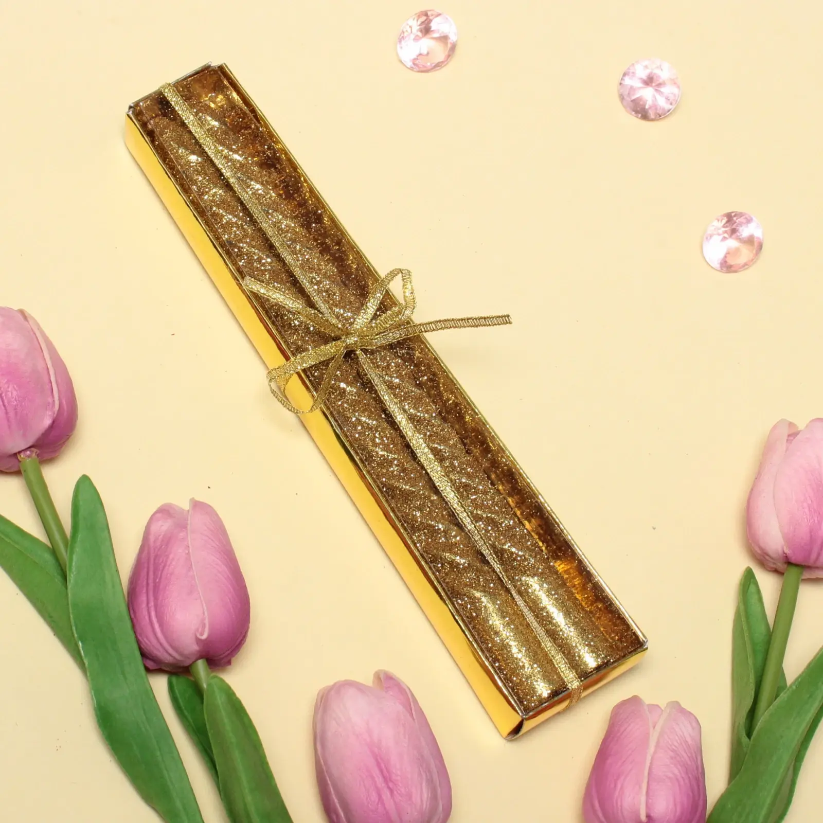Размер: 20 см вдоль; ширина 2,5–3 см. Вместимость: 2 свечи в подарочной золотой коробке с декоративным блестящим покрытием. Материал: цветной воск, безопасный для свечных соединищ и лёгкий в произвесении. Цвет: золотой с блеском, тщательно подобранный комплектом.