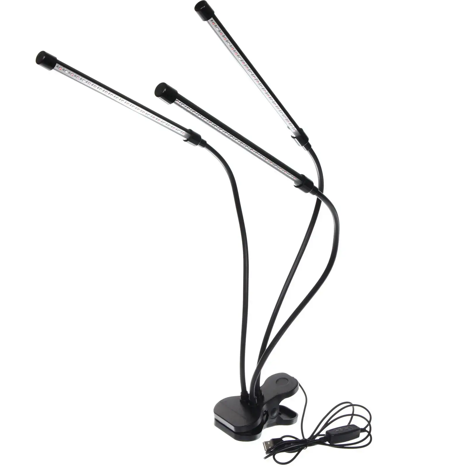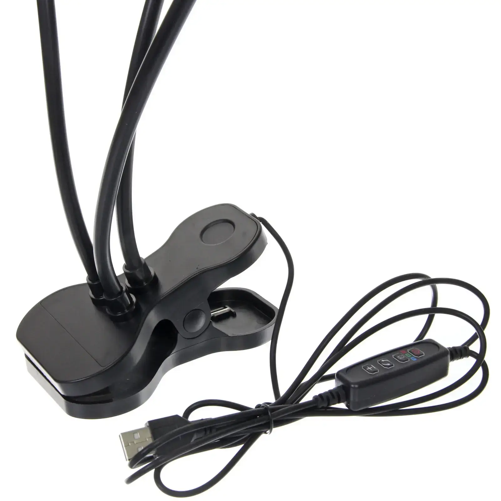 Светильник оснащен тремя гибкими лампами, которые можно регулировать по направлению, что позволяет направить свет именно туда, где он нужен. Устройство идеально подходит для использования как в домашних условиях, так и в теплицах. Питание осуществляется через USB-кабель, что делает его удобным в использовании и позволяет подключать к любому источнику питания.