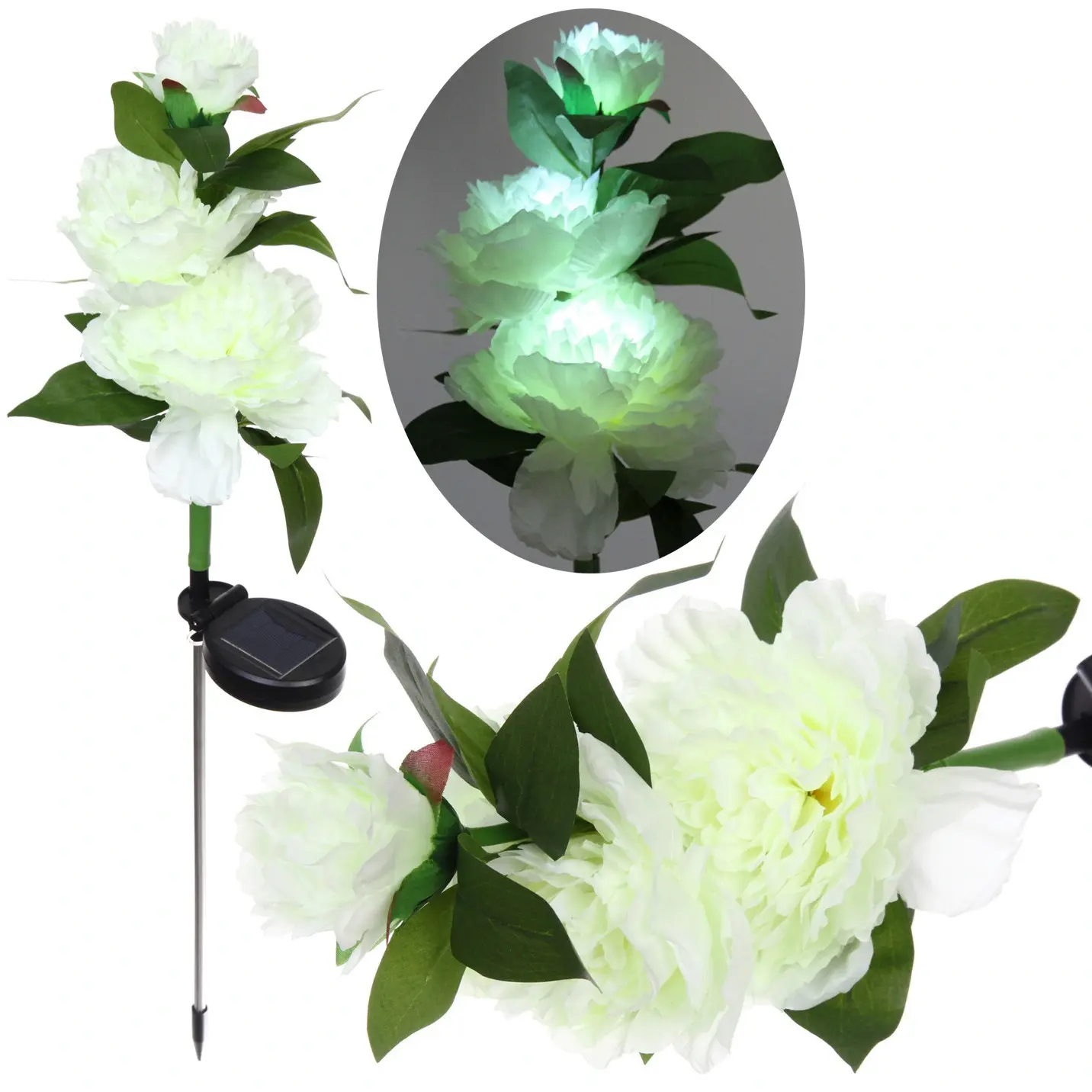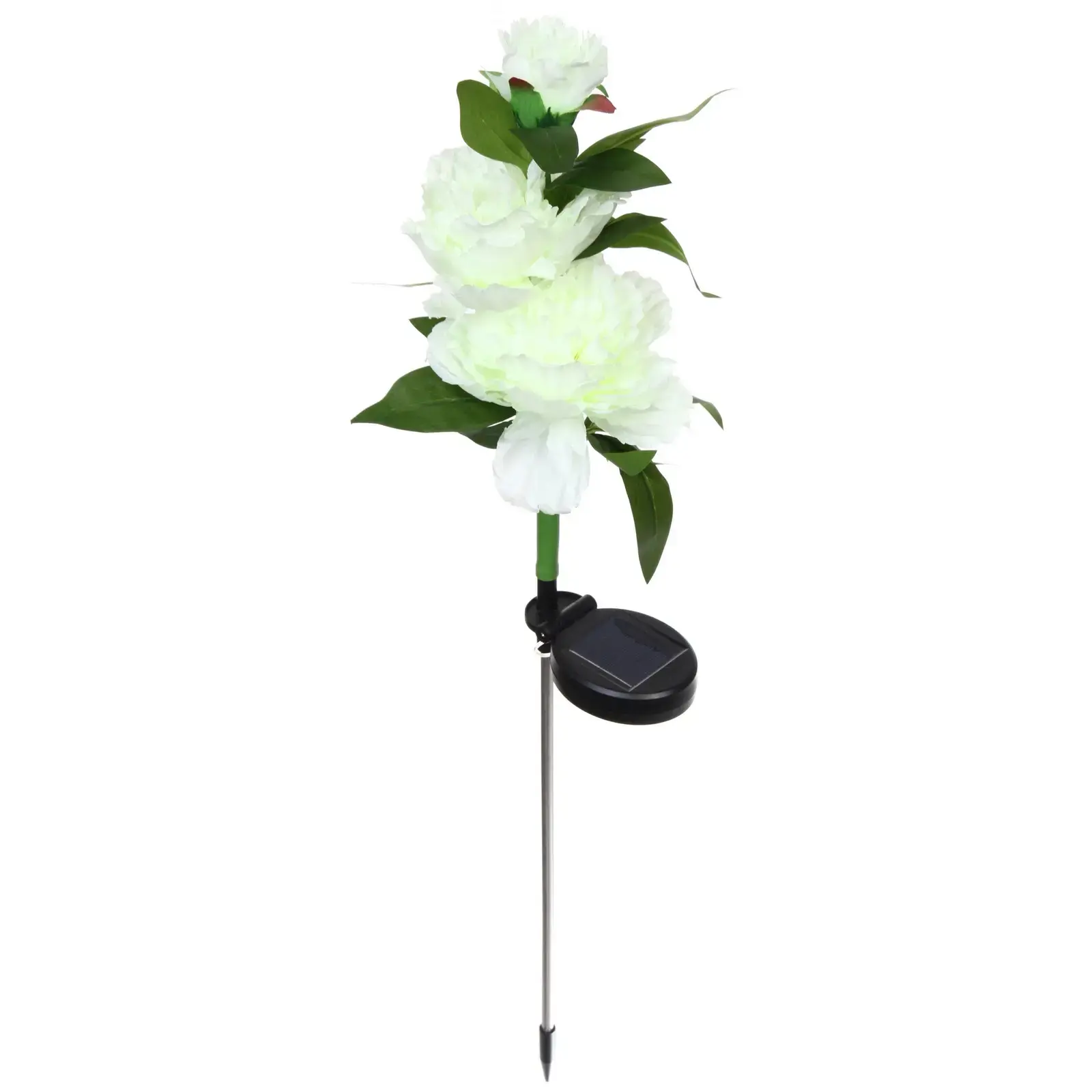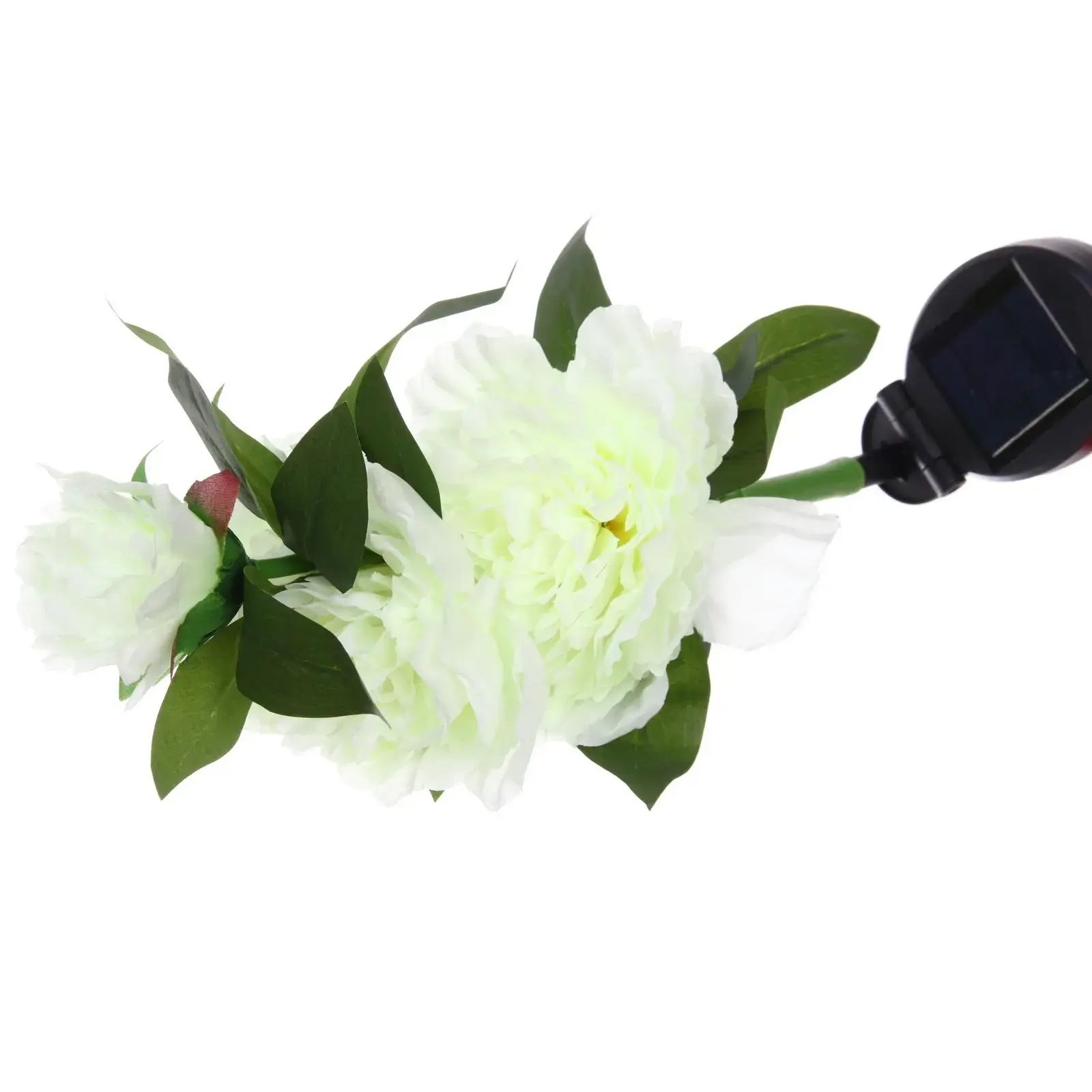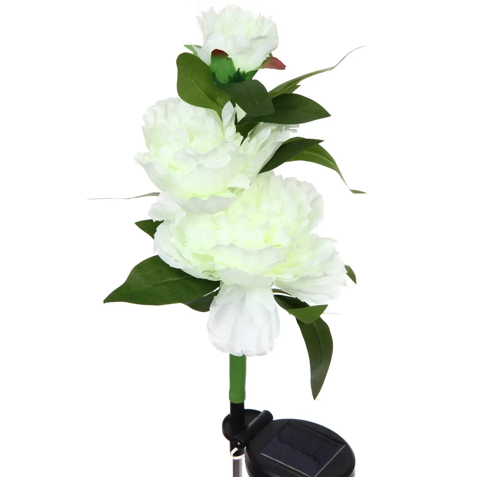 Высота светильника составляет 73 см, что делает его заметным элементом в вашем саду. Белый цвет цветка с легким зеленоватым оттенком придает ему естественный вид, а зеленые листья добавляют яркости. Солнечная панель, расположенная в основании, эффективно собирает солнечную энергию, обеспечивая длительное время работы светильника. Этот светильник станет отличным выбором для создания романтической атмосферы на вашем участке.