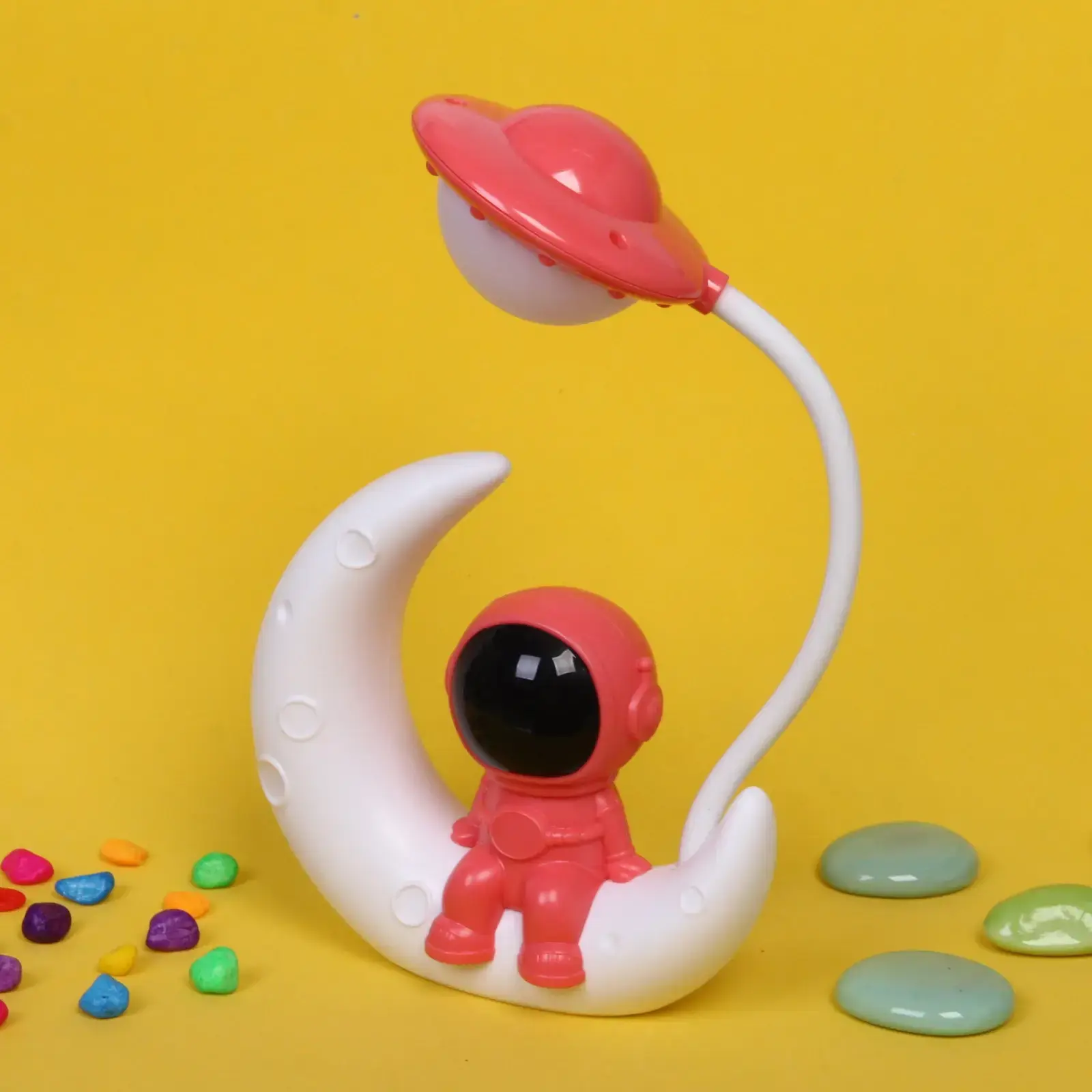 Фигурка космонавта и рельефная поверхность «луны» изготовлены из прочного пластика, устойчивого к царапинам. Двухцветное оформление в красно-белой гамме сочетается с любым интерьером. Безопасная светодиодная лампа не нагревается при длительной работе.
