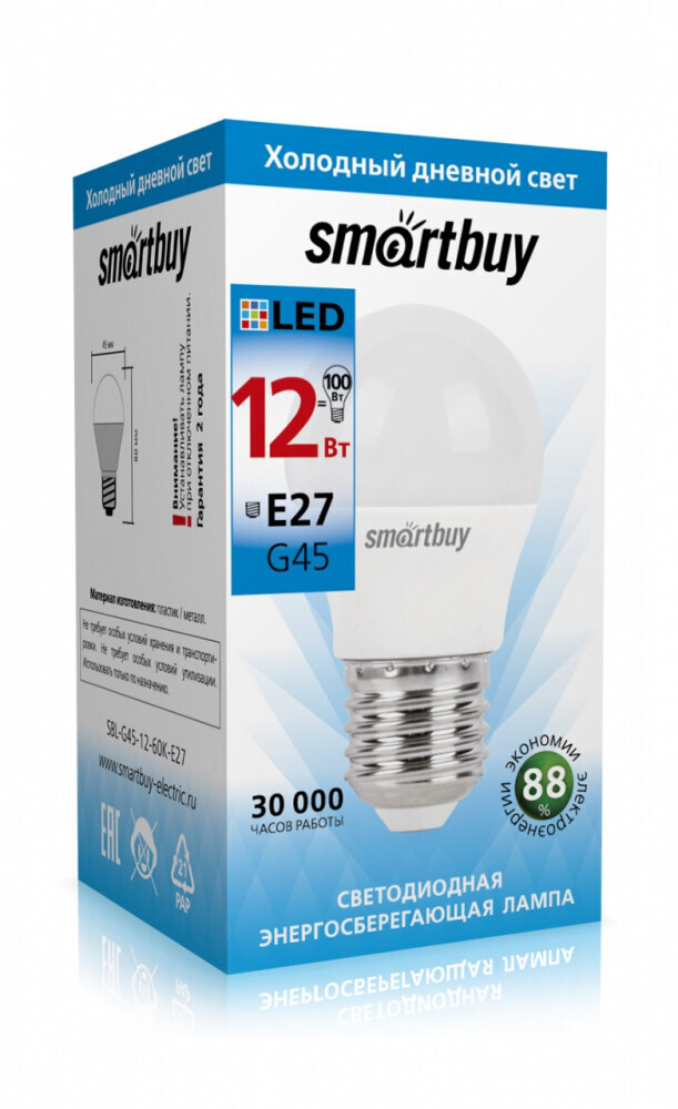 Светодиодная лампа Smartbuy G45, 12W, цоколь E27, холодный свет, срок службы 30000ч