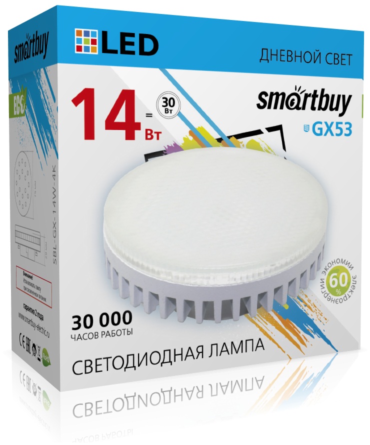 Светодиодная лампа GX53 Smartbuy 14W, 4000K, матовый рассеиватель, дневной свет, экономия 60%